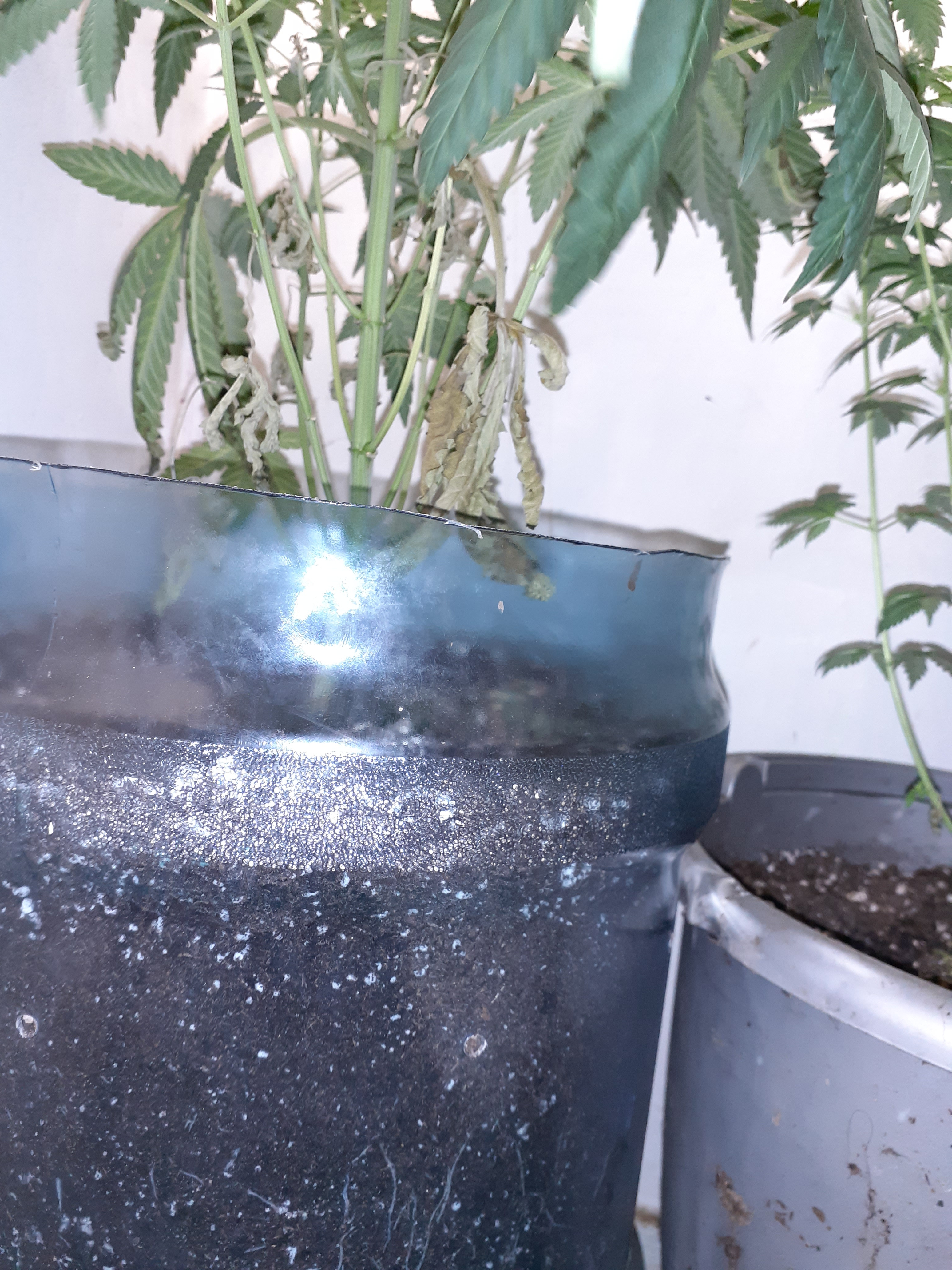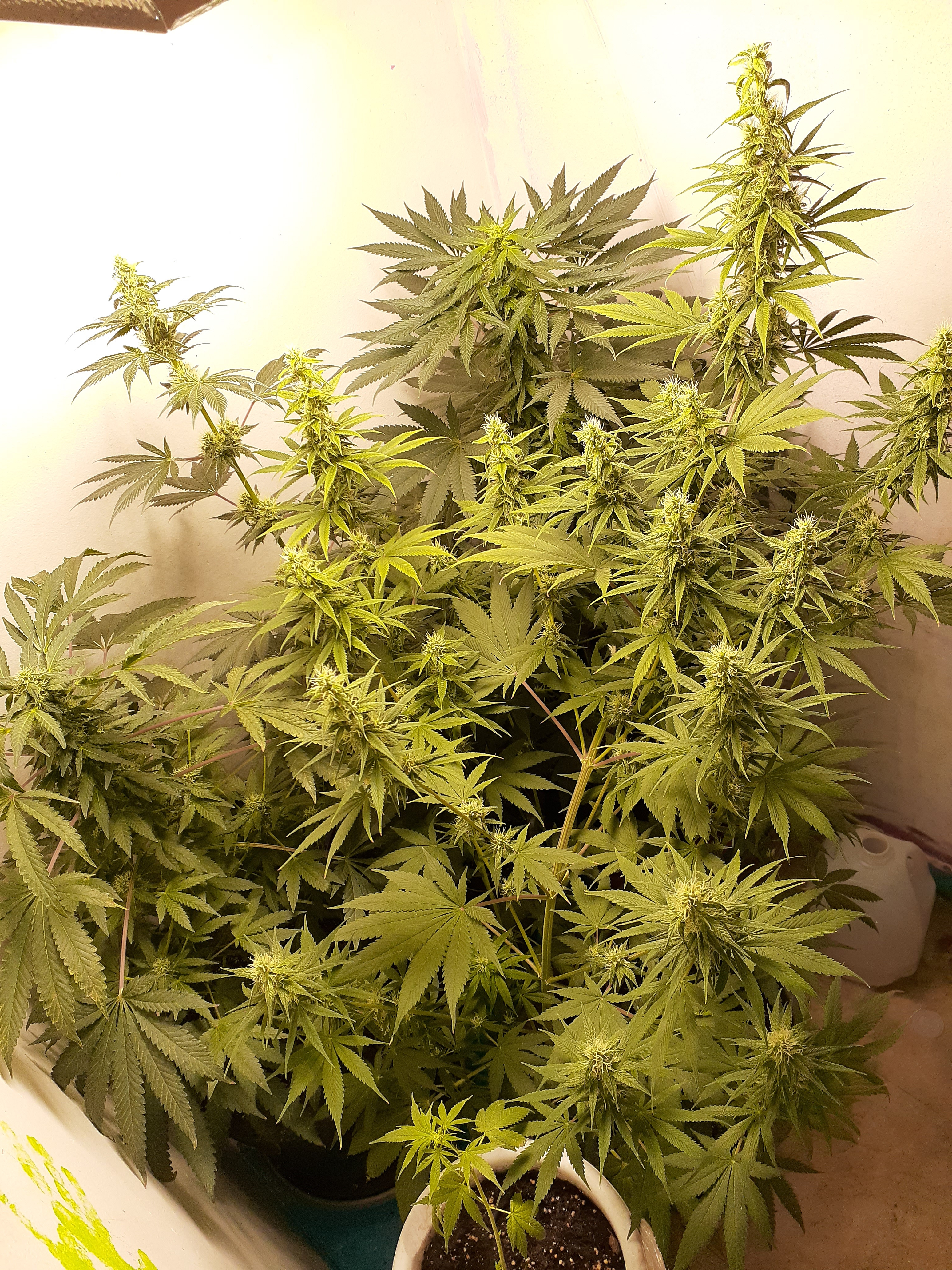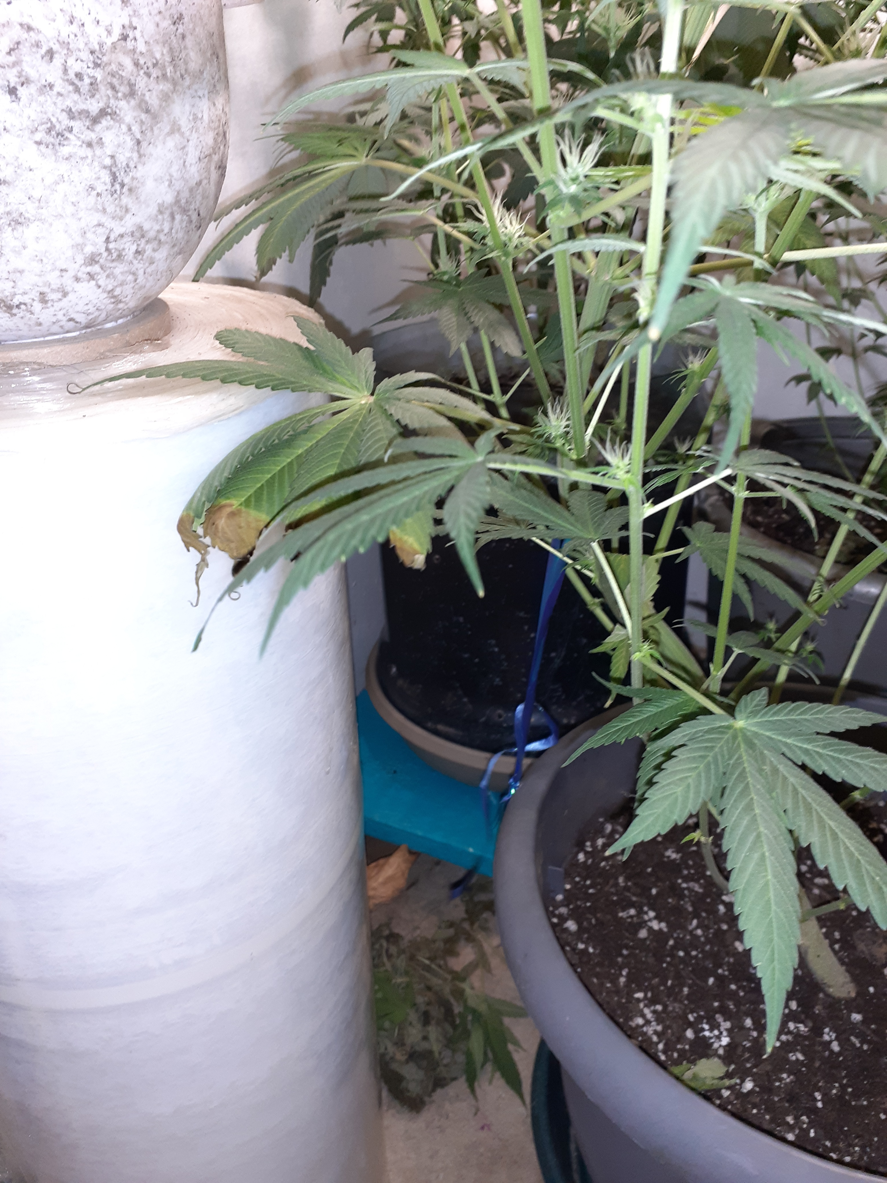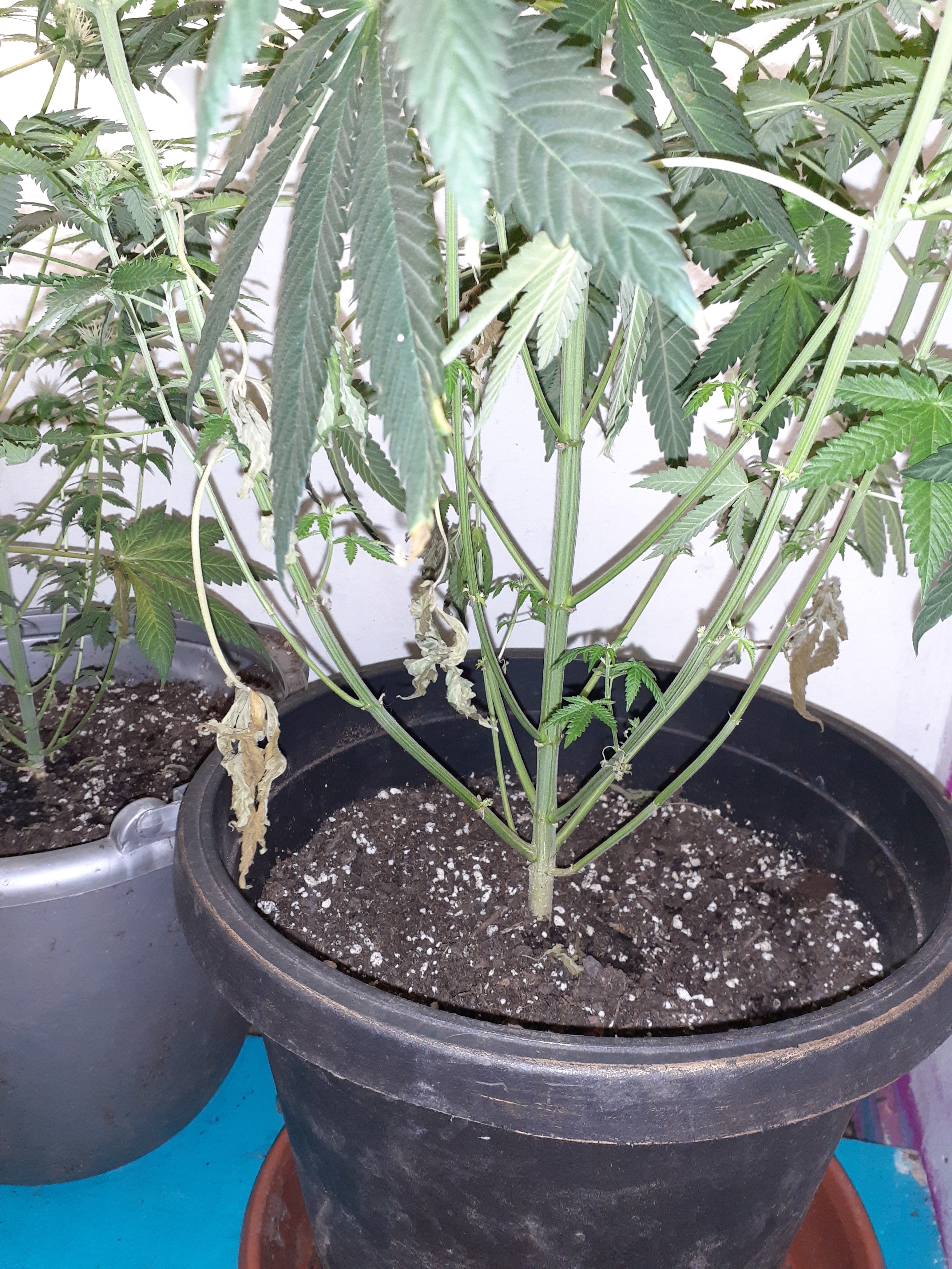 I posted awhile ago and have started to run into some new issues I'm starting to get later into flower from start of germination it's been 11 weeks. Unsure on strains exactly. I'm using a marshydro ts600 led light. Fox farms ocean blend soil with general hydro ponics 3 step solution nutes. Any pointers are appreciated. First pic will be of my bud sites. It looks good but underneath I'm starting to show some deficiencies. I know calmag is a need to get. Other than that I need some help with the dying leaves. The lifelessness that they have. Like they have no backbone or support in the leaves to the point they just fall right off. I lean to underwatering for that issue but dont want to over do it.