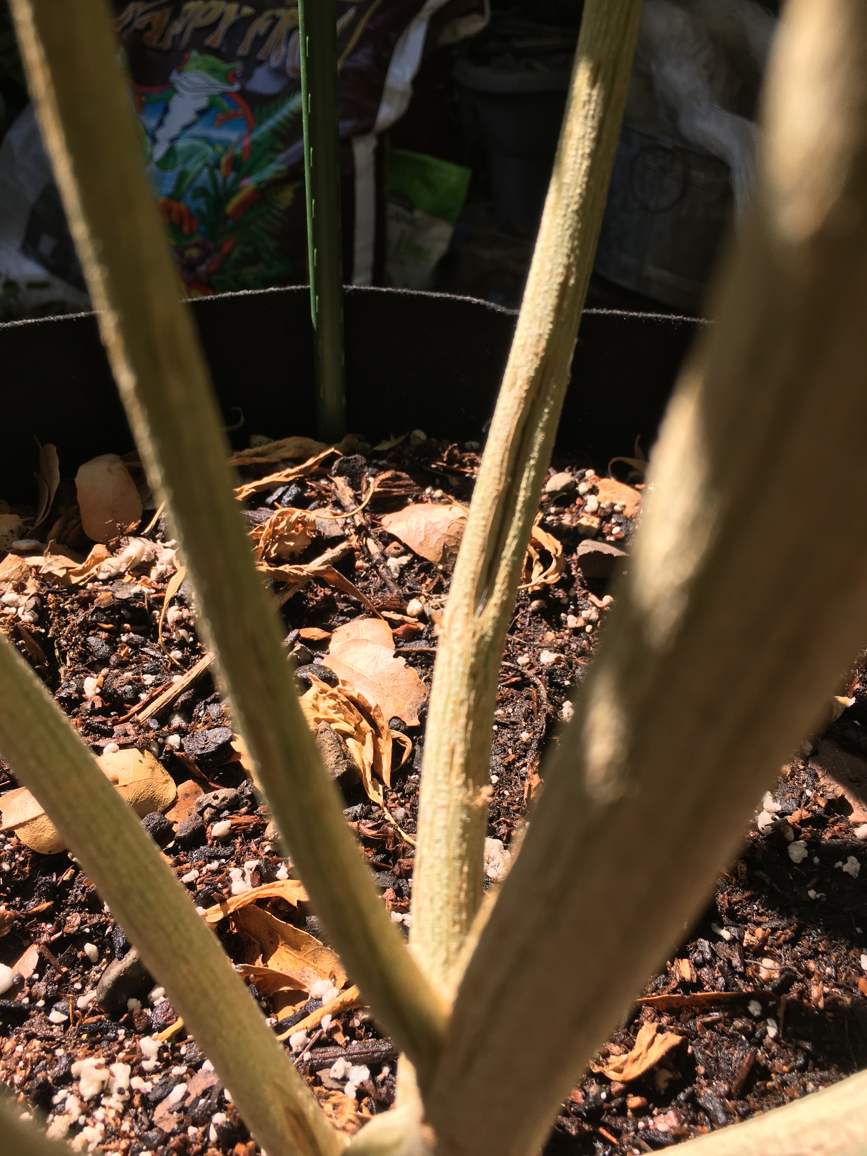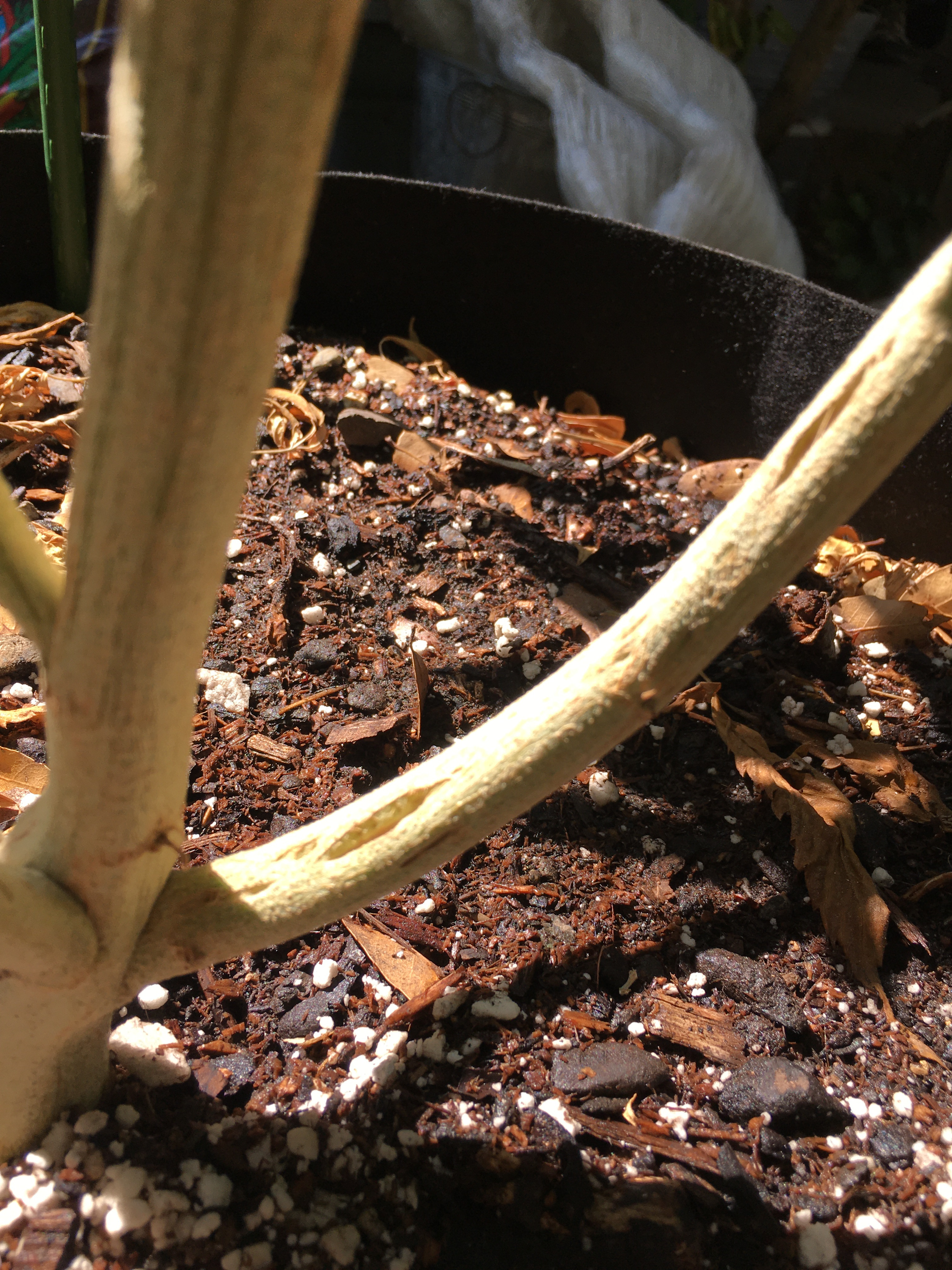 Outdoor grow, 20 gal smart pots, unusually hot summer in CA. Over a month into flower, platinum og clone has splits in lower stalks that just opened up. Noticed while inspecting after watering, could feel moisture coming out of the largest split. Water daily in the morning due to 100 degree temps. Feed 2x a week, gh flora nova bloom and floralicious, Cali magic every 2-3 weeks. Used grotek pro silicate during veg. 5 other plants on same regimen but different strains, no issues. Plant appears healthy but splits just started. Any ideas on what I’m dealing with or advice would be appreciated. She’s over a month from harvest and already super frosty so I don’t want to lose her.