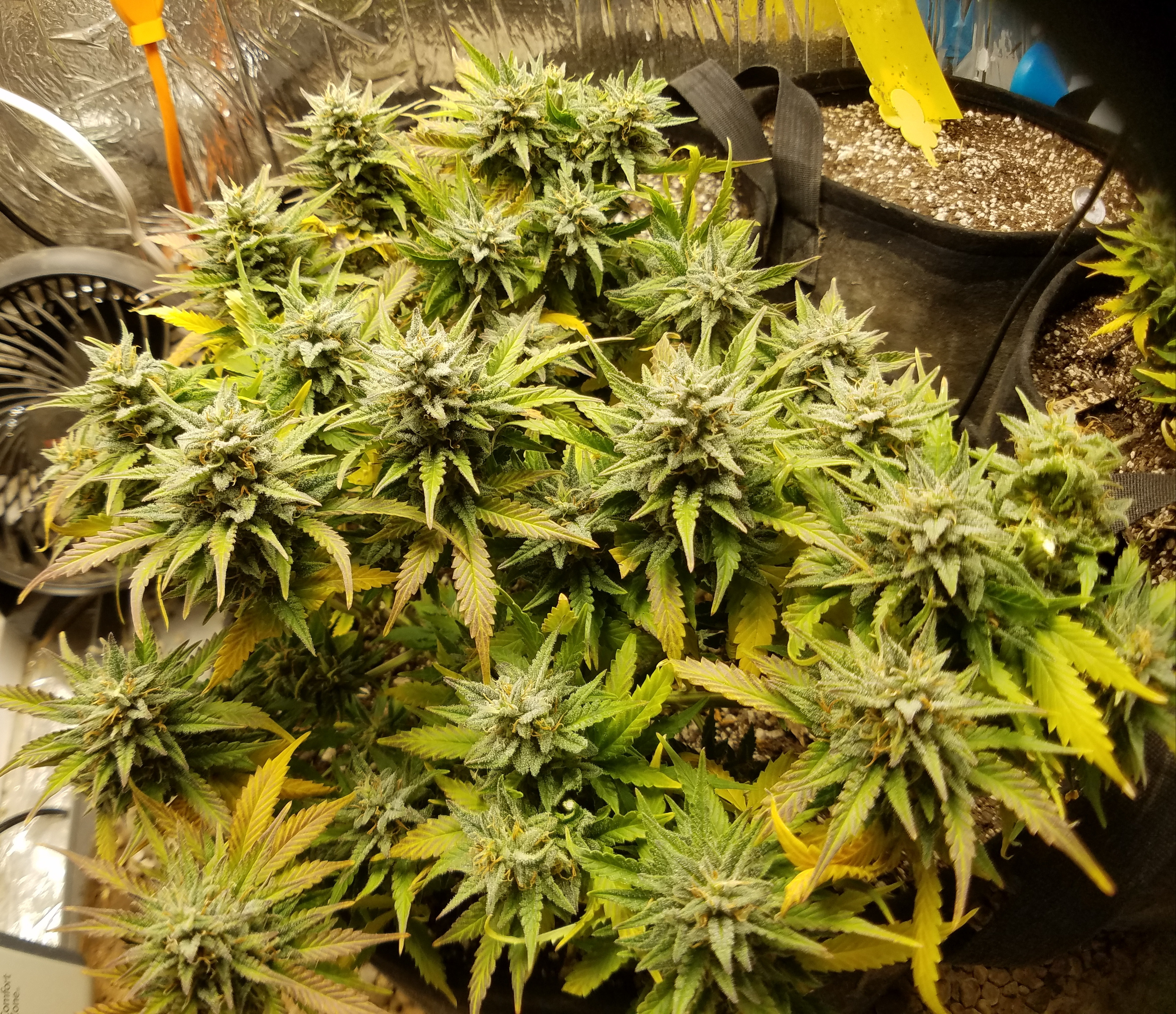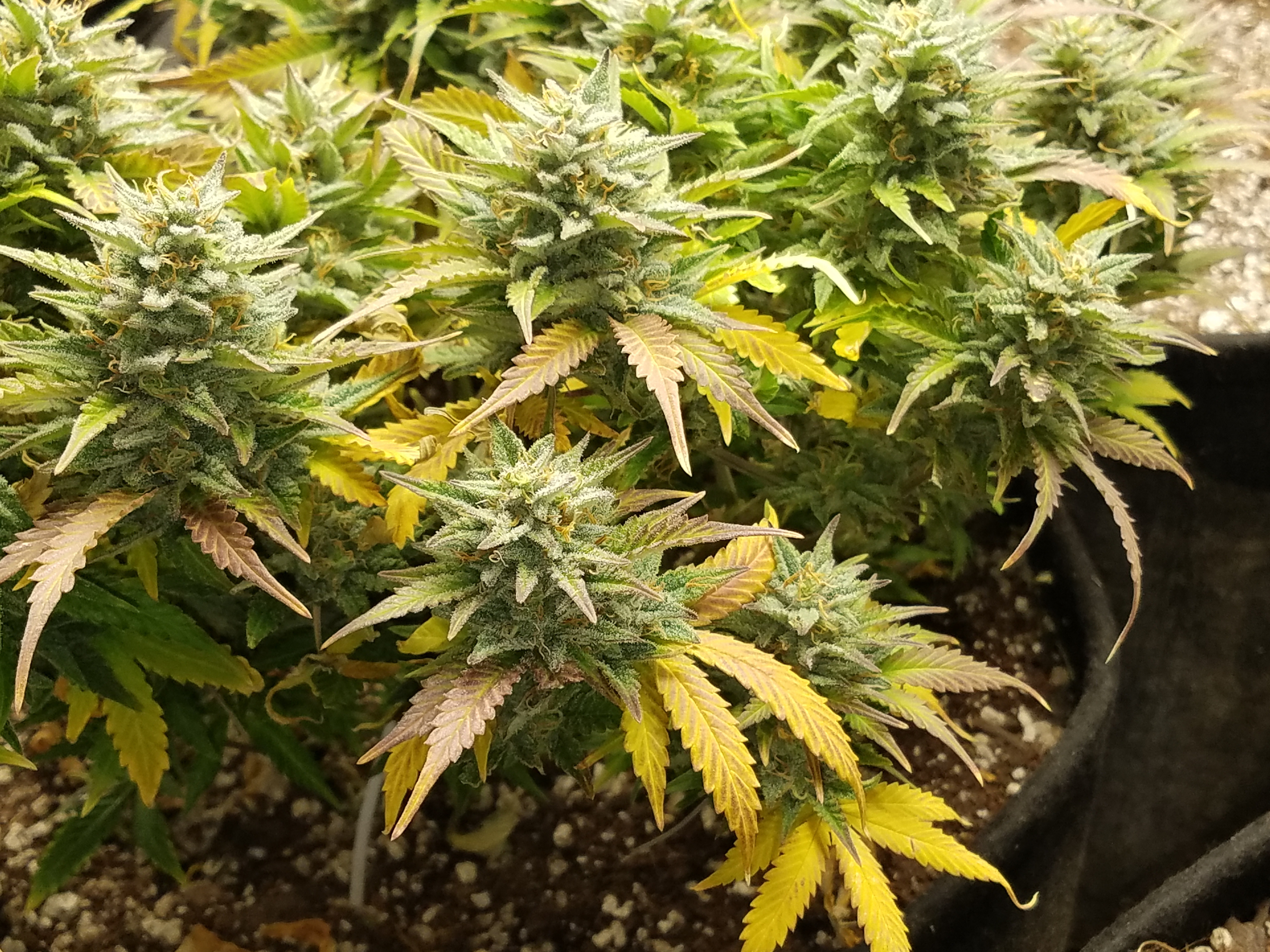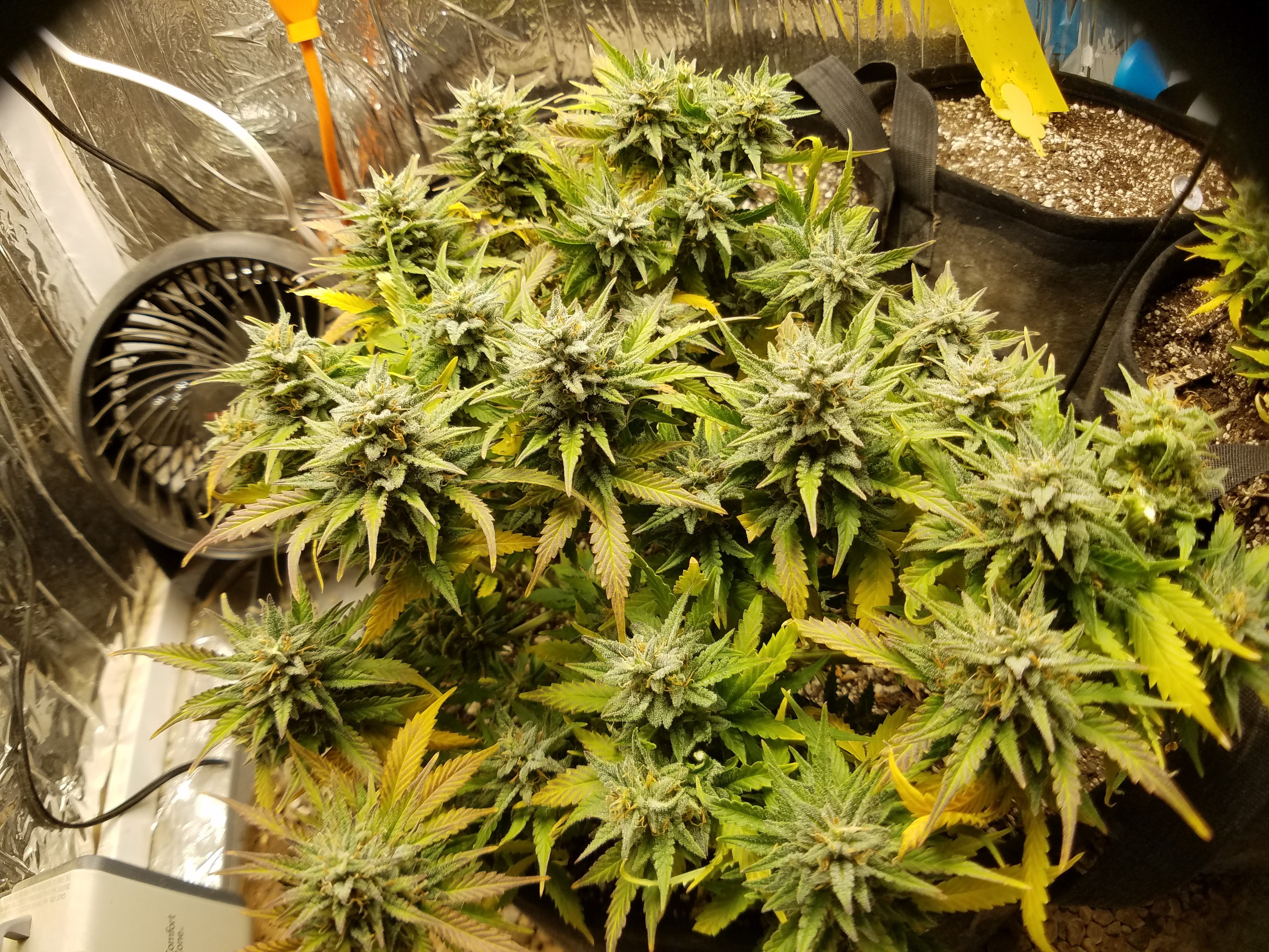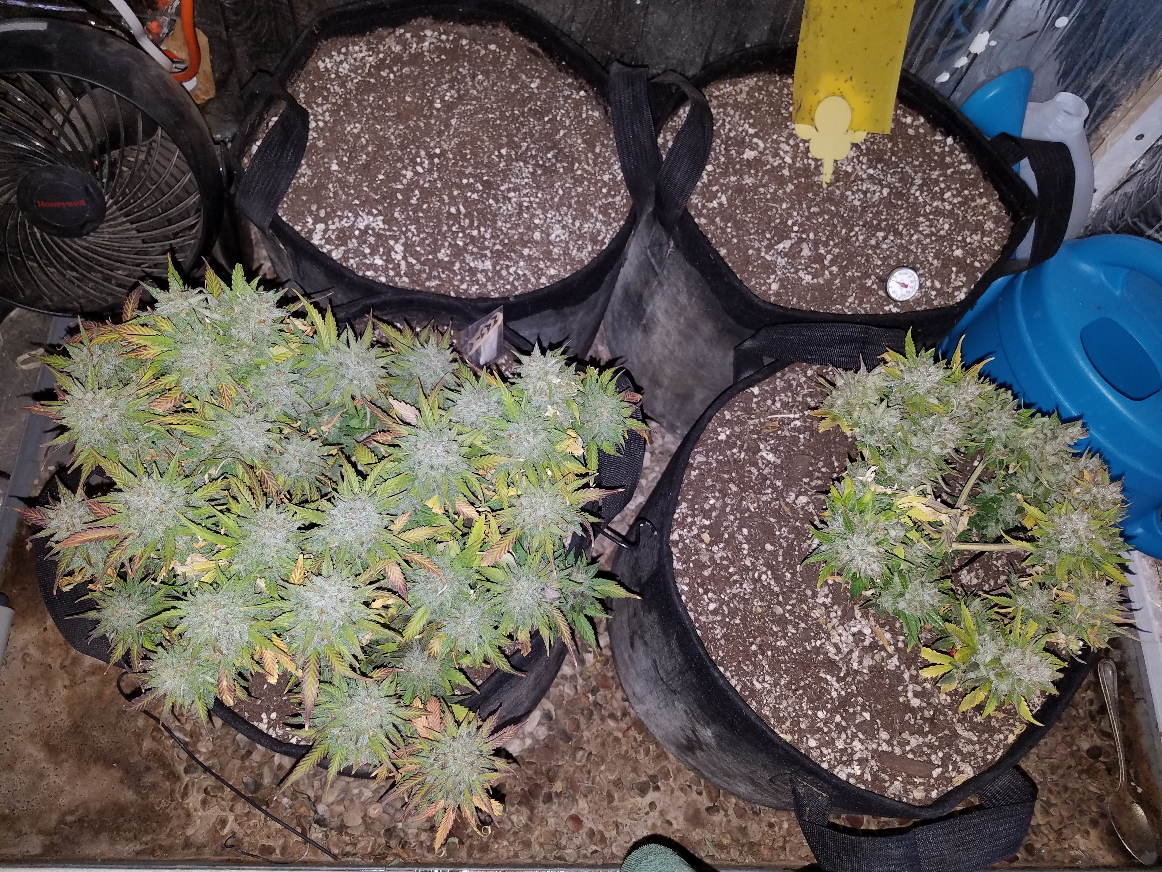 This is week 8 plus 2 days and finally an indication of plant aging in the lower fan leaves. Saw 1 two days ago now about 3 on each girl. Left lady stretched the most but her colas are spread so they are mostly bud clusters 1 inch to 3 inch dia. Right lady is more squat with 6 inch colas 3 inches in diameter at the butt. Kinda cone shaped. Mostly white pistils, just a little visible sugar and about 25% cloudy. my guess is 4 weeks yet but I don't really know autos but this is in line with what I read. Tallest colas are about 14 inches from dirt. SEven inches in 10 days.I'm looking or cloudy with just a few amber. If I get shimmering, flowing colors in my head they will be just right!