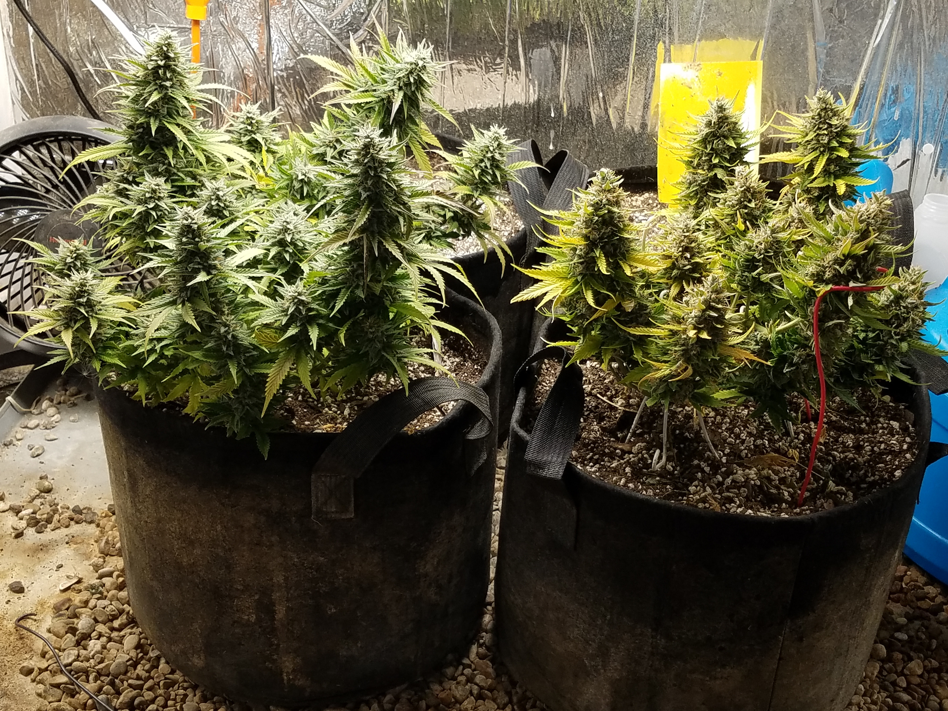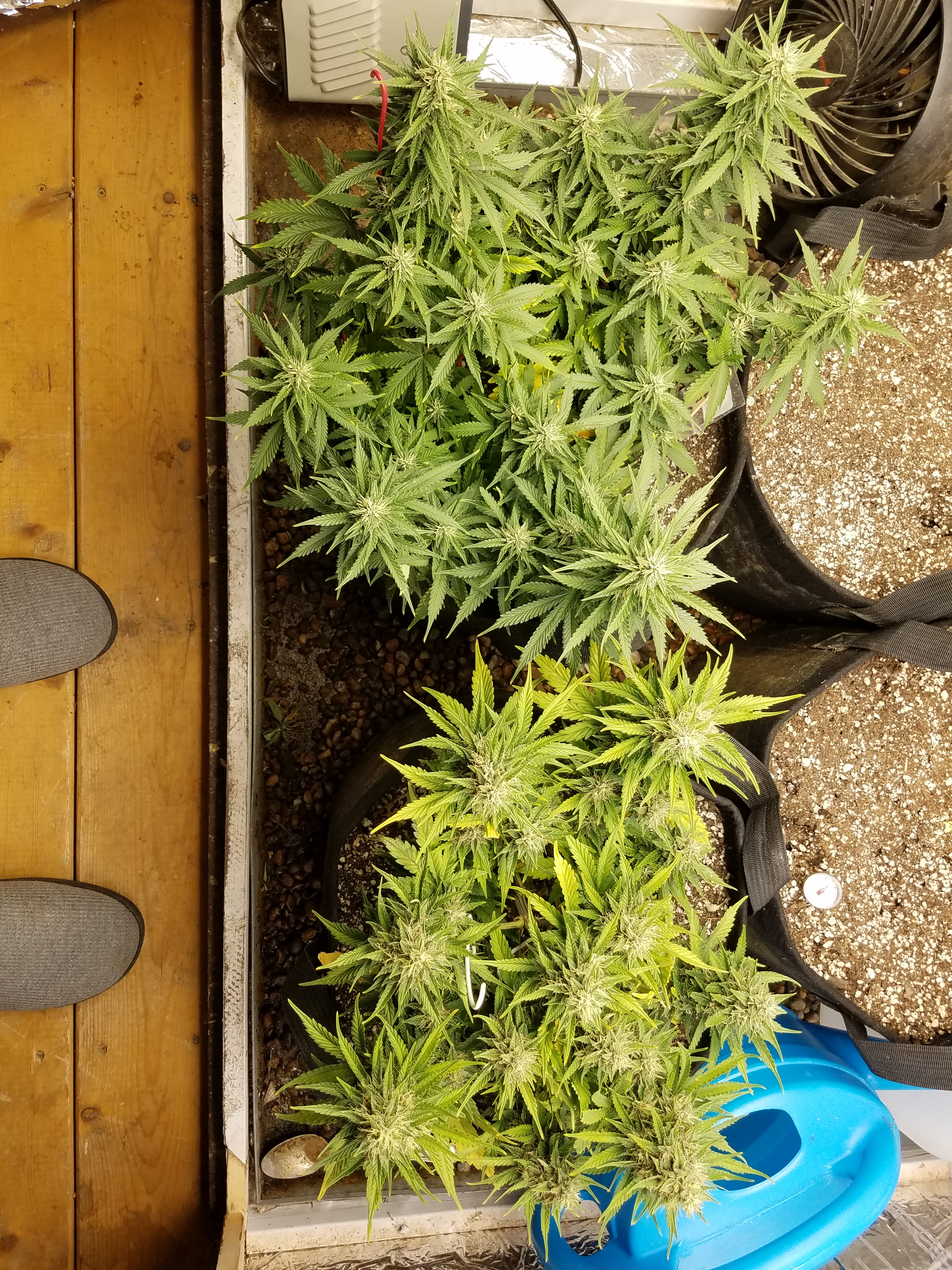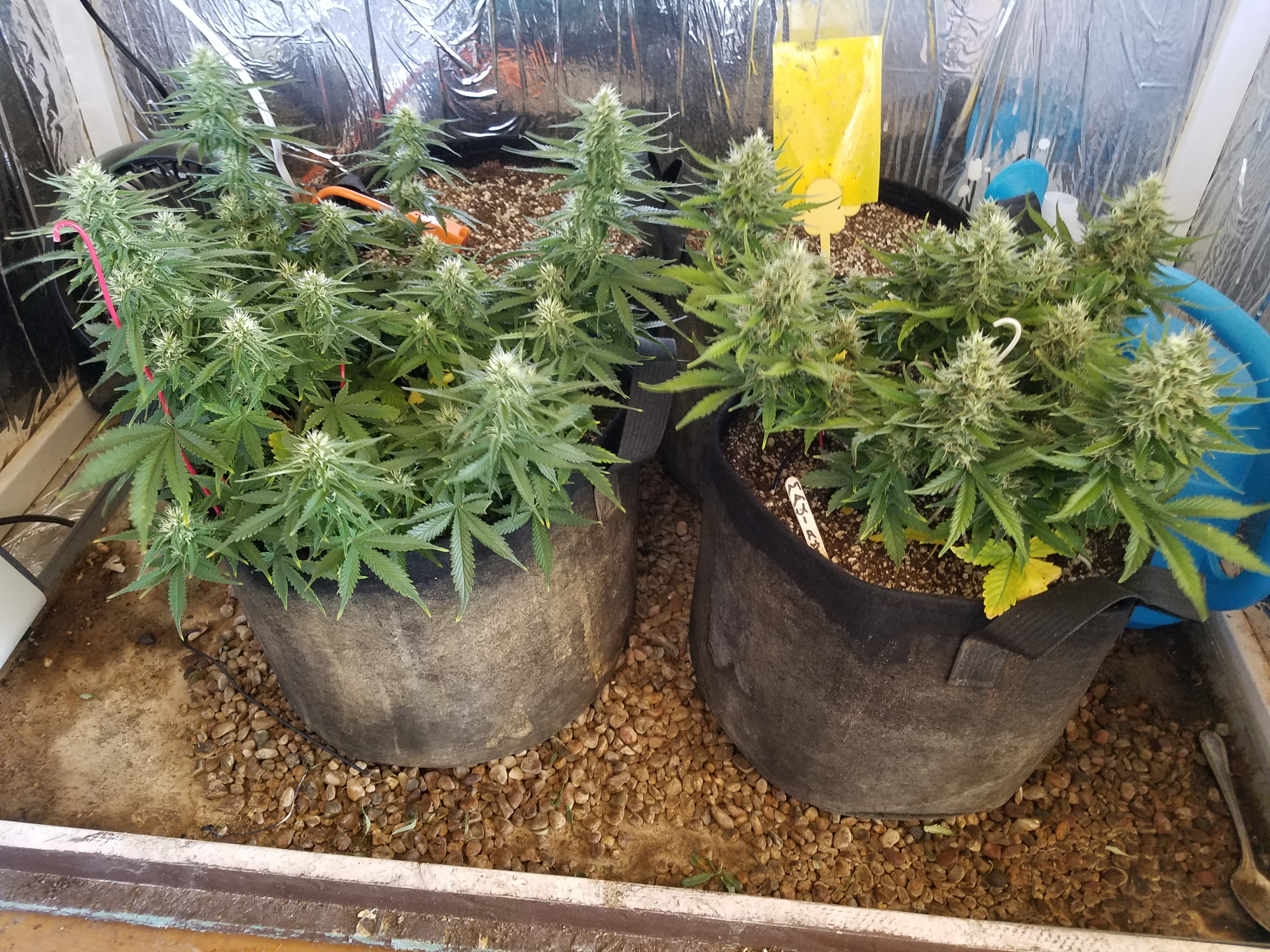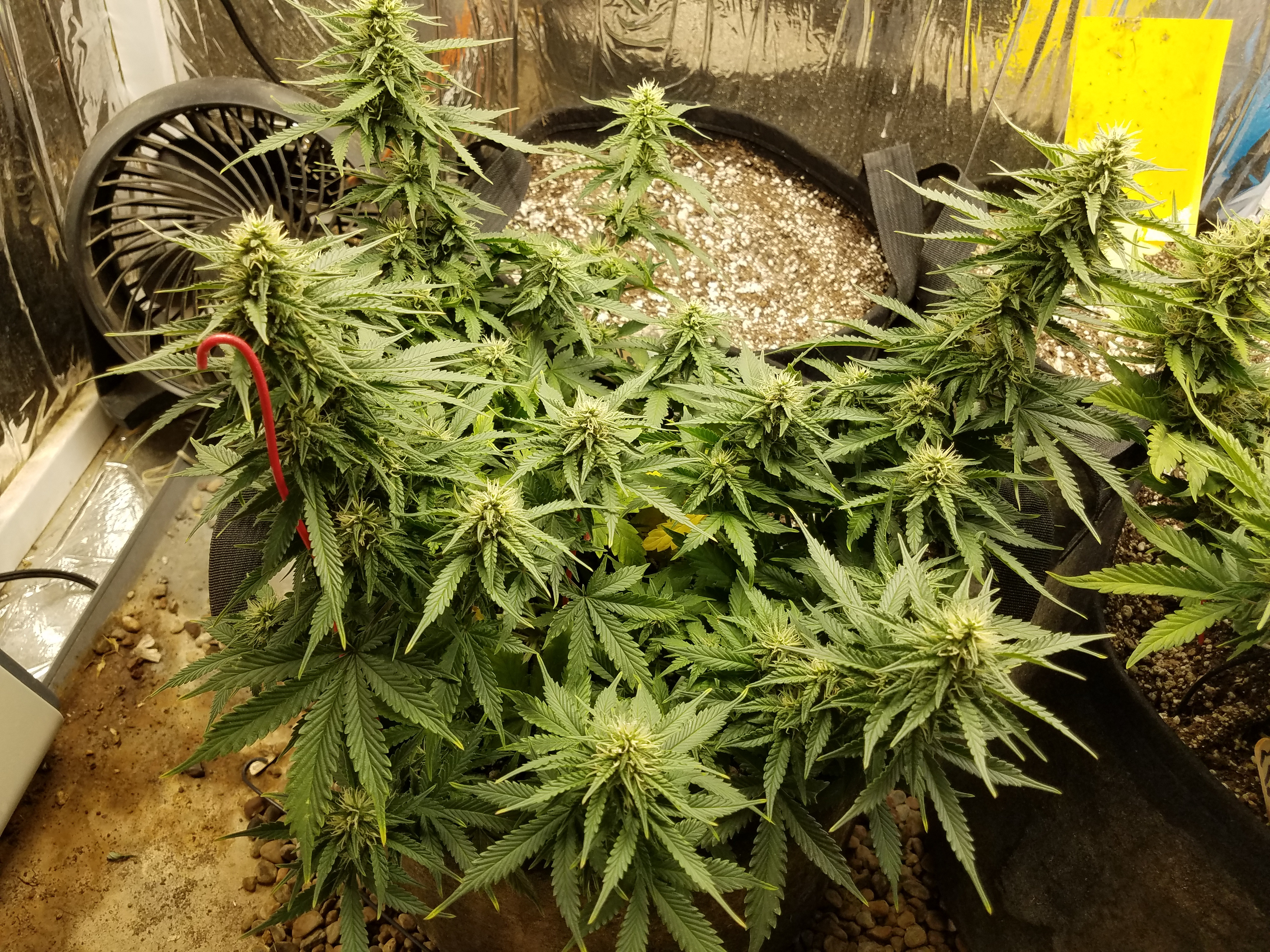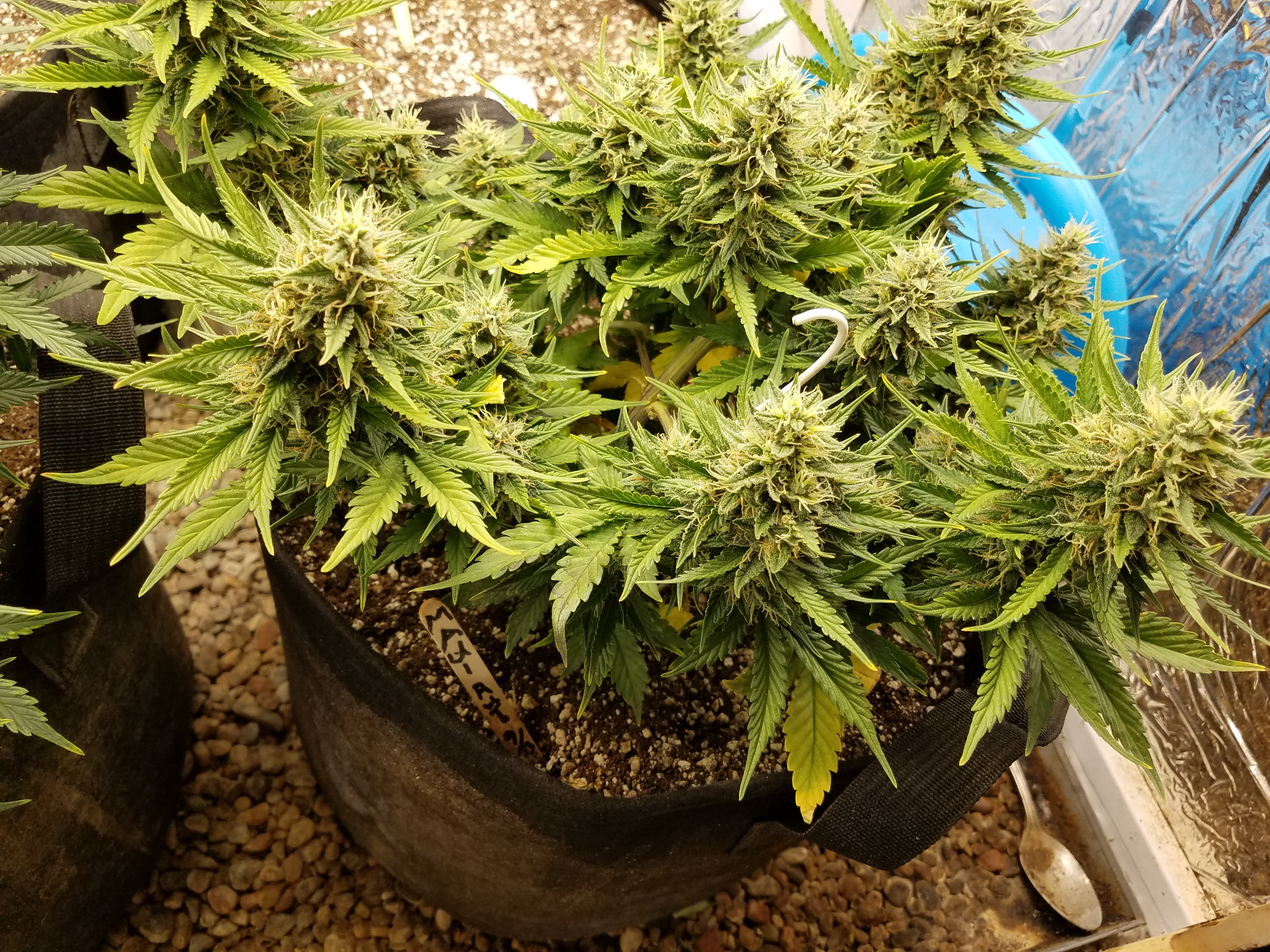 This is week 8 plus 2 days and finally an indication of plant aging in the lower fan leaves. Saw 1 two days ago now about 3 on each girl. Left lady stretched the most but her colas are spread so they are mostly bud clusters 1 inch to 3 inch dia. Right lady is more squat with 6 inch colas 3 inches in diameter at the butt. Kinda cone shaped. Mostly white pistils, just a little visible sugar and about 25% cloudy. my guess is 4 weeks yet but I don't really know autos but this is in line with what I read. Tallest colas are about 14 inches from dirt. SEven inches in 10 days.I'm looking or cloudy with just a few amber. If I get shimmering, flowing colors in my head they will be just right!