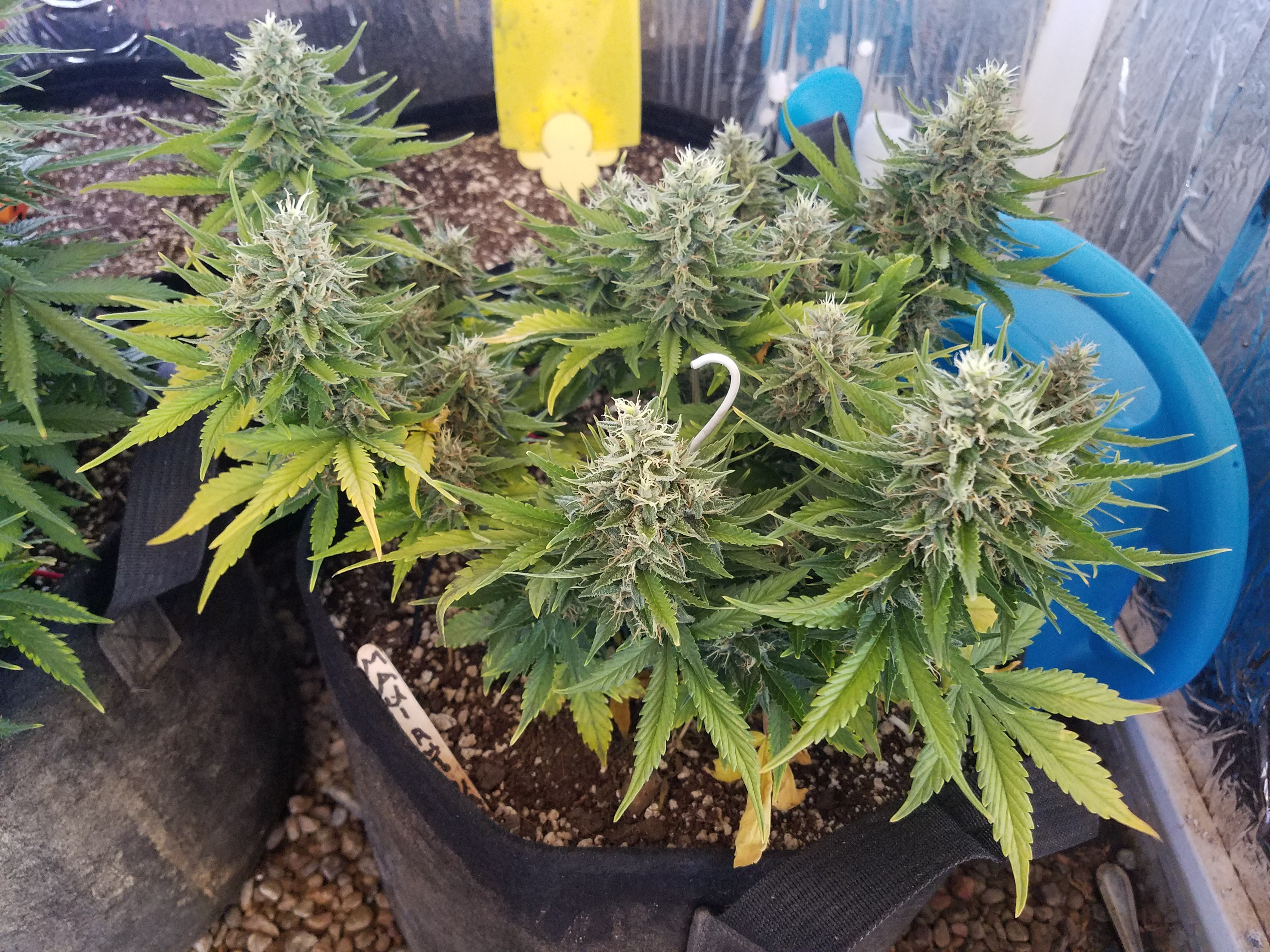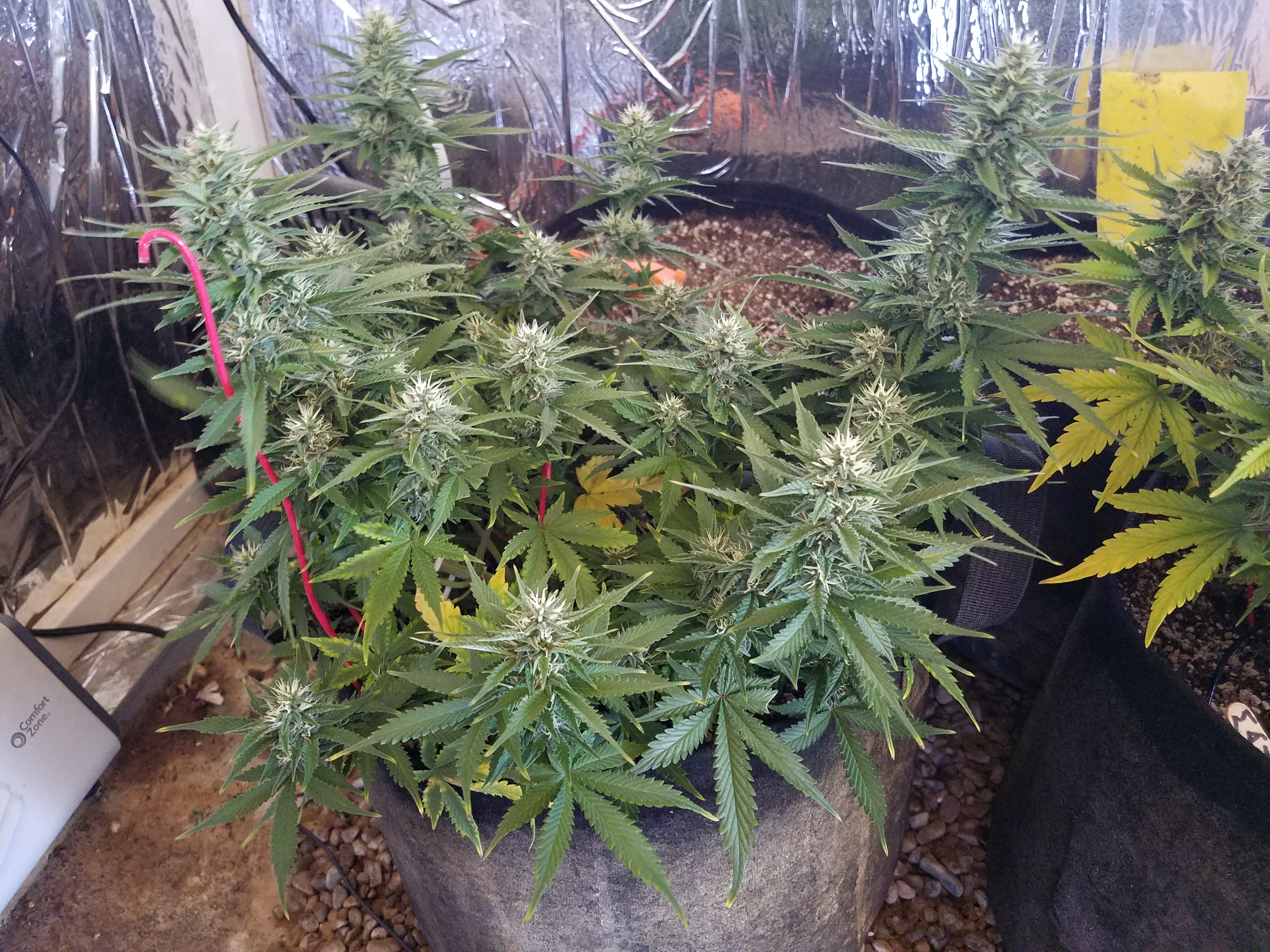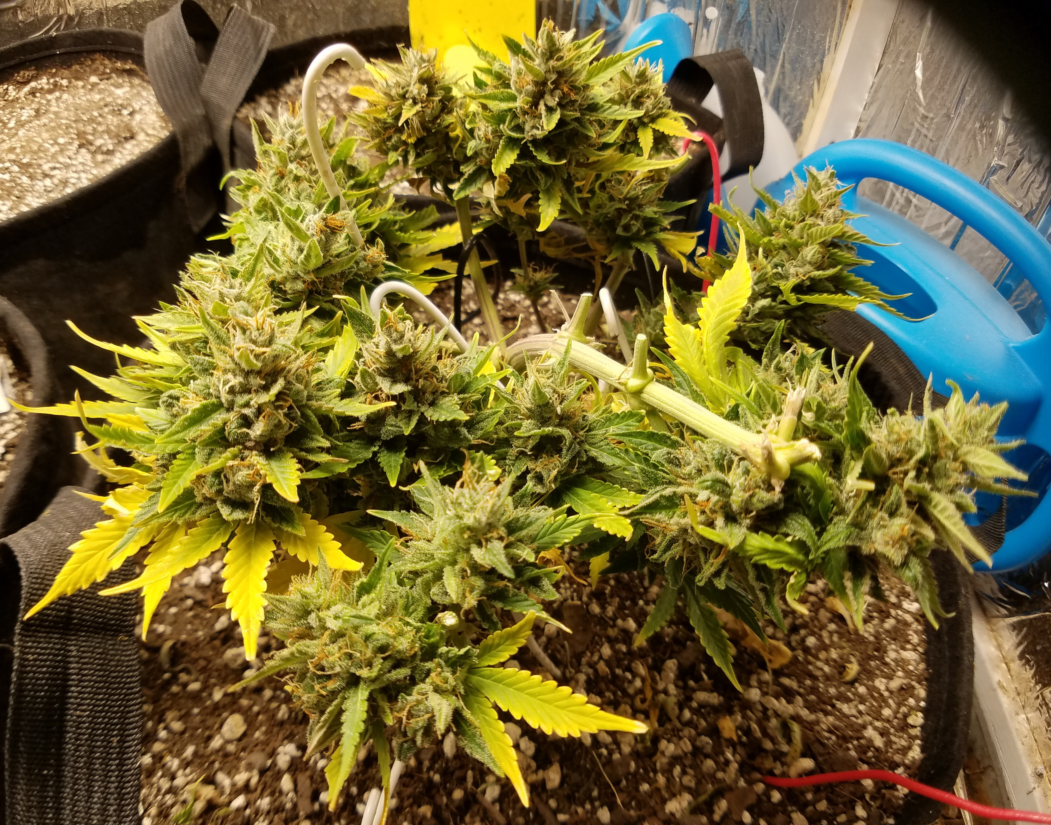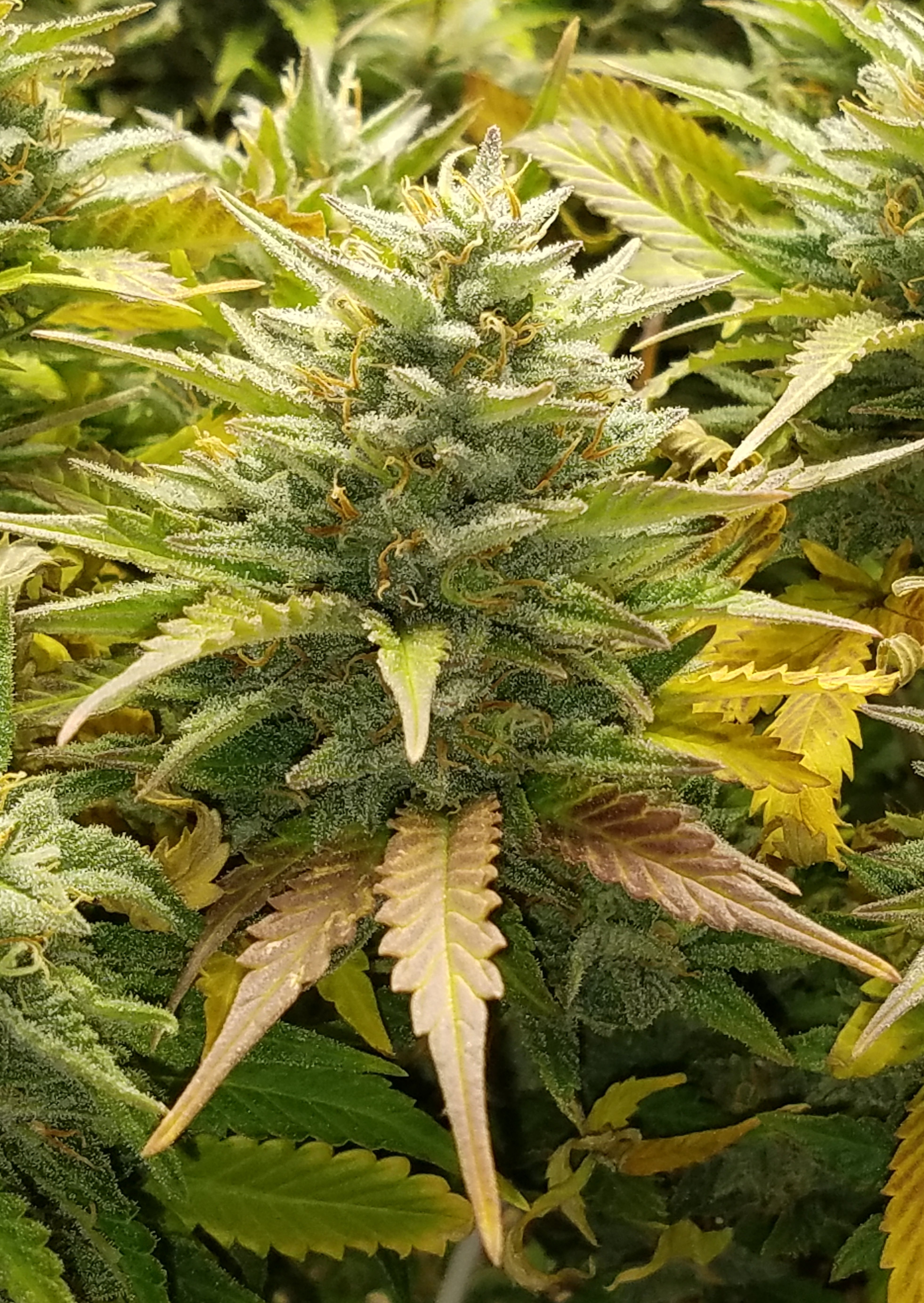 This is week 8 plus 2 days and finally an indication of plant aging in the lower fan leaves. Saw 1 two days ago now about 3 on each girl. Left lady stretched the most but her colas are spread so they are mostly bud clusters 1 inch to 3 inch dia. Right lady is more squat with 6 inch colas 3 inches in diameter at the butt. Kinda cone shaped. Mostly white pistils, just a little visible sugar and about 25% cloudy. my guess is 4 weeks yet but I don't really know autos but this is in line with what I read. Tallest colas are about 14 inches from dirt. SEven inches in 10 days.I'm looking or cloudy with just a few amber. If I get shimmering, flowing colors in my head they will be just right!