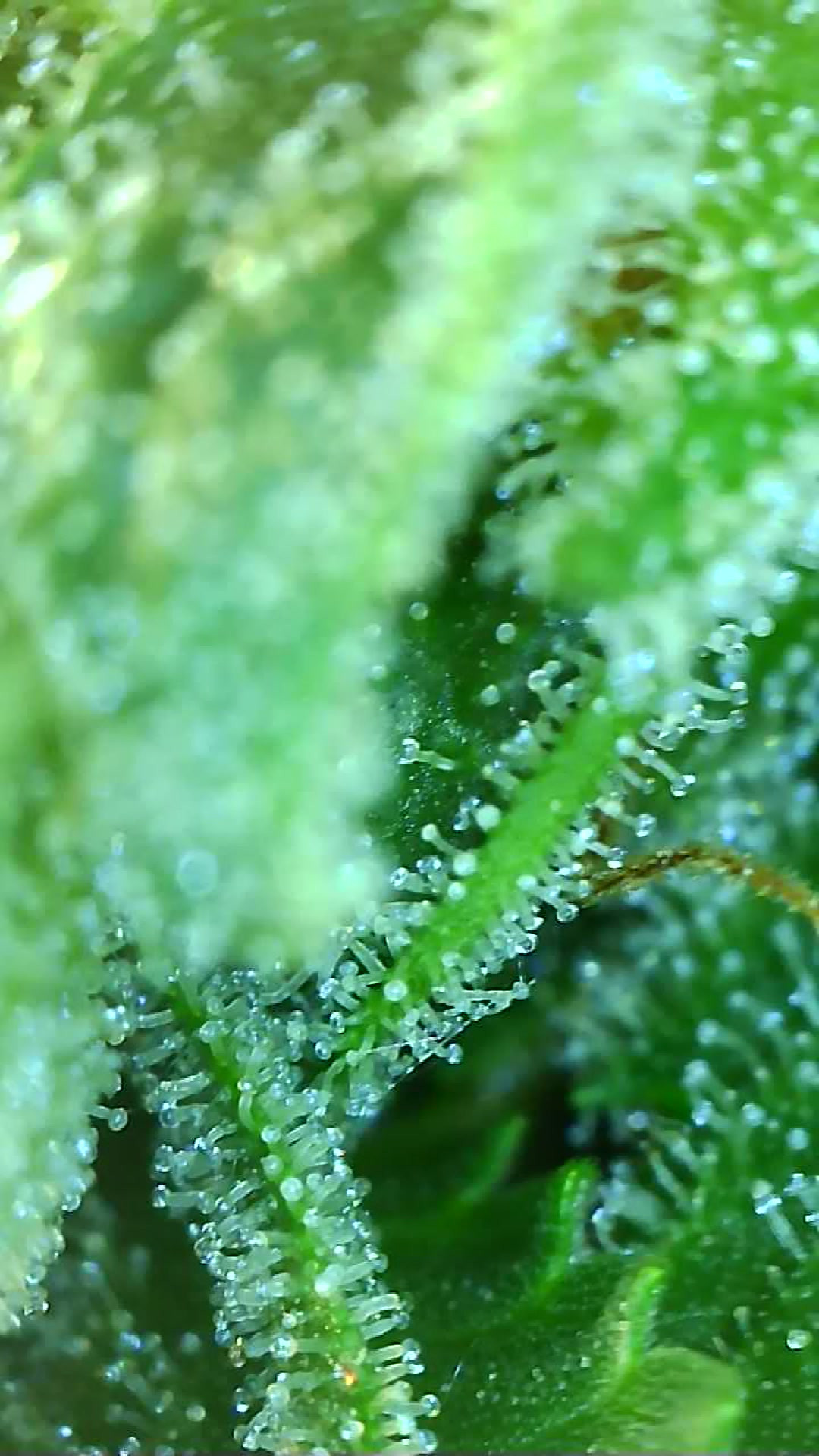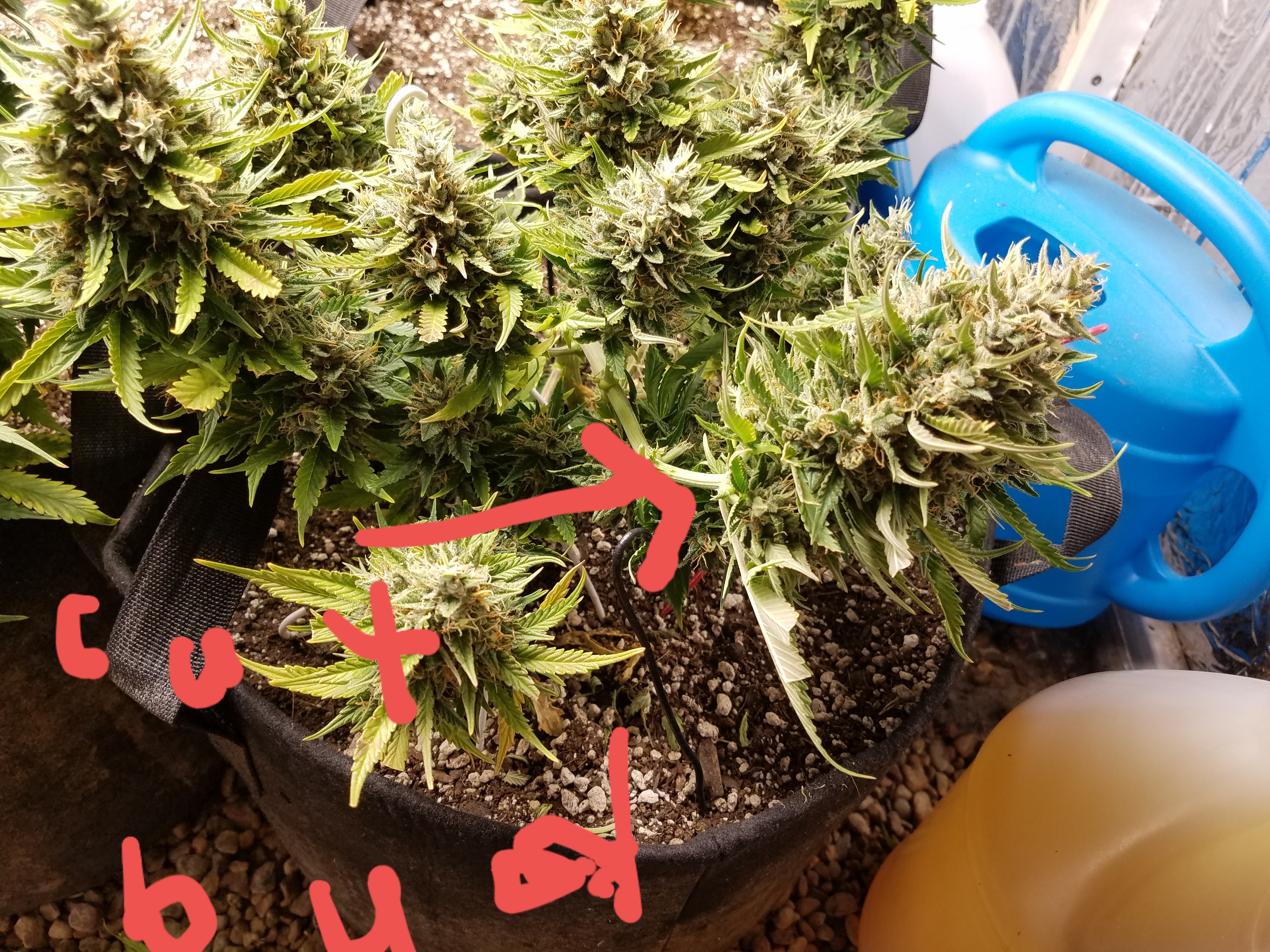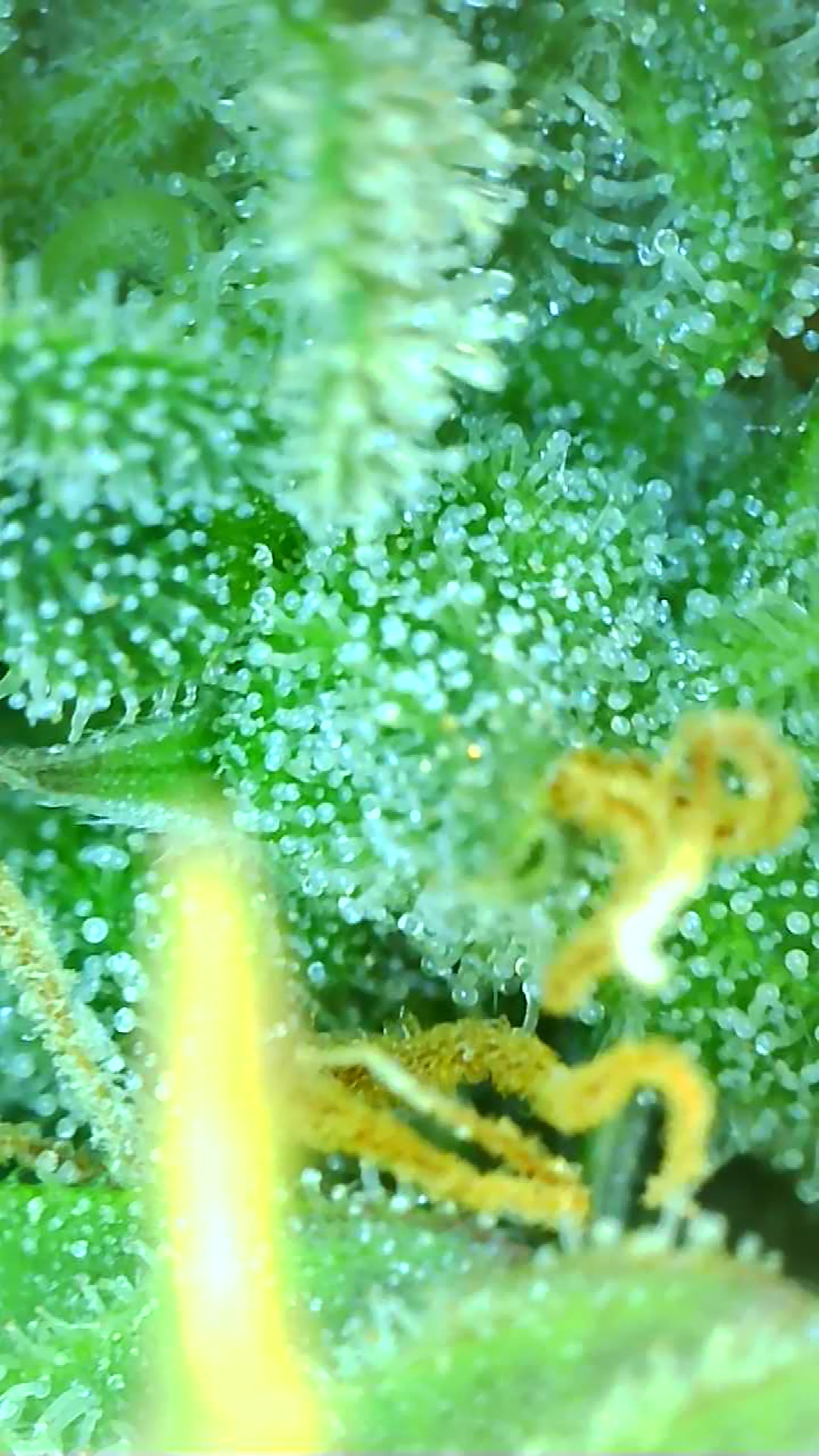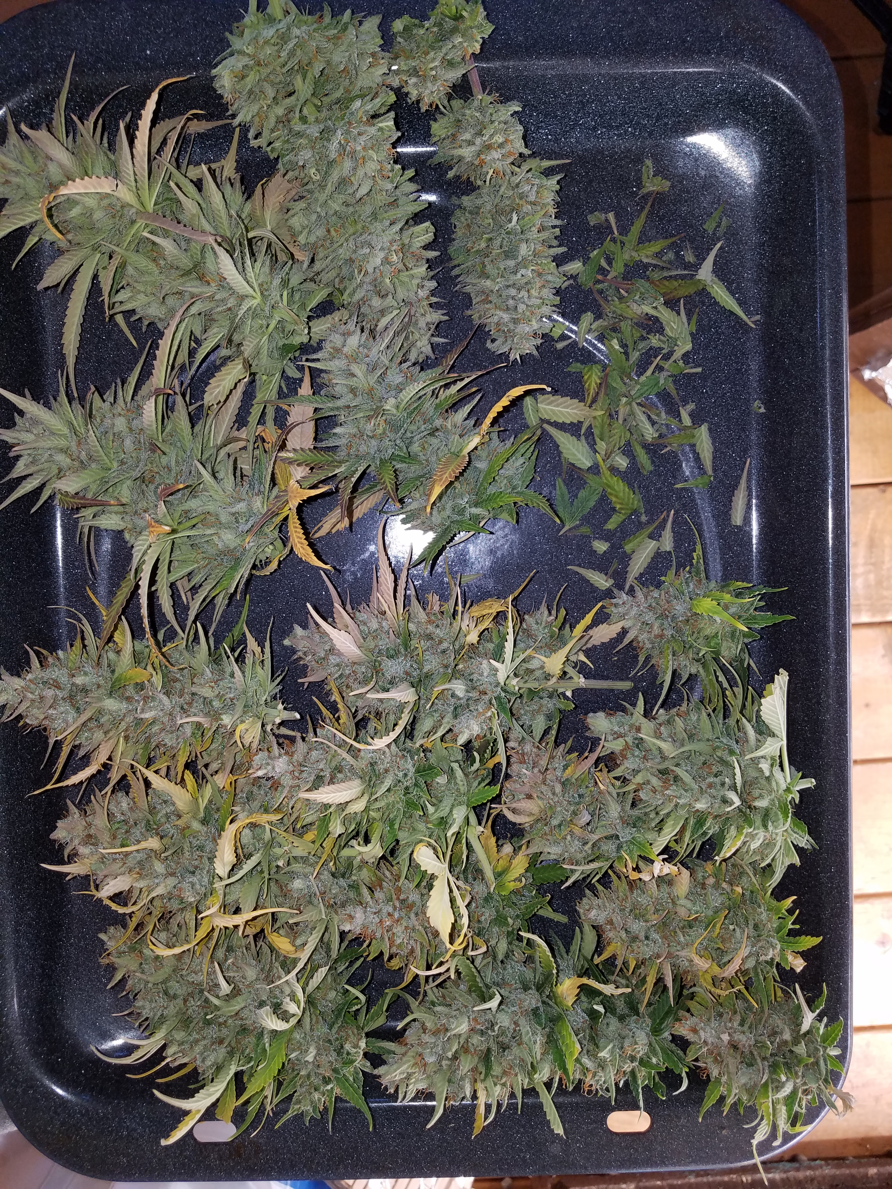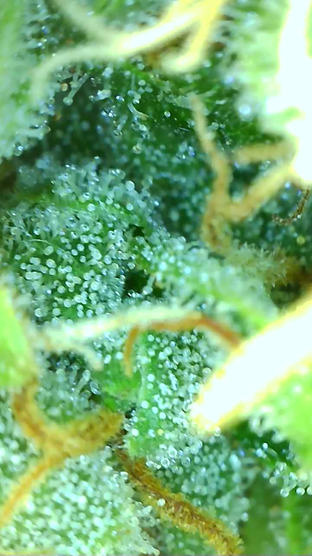 This is week 8 plus 2 days and finally an indication of plant aging in the lower fan leaves. Saw 1 two days ago now about 3 on each girl. Left lady stretched the most but her colas are spread so they are mostly bud clusters 1 inch to 3 inch dia. Right lady is more squat with 6 inch colas 3 inches in diameter at the butt. Kinda cone shaped. Mostly white pistils, just a little visible sugar and about 25% cloudy. my guess is 4 weeks yet but I don't really know autos but this is in line with what I read. Tallest colas are about 14 inches from dirt. SEven inches in 10 days.I'm looking or cloudy with just a few amber. If I get shimmering, flowing colors in my head they will be just right!