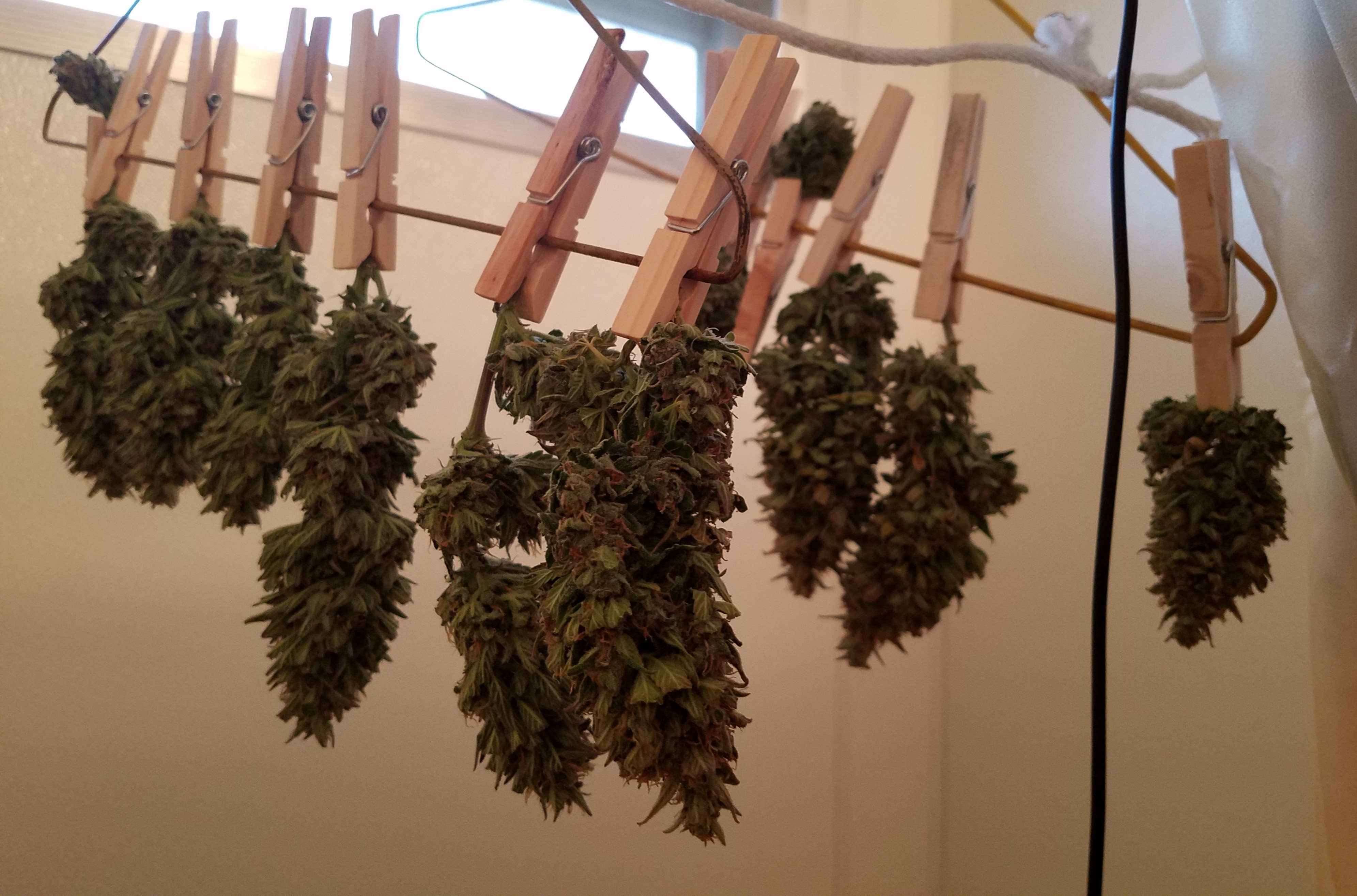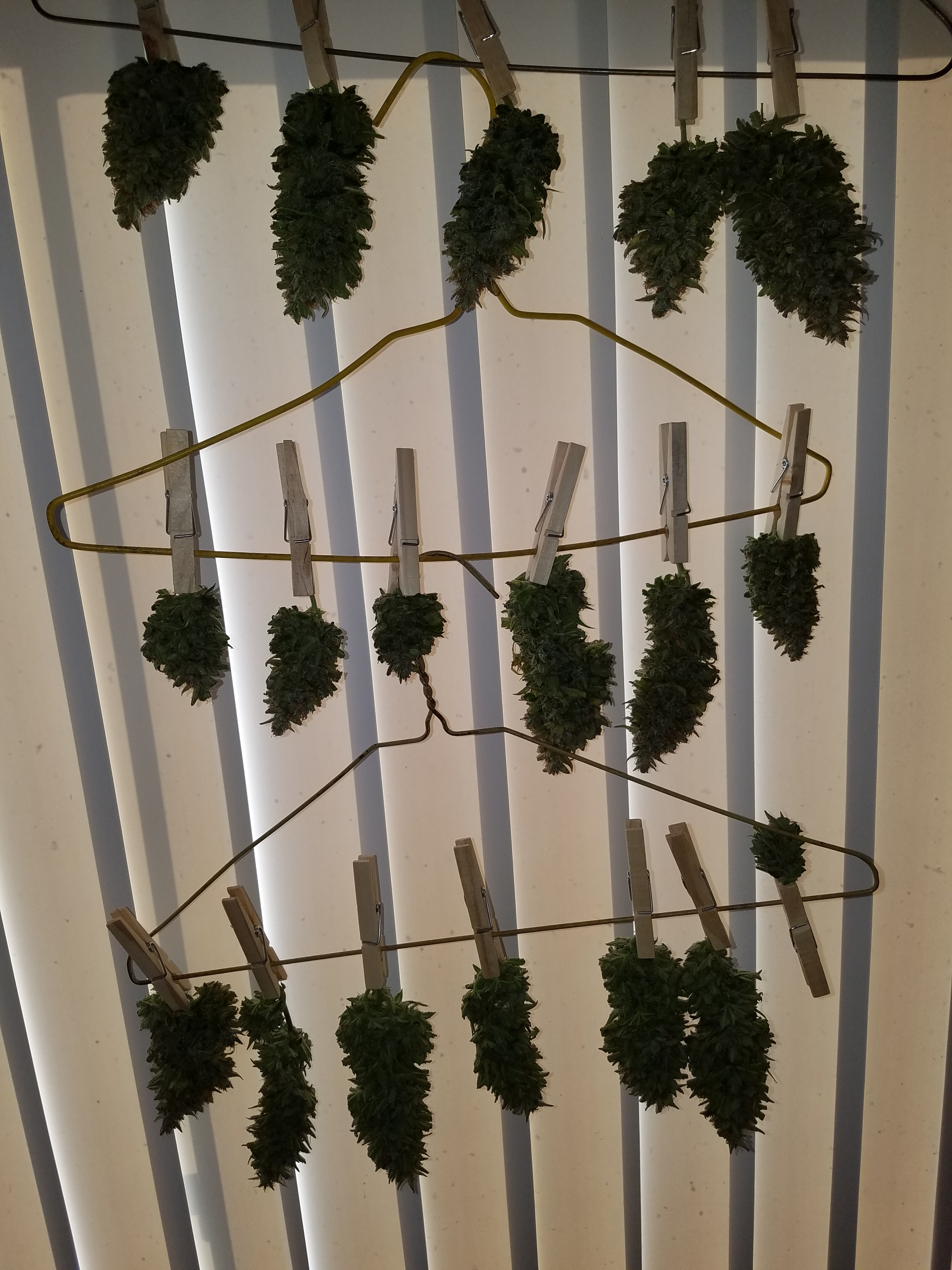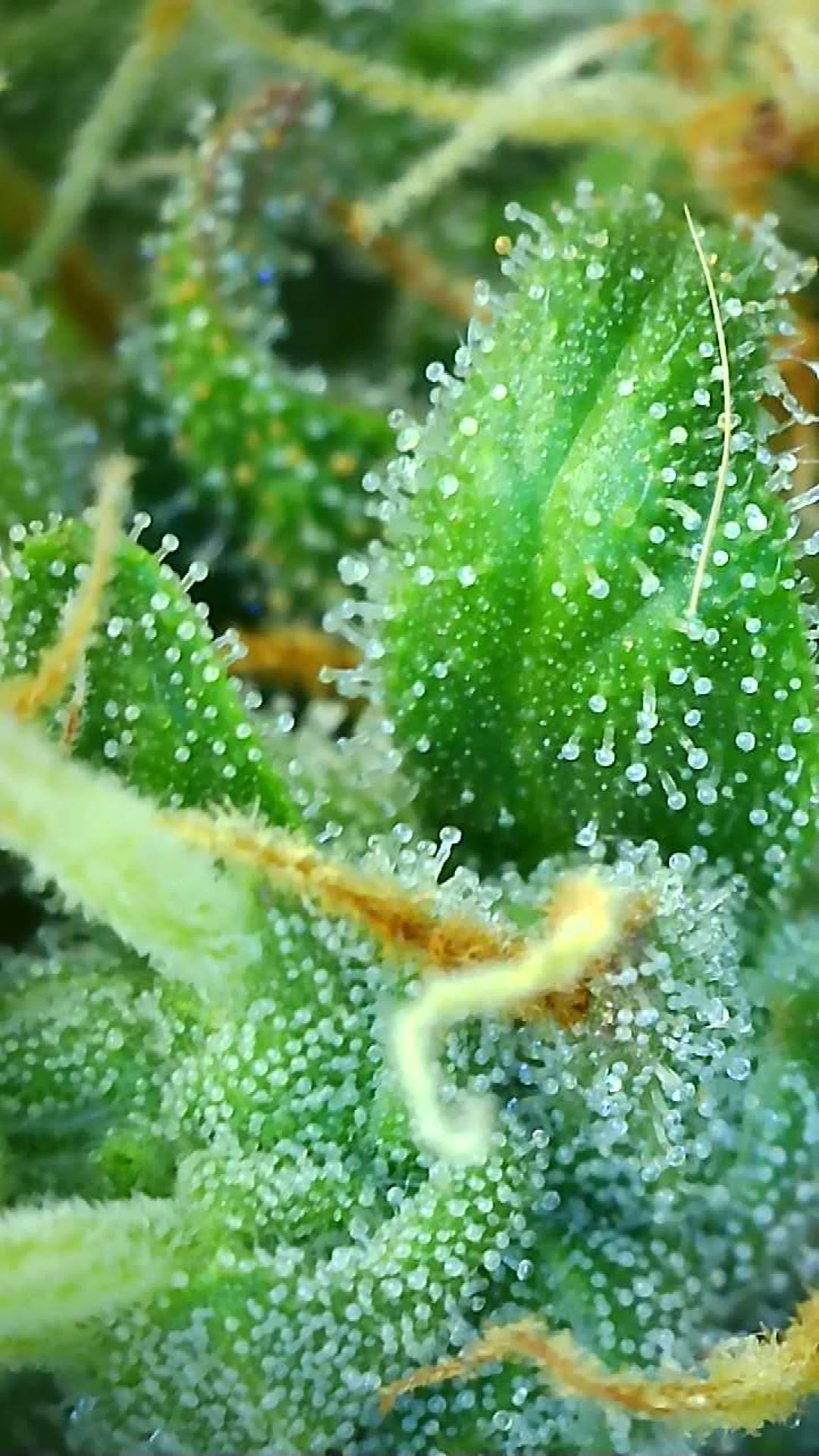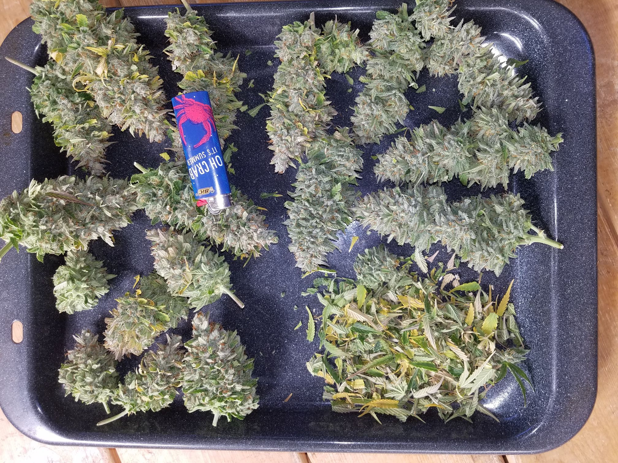 This is week 8 plus 2 days and finally an indication of plant aging in the lower fan leaves. Saw 1 two days ago now about 3 on each girl. Left lady stretched the most but her colas are spread so they are mostly bud clusters 1 inch to 3 inch dia. Right lady is more squat with 6 inch colas 3 inches in diameter at the butt. Kinda cone shaped. Mostly white pistils, just a little visible sugar and about 25% cloudy. my guess is 4 weeks yet but I don't really know autos but this is in line with what I read. Tallest colas are about 14 inches from dirt. SEven inches in 10 days.I'm looking or cloudy with just a few amber. If I get shimmering, flowing colors in my head they will be just right!