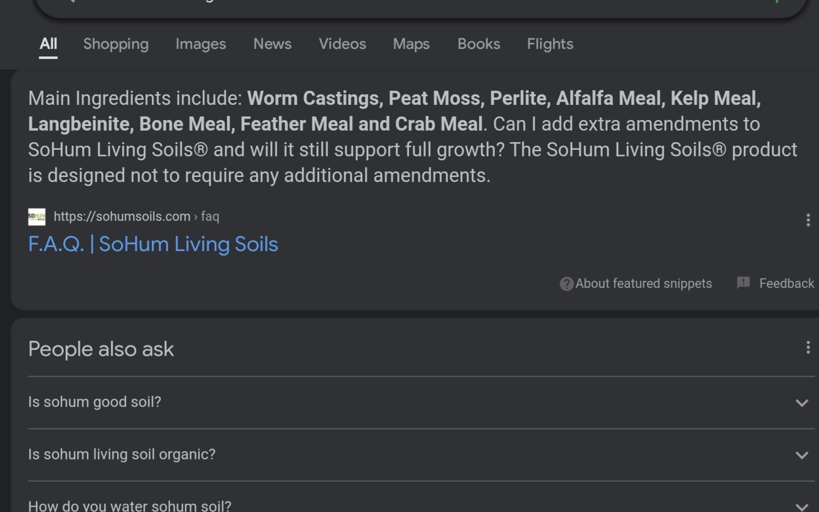 Main Ingredients include: Worm Castings, Peat Moss, Perlite, Alfalfa Meal, Kelp Meal, Langbeinite, Bone Meal, Feather Meal and Crab Meal