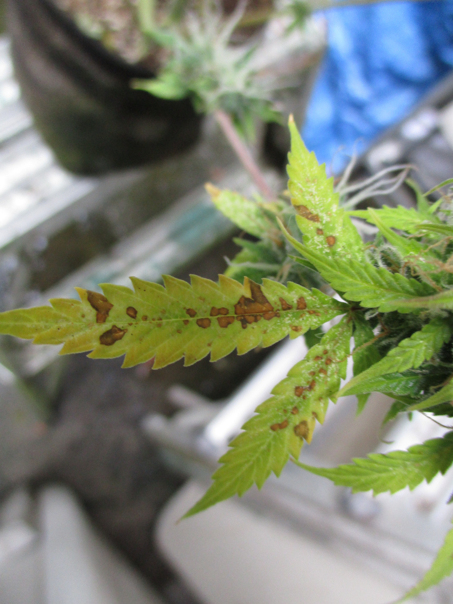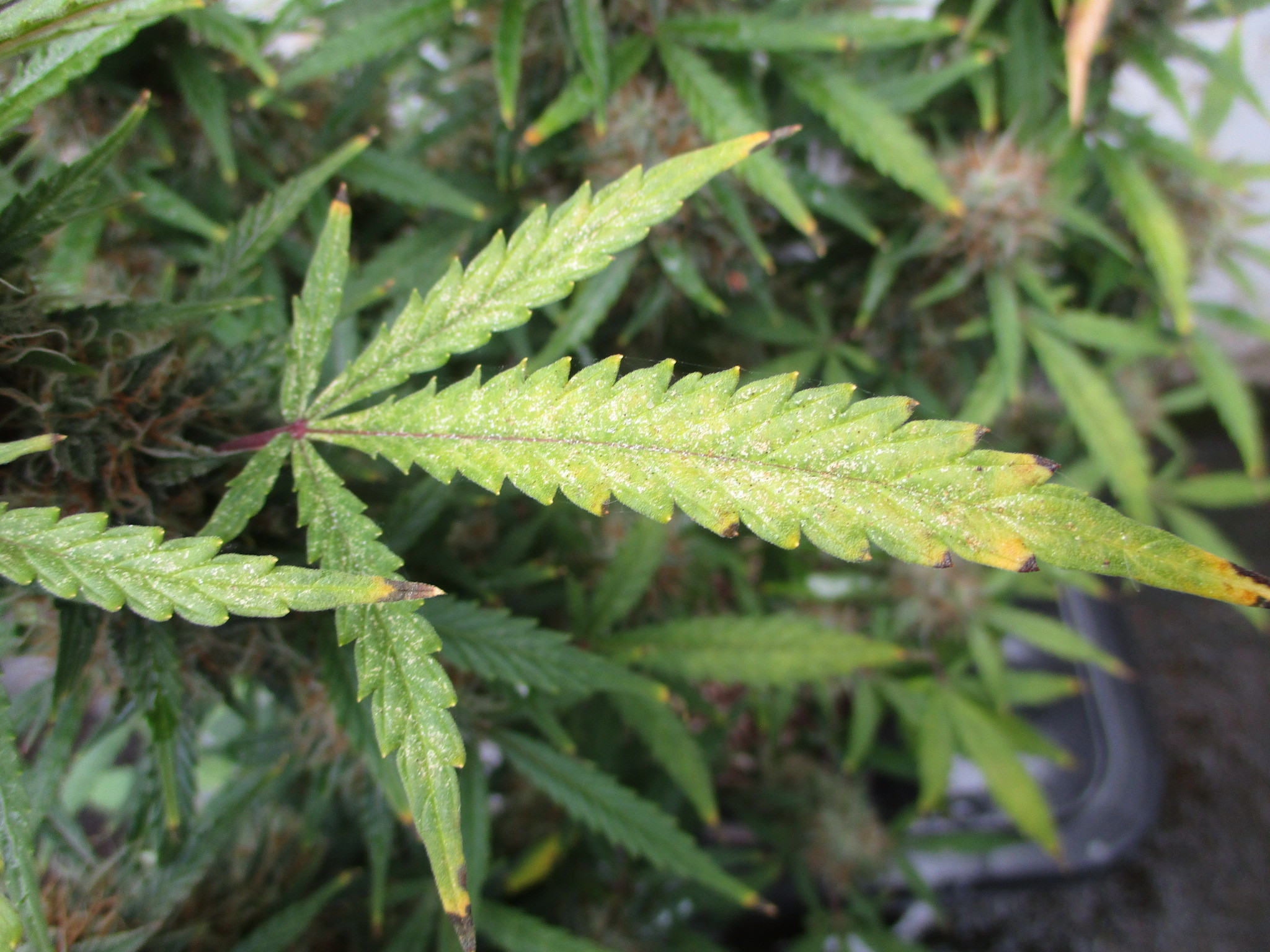 Following pics show the progression of what happens to a number of leaves - first it looks like white powdery mold or spider mite damage - then it progresses through to the third pic - where it looks like a magnesium/calcium deficiency - which was how I was treating it.