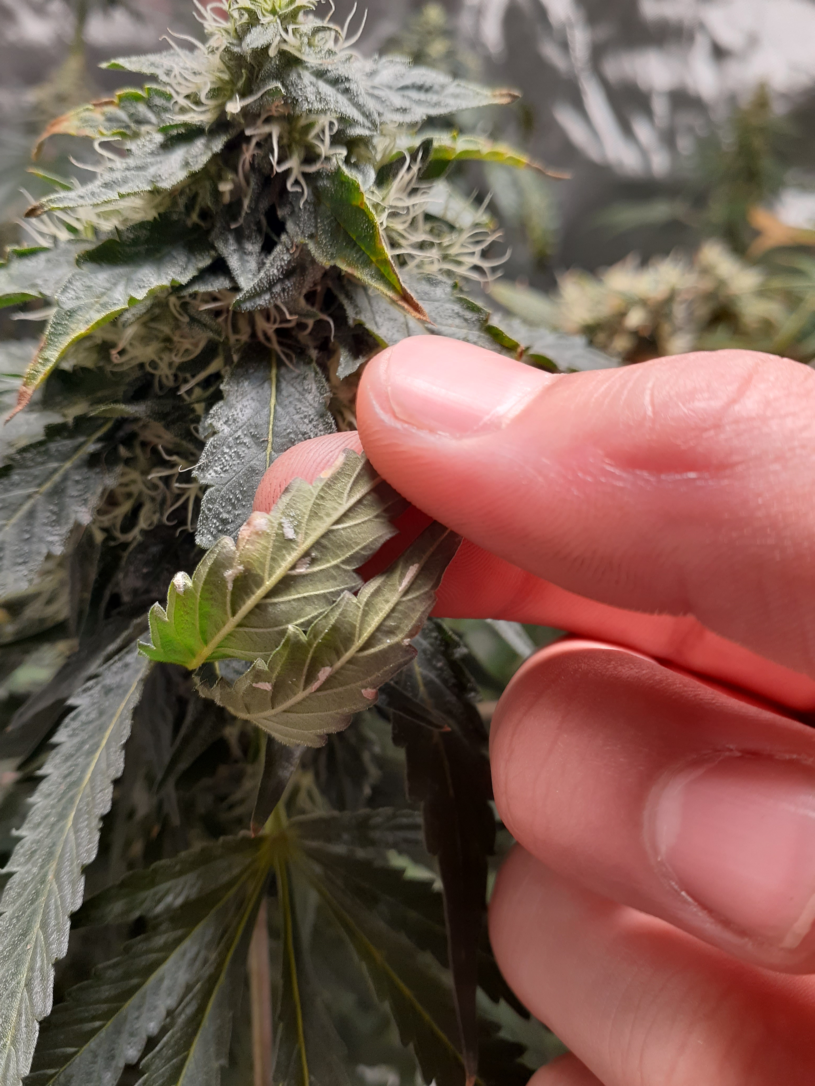 Okay so where that leaf is it's right on the top cola so I can't really get it down on the main stalk, is it wise to just leave a fan leaf stem sticking out? I'm worried that by doing so it will leak sap or moisture more or less in onto the actual bud/flower and give me more issues than just leaving it along until I know for sure?