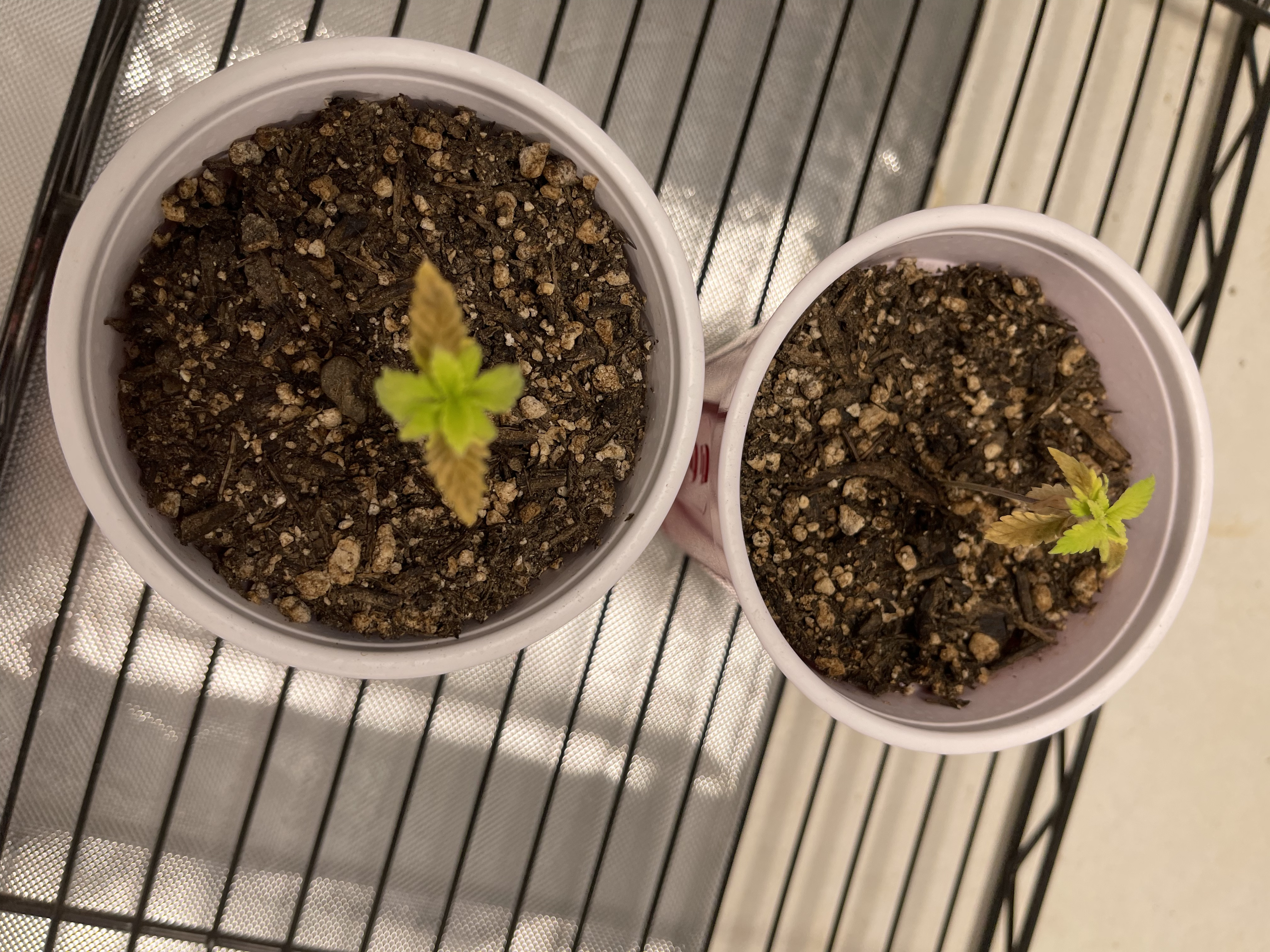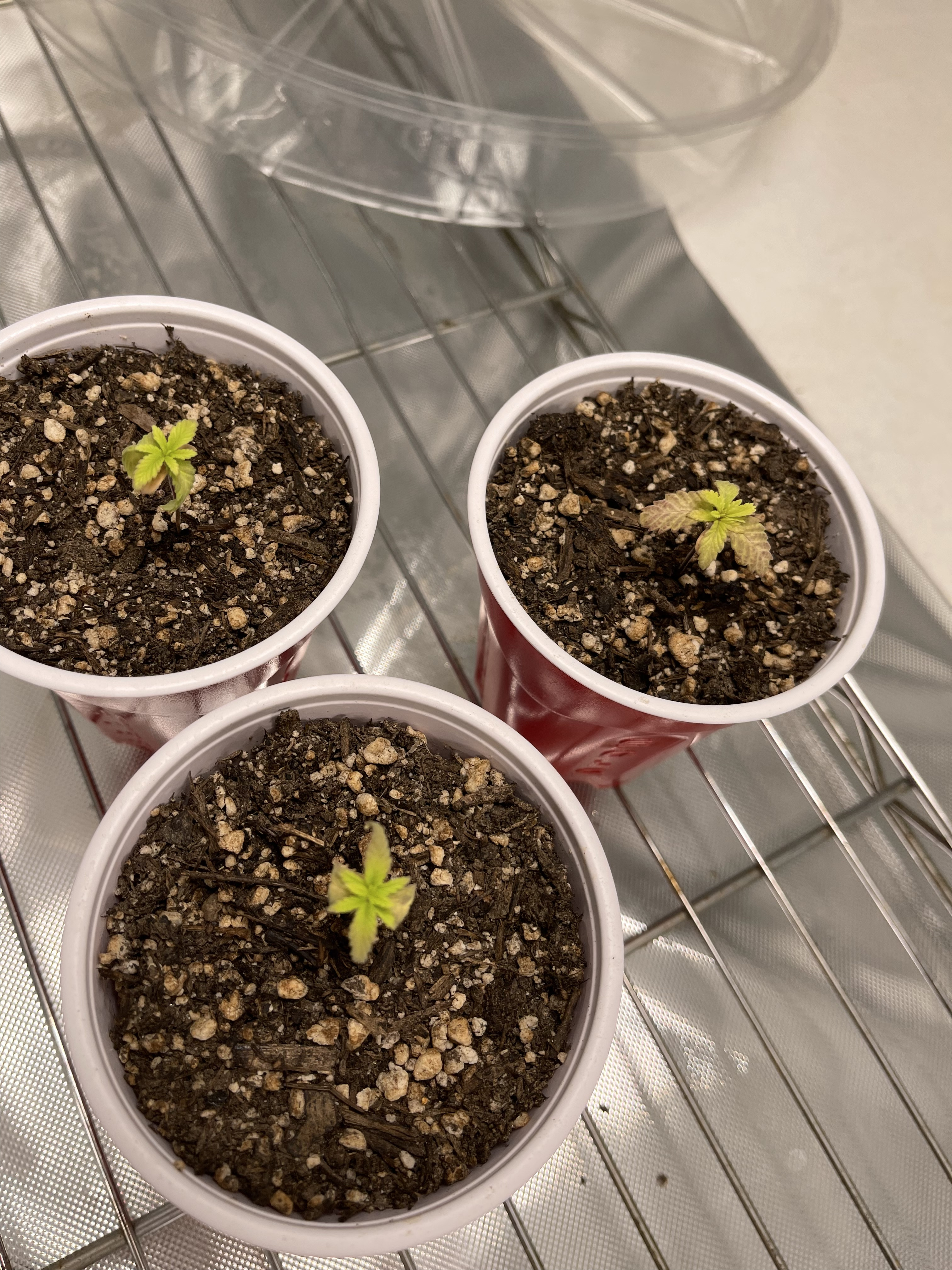 Hey DC28 Could be a few different things OR a combo of all. Your organic soil- does it have time release fertilizer(is there any nuts in it)?. Thats really tough on seedlings. Second, is there any holes in those solo cups? I dont see any. If the water isnt draining out of the cups, the roots just sit in stagnant water and that brings on all kinds of problems. And i dont recommend any root enhancer or ferts till just before i transplant to big pot. You didnt say weather they were photos or Autos.. If Autos..i wouldnt waste any more time,hydro,fertilizer etc on them. If their photos and you want to try an experiment you may be able to nurse them along, but they need to come out of those cups and into something proper. I'll post a pic of 4 plants that are 27 days old today. Oh and a couple of my solo cups that i use for starting seeds...the roots need air and good drainage.4 PhotosShappel S3000 3.5x6x6' ice hut