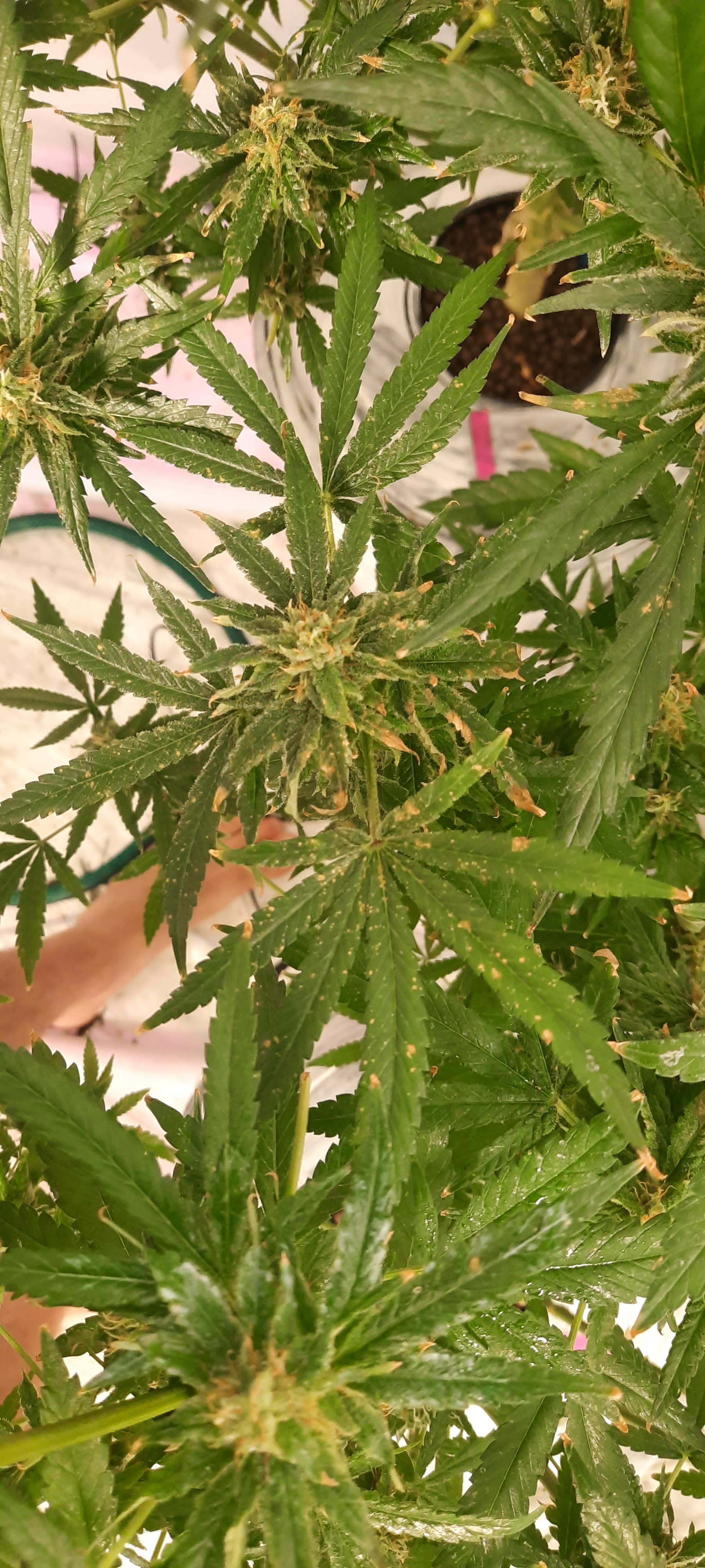 Please check these photos out. Not sure what these markings are on the leaves but I think it could be light burn from spraying anti-mildrew stuff on my plants. Dealing with a small out break of mildew. The markings are only in these three areas of the grow and I have 16 plants in total so not wide spread but worried could get worse if its something I'm not aware of.