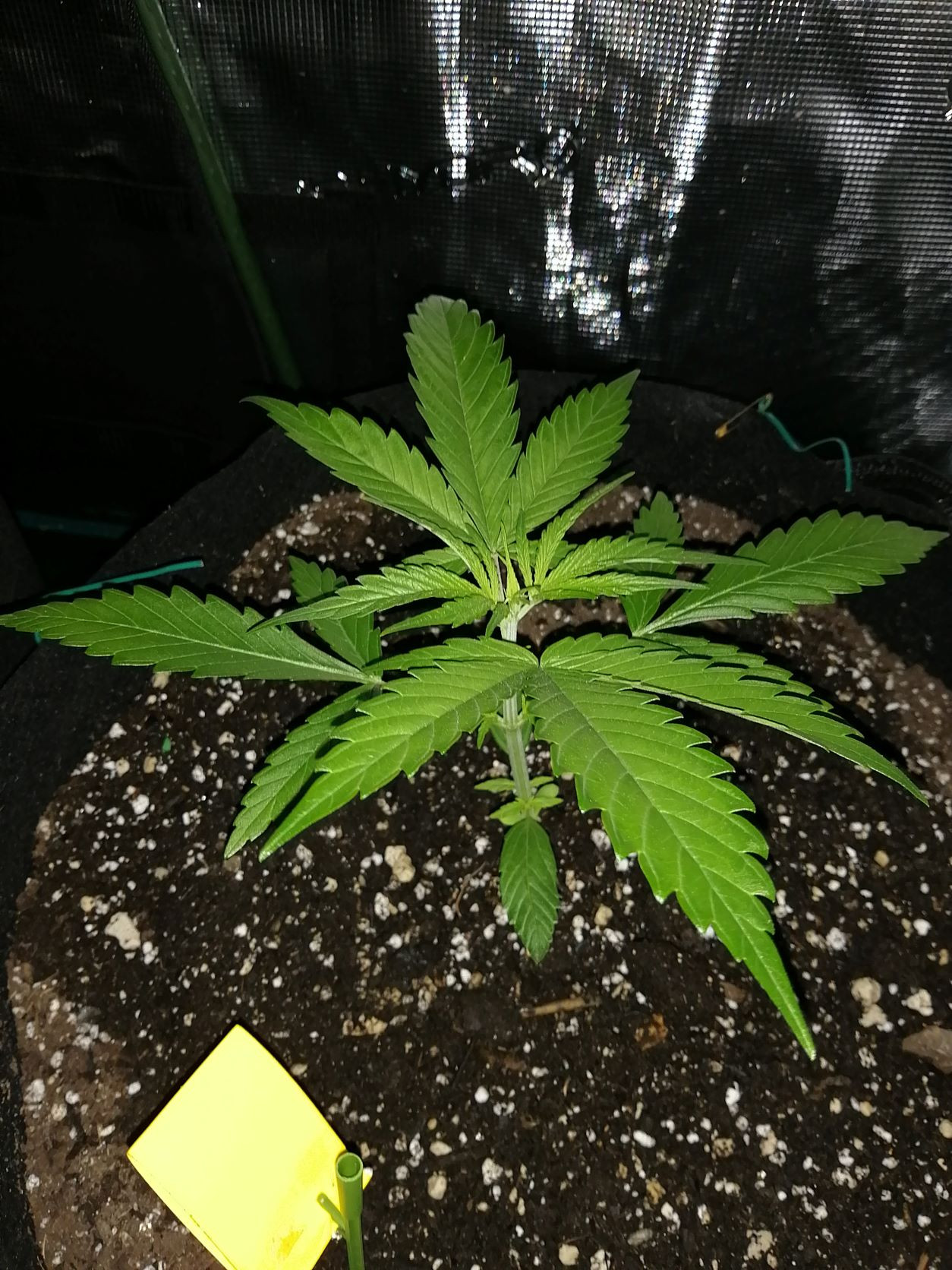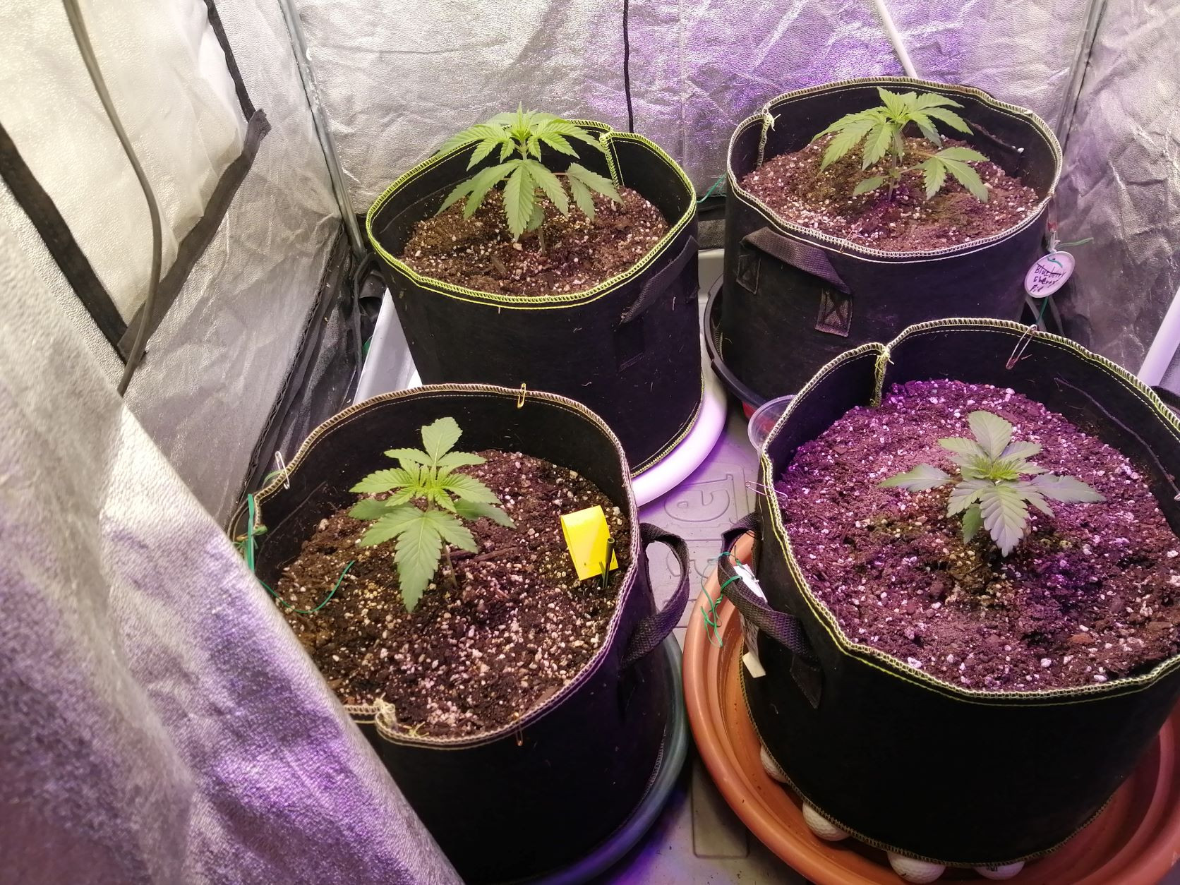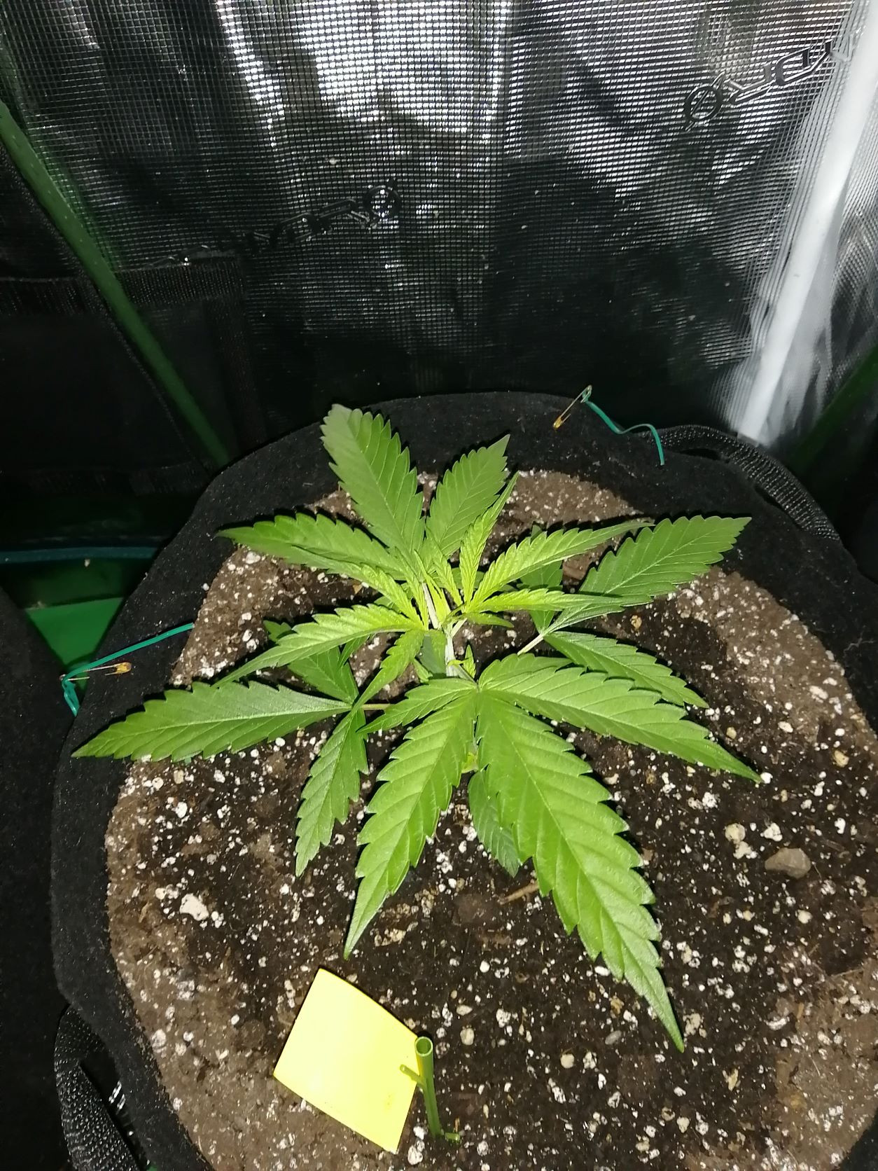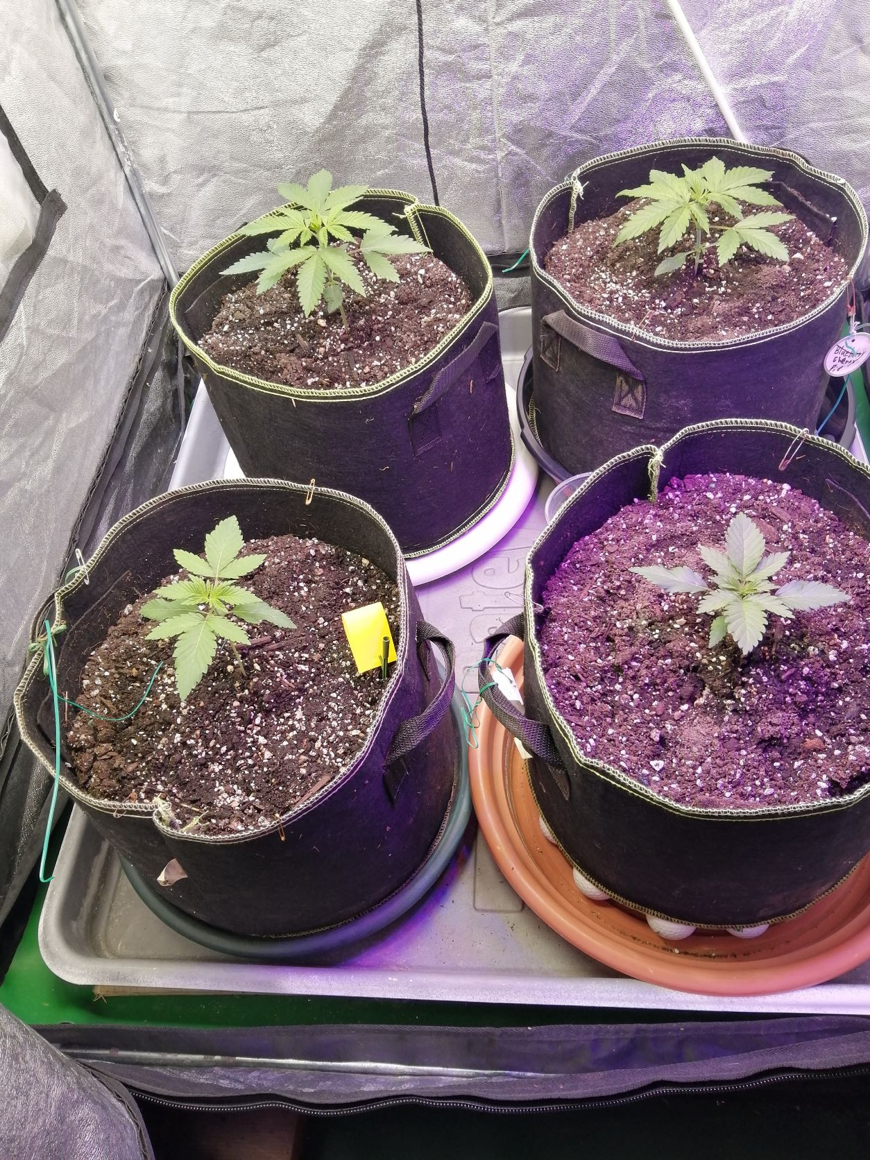 Just doing some research on Dr Grinspoon. I didnt realize it was a tough grow, stretching a ton and taking up to 149 days. I had planned to manifold it big time to keep within my height, but now wondering what the hell ? should be cooler than i thought. seeds from Barney's Farm through TNSB (my go to for year). see photos of the 4 short tent plants together and the Dr Grinspoon on her own. Her tent mates ( amnesia haze and Shogun). In one day they have responded big time. i on;y left 1.5 to 2 inches of regular potting soil between theroots and the super soil, so was somewhat worried about burning them at start, but - lucked out again!