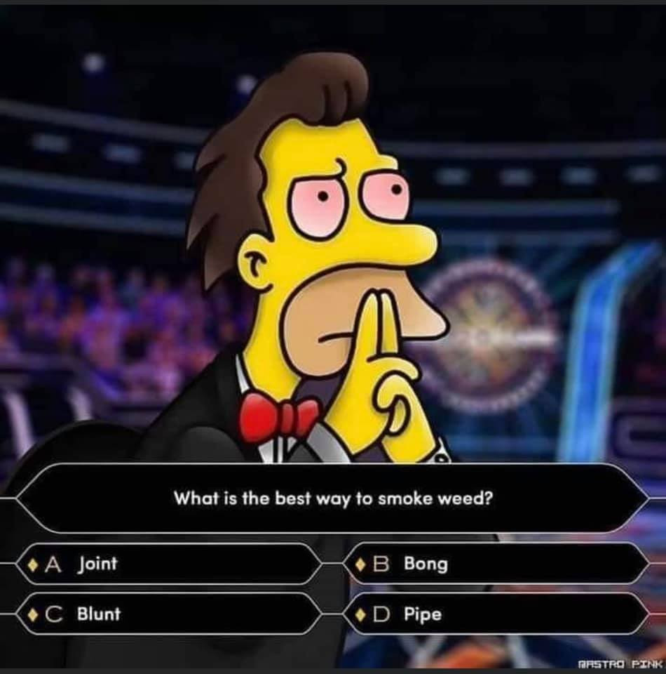 B for me. But I like all the rest as well. I have a one hit pipe that travels well. A reefer comes in handy at times too but w/o hash as I don't have any, yet. Hope that doesn't make me a bad person.