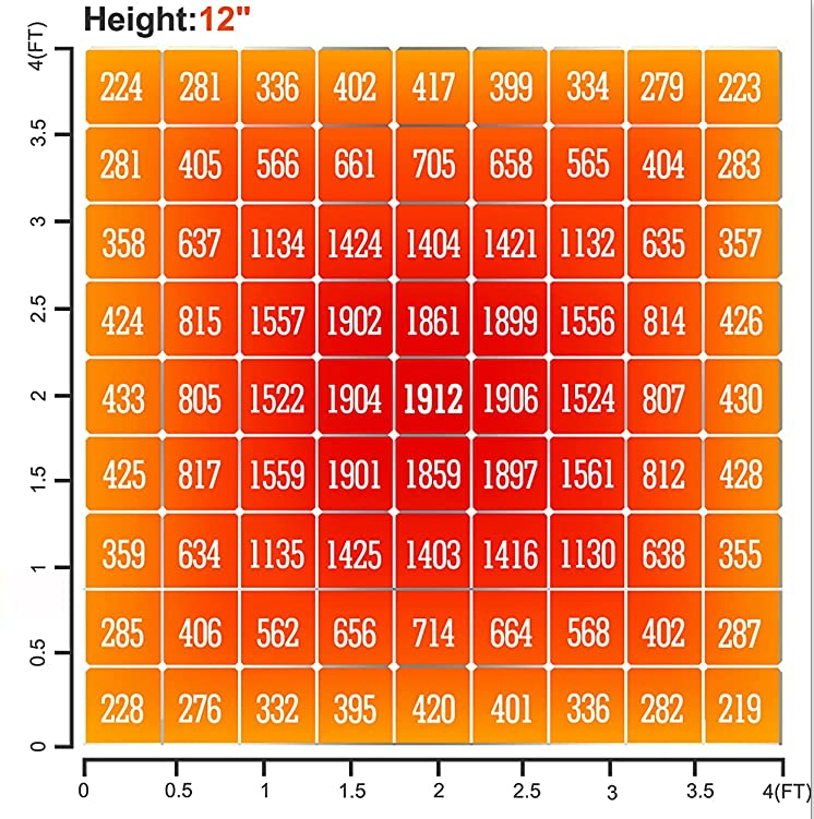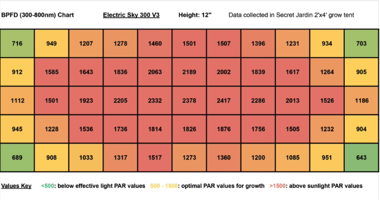 Finally check on the lights output. All else being equal higher PAR values mean higher harvest weights. See the following charts. The first is for the lights I had invented to purchase and the second chart is for the light I plan to purchase, the Electric Sky 300 v3. I calculated that the light cost 27% more but will the PAR values are 30% higher. One way to look at this is that in 3⅓ grows the more expensive lights will have paid for themselves assuming that harvest weight increases at the same percentage of the higher PAR values. Another way to look a this is if the cost of an ounce of cannabis were $300 an ounce where you live and if the lights increased your harvest from 3 ounces to 3.3 ounces you could recover the cost in one grow from just 4 plants with 20% extra yield as a nice bonus. Where I live we are allowed 6 plants in veg and 6 in flower. So in this scenario I would recover the cost in 1 grow.