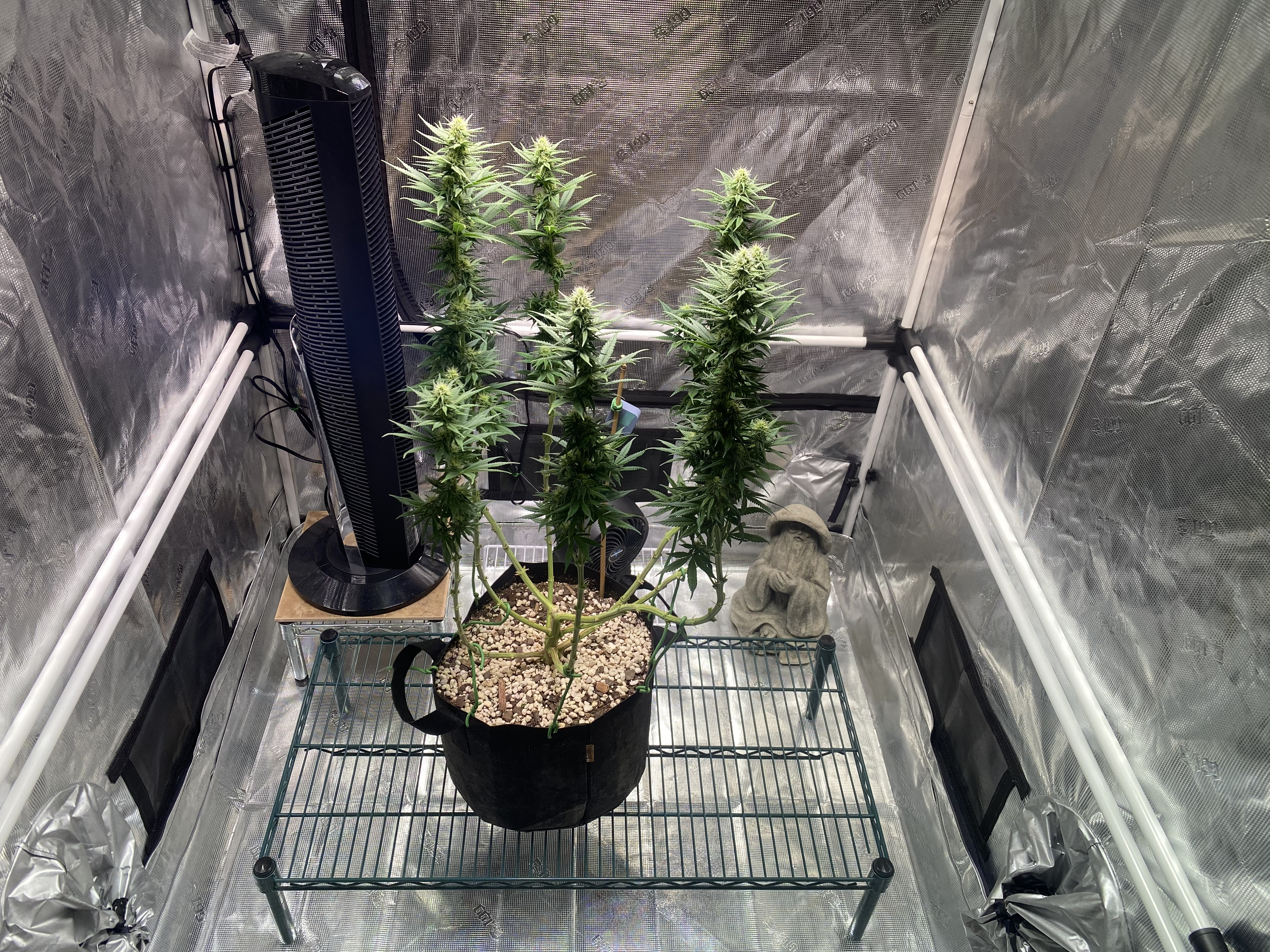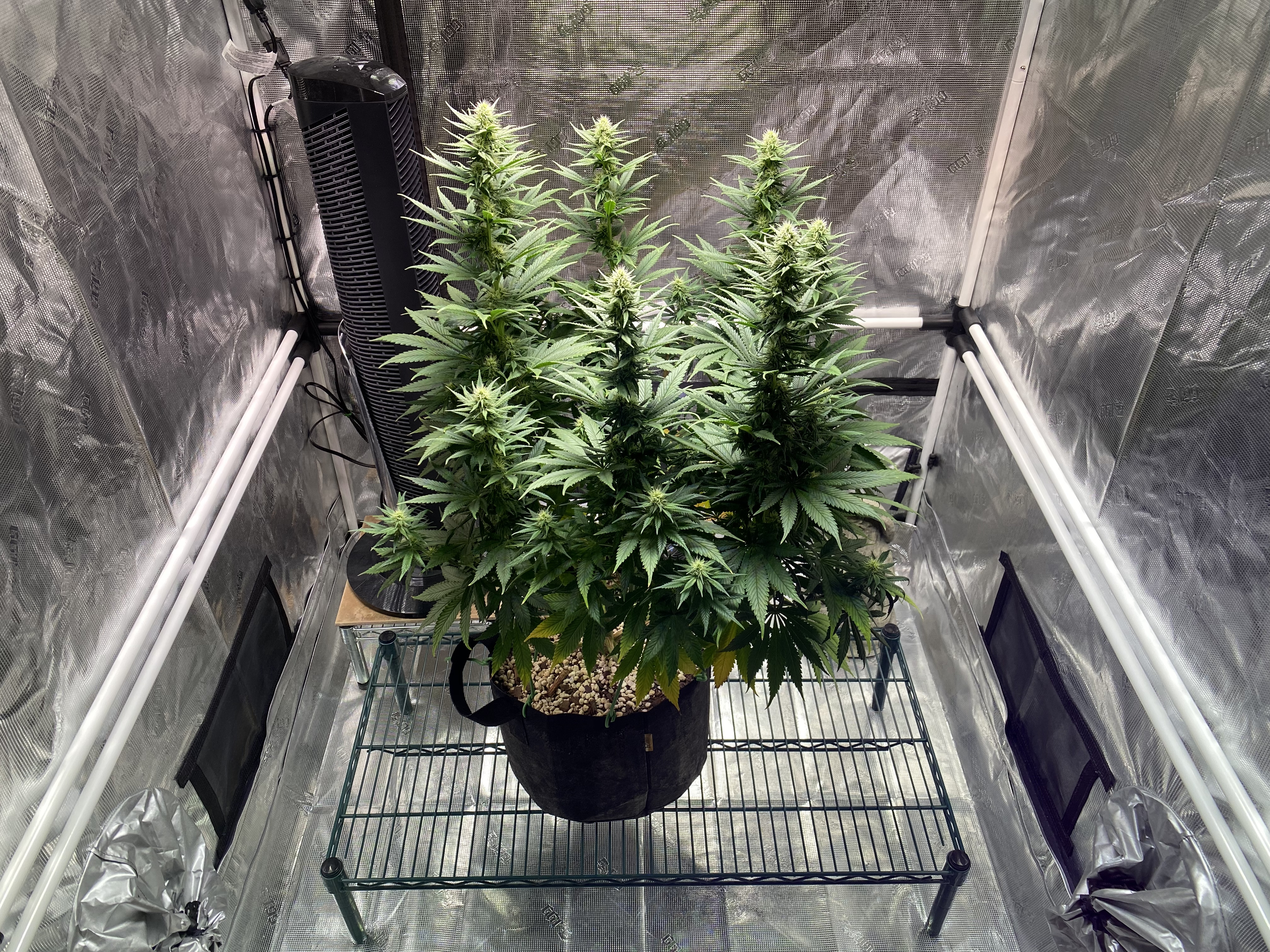 I have 8 main stalks, mostly at about the same canopy level. I suspect sometime soon I’m going to have to stake them so that they don’t fall over, especially with the oscillating tower fan going.