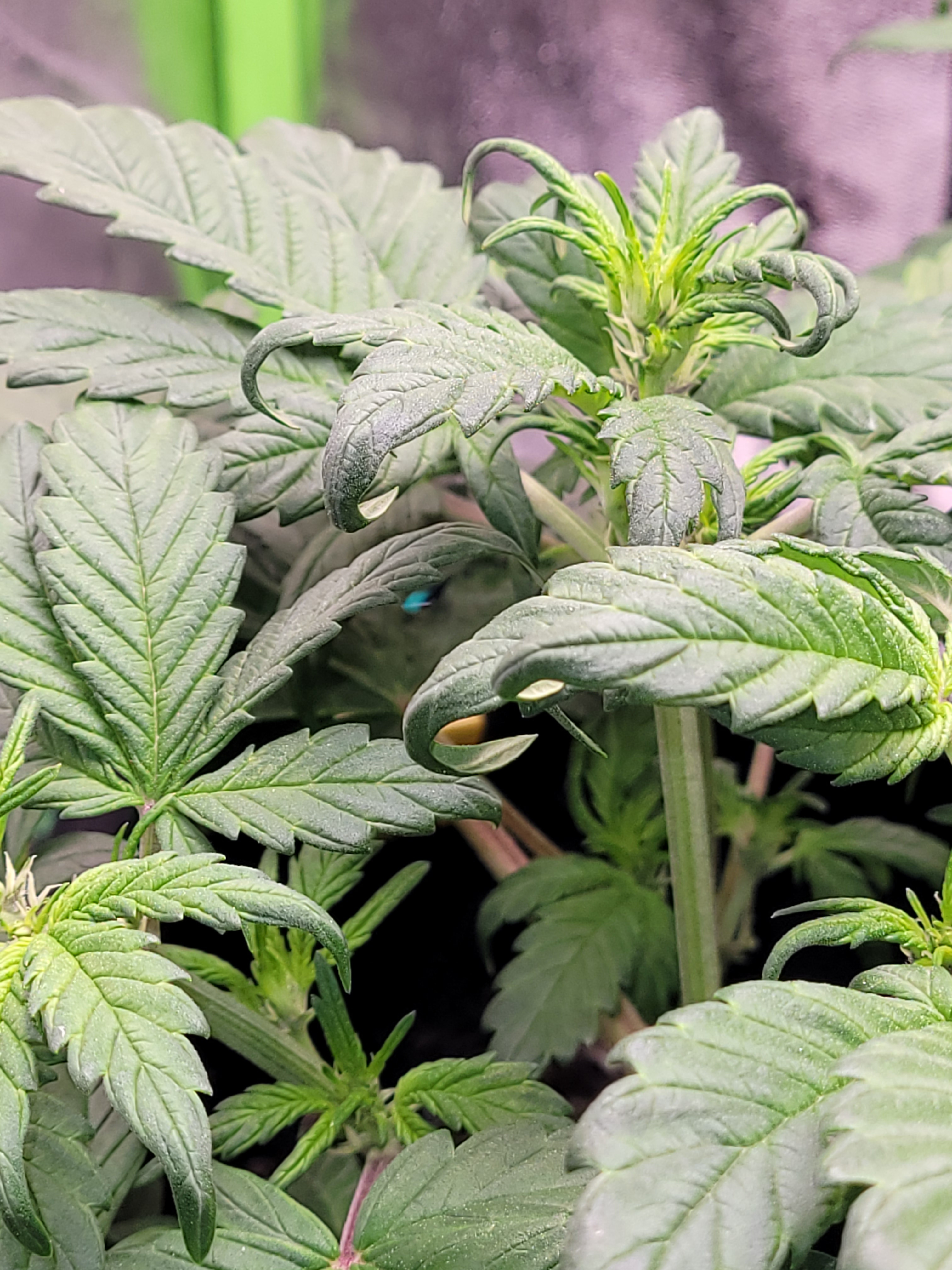 Growing 3 autos in tent. Pure Red CBD autos from Sweet Seeds. Been growing for 6 weeks, just beginning to bud. It is a short stocky plant - not at all what I'm used to growing. Almost all the leaves have a curl (under) to them.