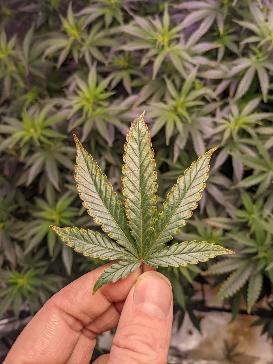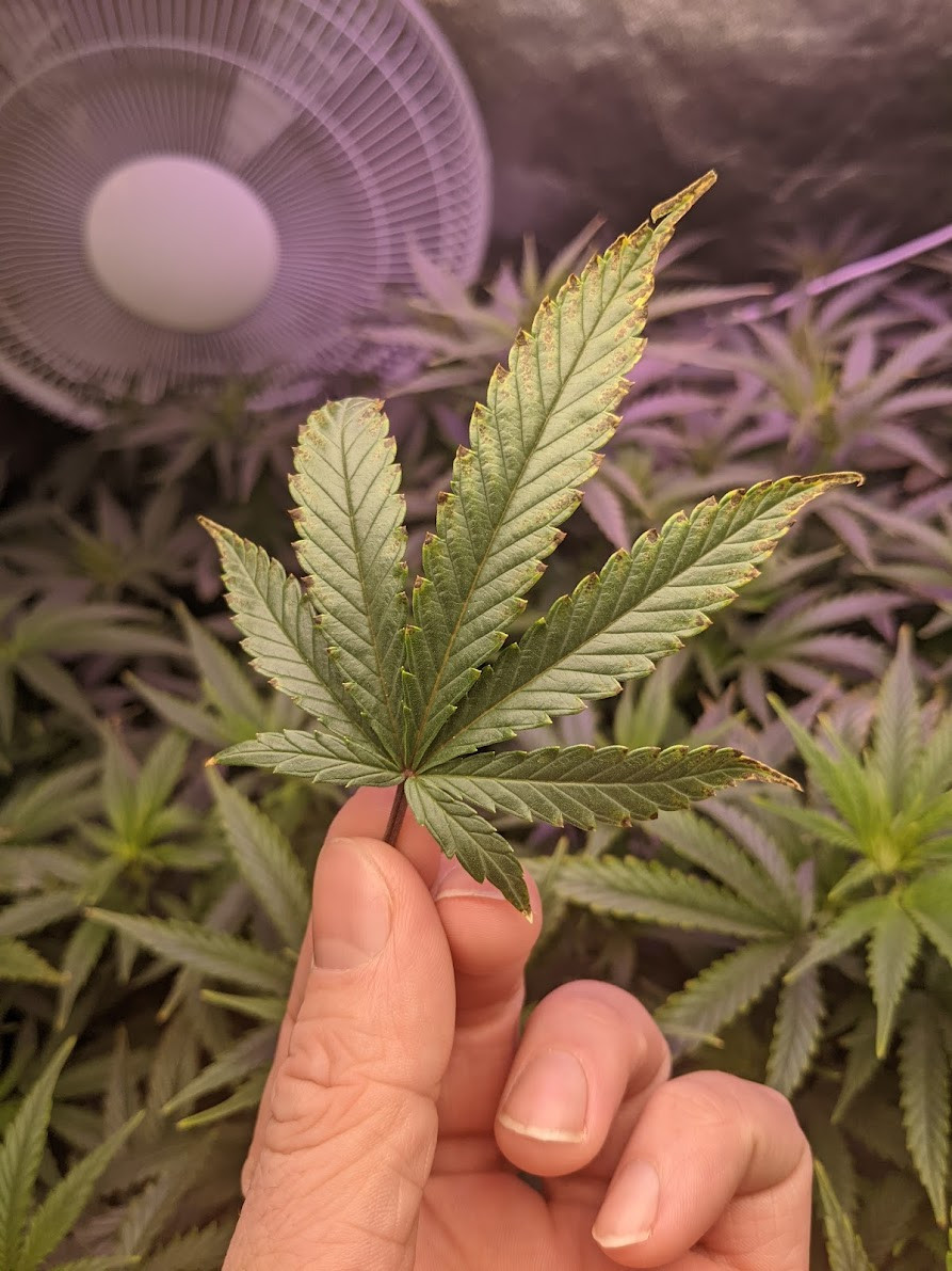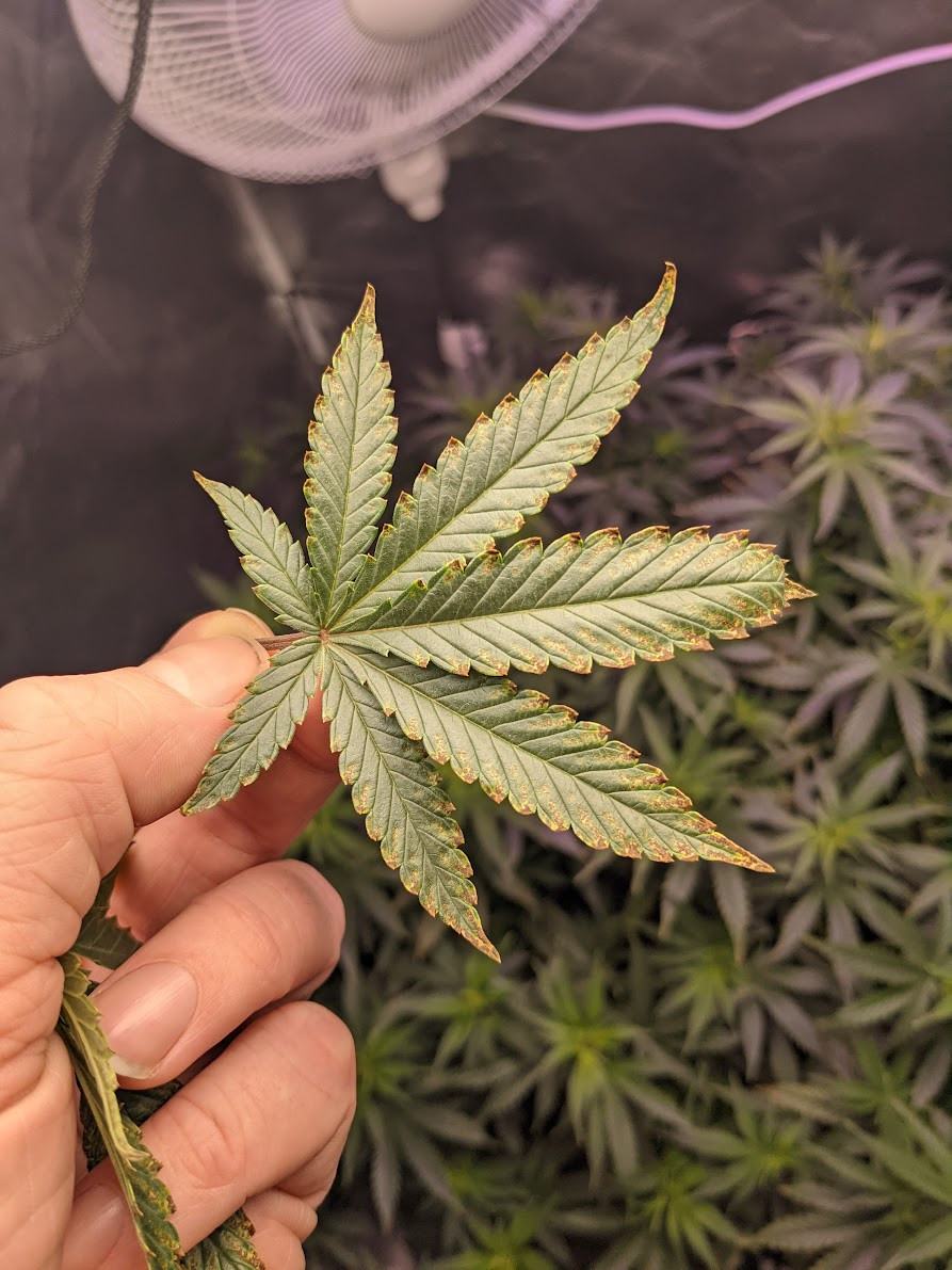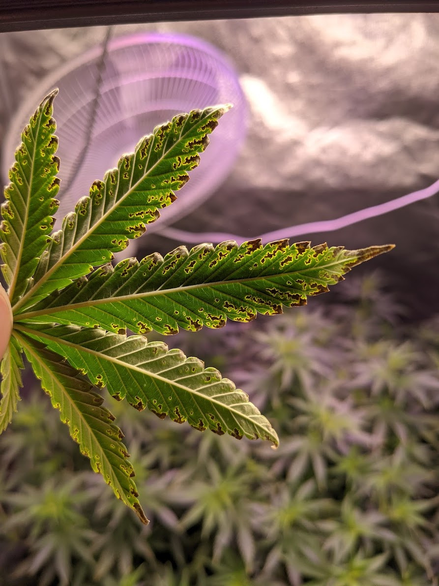 The problem I'm running into this last week is these burnt tips/burnt looking spots in between the veins starting at the very edges and working its way in. It's not on the whole plant, mostly seems to be on medium-aged growth right in the middle of the canopy - nothing too extreme on the new leaves, and some of the older ones I've lost entirely when they just go yellow/are super easy to brush off the plant.