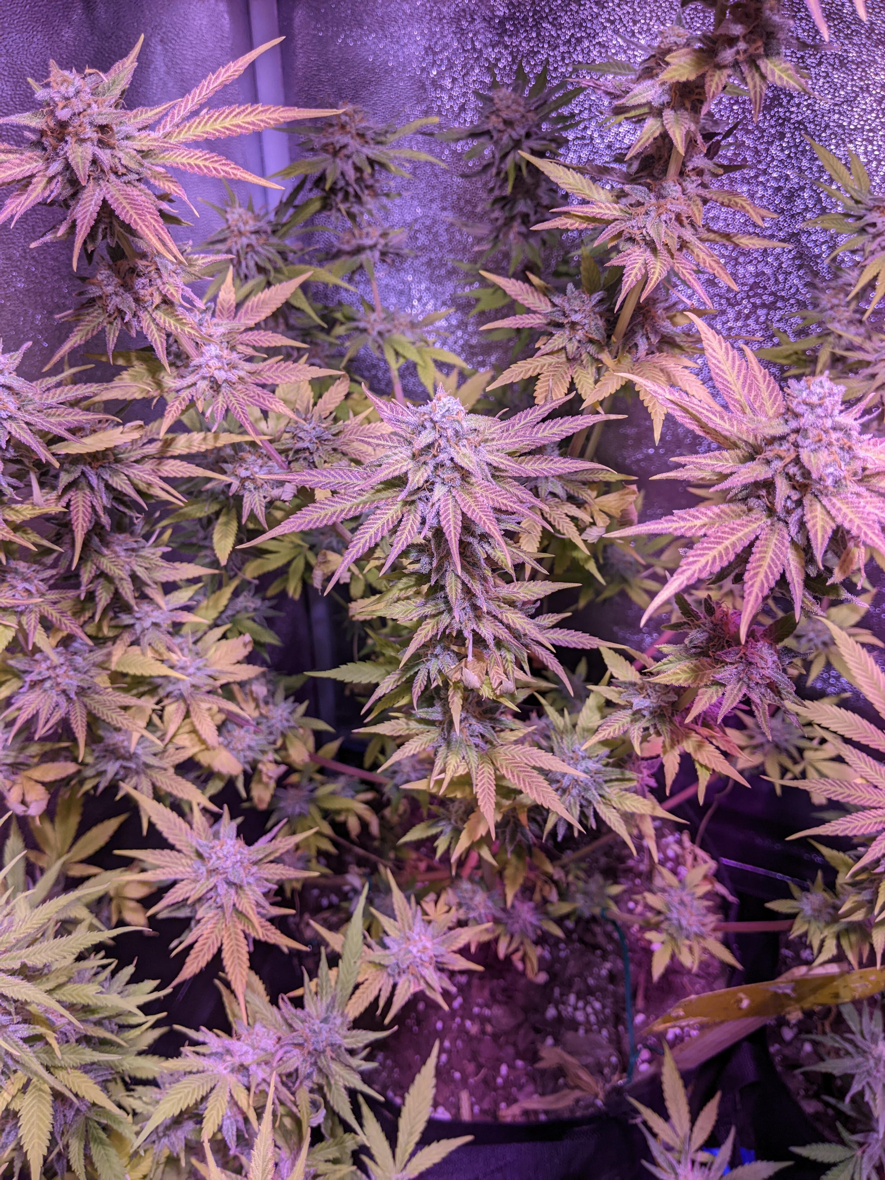 The plants are in 5 gallon pots except for one three gallon. The soil is a mixture of 1/3 used mushroom bedding, 1/3 top quality garden topsoil with no added nutes and 1/3 previously use soil.
