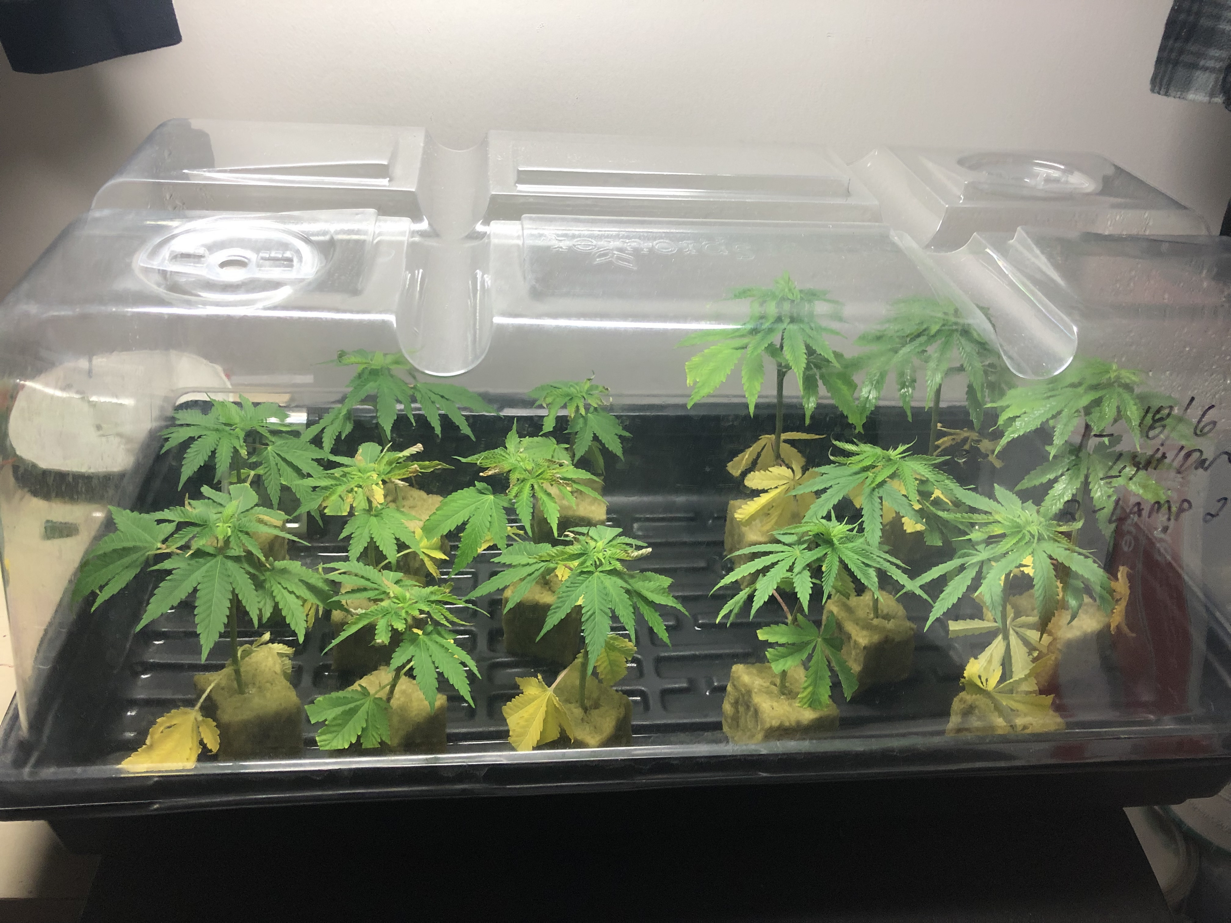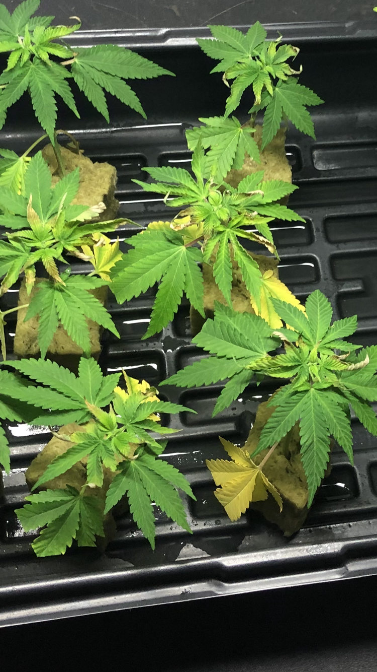 Hey folks, can’t figure out why my cloning procedure is not working to the 10 day root sprouting schedule I follow by GWE. Maybe I’m keeping it too wet inside clone dome or maybe too much rooting powder at insert to cubes? I try to use most bottom healthiest cuttings, new razor to cut 45 degree slice about 2 1/2” below 1st set of leaves, shave off harden skin at base of stem by new slice, dip in water, then in rooting powder and plant into cube and add a tsp of water at stem insert to cube. They start off wilted but within a couple hours are standing straight up and looking healthy. But-14 days now and only 2 of 12 clones are shooting roots. I also see like wilting and upper leaves dying.Any advise to speed up or get better response in the numbers?
