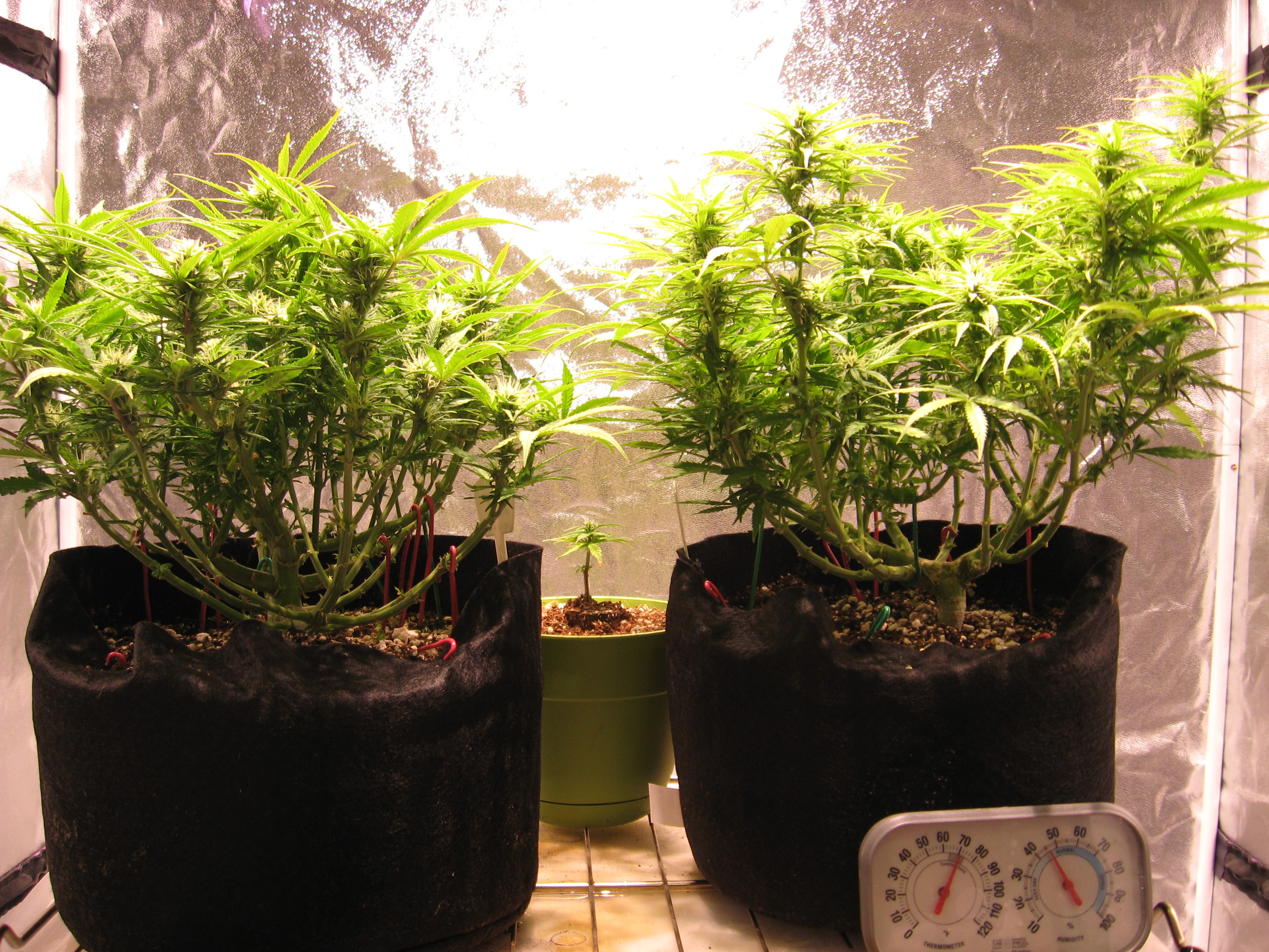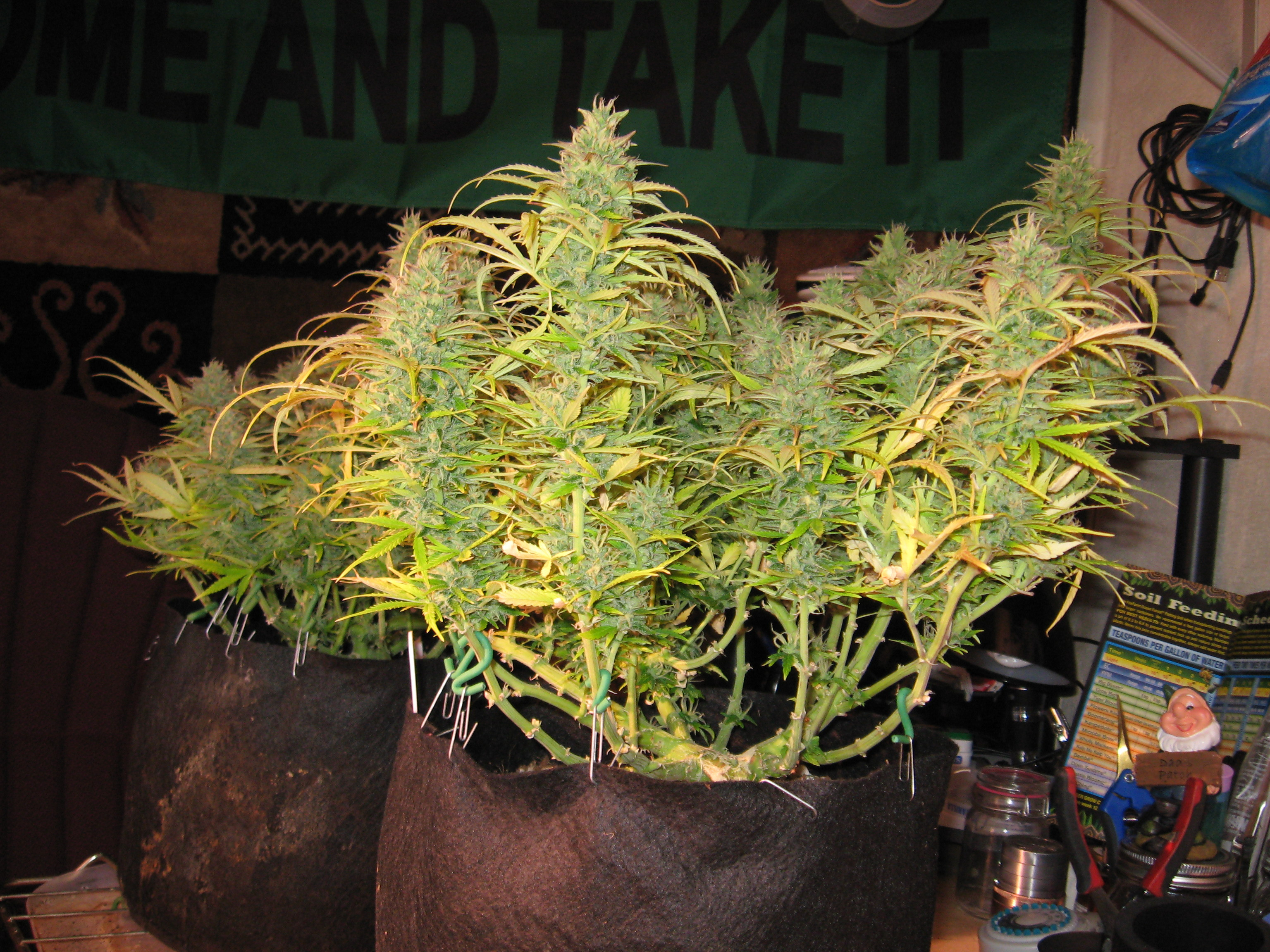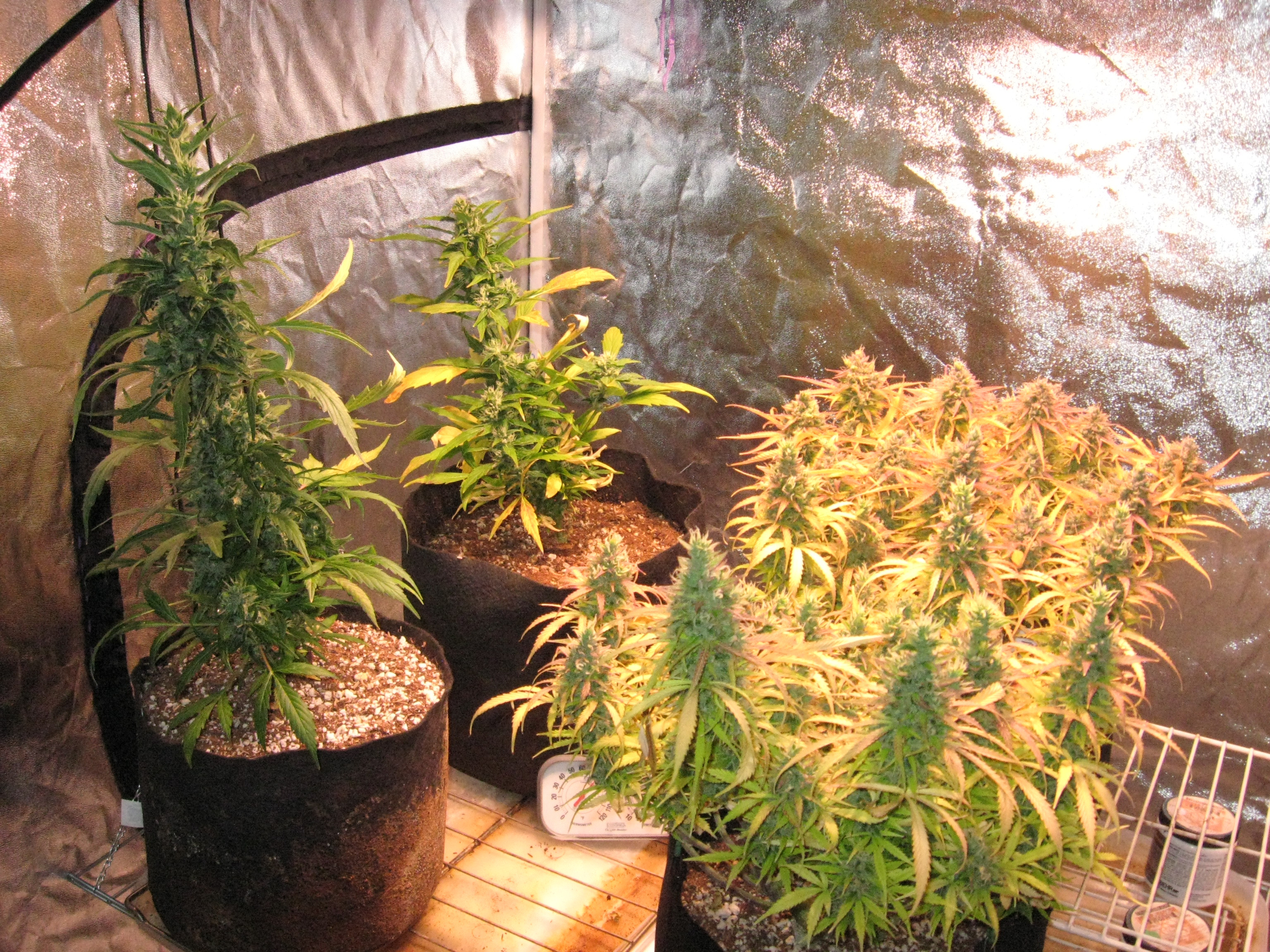 oldjarhead100 I tried my hand at autos awhile back,Sweet Tooth from the new guy. Ever the rebel, I did everything they say not to do. At around 5 weeks I trimmed em topped several times tied em down and spread em out,defoliated and lollypopped. Also cloned the tops.It added a month or so, but so what. I had fun. I didn't do anything to the clones but feed and water and ended up with a two foot bud. They were in soil in 3 gal. smarty pots under a 315-LEC 24/7. I didn't get a wet or dry weight oops, ended up with 11 quart jars 3/4 full to cure, at about 3/4 oz per jar. Here's a few pics. the tall ones are the clones. I called them my crash test dummys, but we had fun!