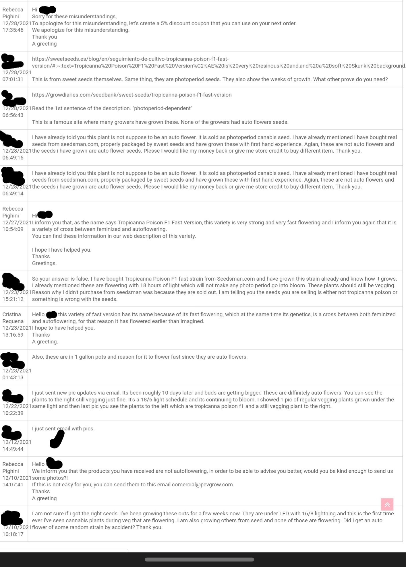 This is my review of pevgrow. I ordered tropicanna poison fast f1 strain from them and the seeds i got were auto flowers. I have ordered real tropicanas poison fast f1 seeds from seedsman.com that was properly packaged by sweetseeds not in those phony ziploc bags. I sent a message telling them my plants were flowering and it had only been 2-3 weeks. They were in 1 gallon vegging with 18/6 of led light. I also had other seeds being grown and they were still vegging. At first they sounded concerned, and ask to send updates in 1-2 weeks later. I sent updated pics informing them they were auto flowers and they tried lying, claiming they were autoflowers. I told them that that wasn't true since I've grown these already and know how they grow. I even sent links to growdiaries.com and Sweetseeds websites showing that the seeds should be "photoperiod-dependent". I asked for a refund or store credit to get new seeds and they offered a 5% discount on my next order. So ridiculous. Don't order from this place, they don't sell original seeds from the true growers. If you order from seedsman.com, you will receive authentic packaging from the seedbank that is selling their seeds.