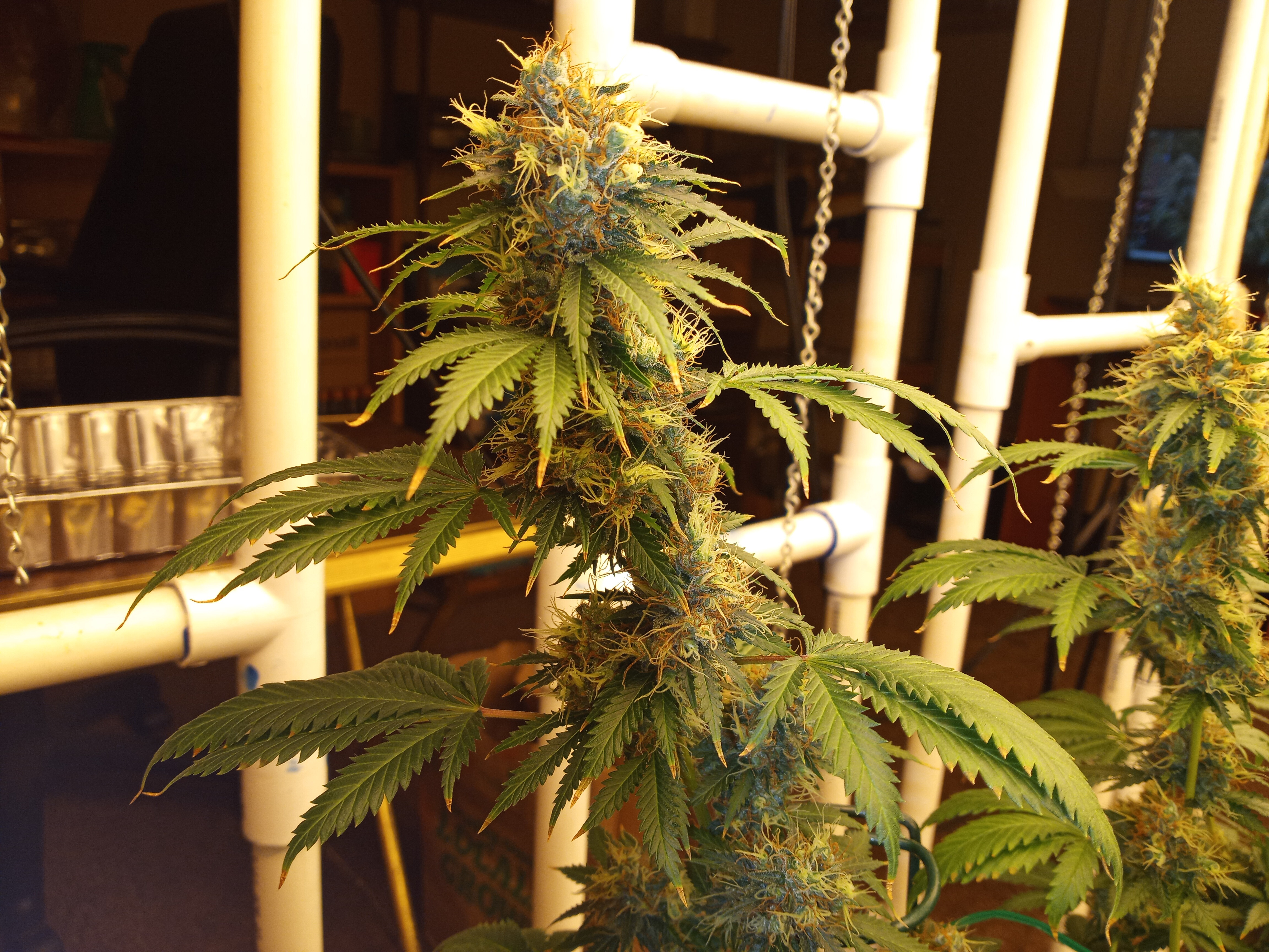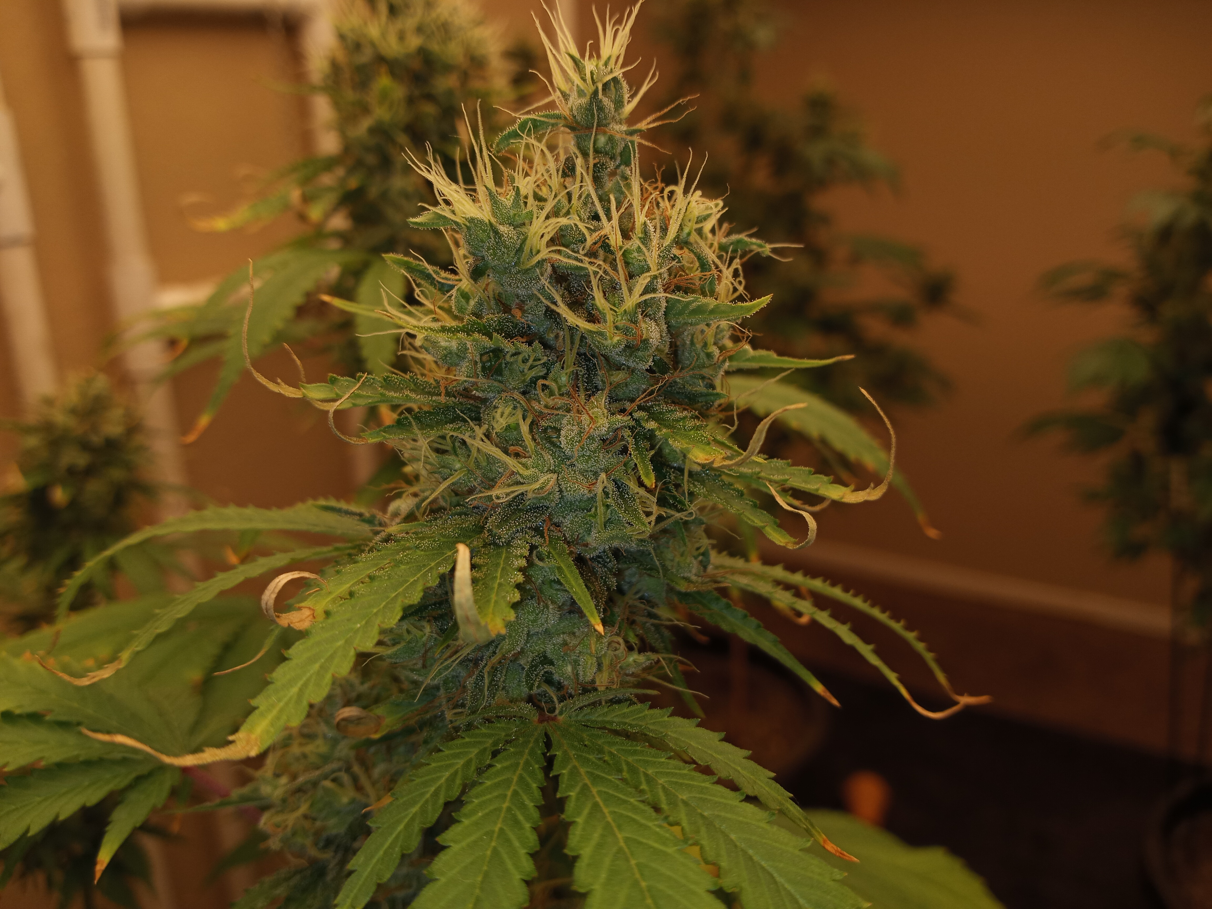 ***UPDATE*** Good morning! So today Sunday 05/15/2022, 3 left to harvest. By this coming Wednesday it will be 10 weeks into flower, the so called "Sativa harvest window"(between 10 - 12 weeks for indoor). I am now getting leery on when to chop because at this time before I have had plants turn and seed on me getting to this point in time. I have been inspecting these girls very closely now since Friday and no nanners, bananas, or ball clusters showing as of yet (so far, so good) and the aroma of old school skunk in the morning. These are bulking up really nicely and have only been fed plain pH 6.5 water to "flush". I did take run-off samples and my ppm per plant is around 250 - 300 (where I usually like it) The new growth has started to slow down a bit and not as much white as to colored hairs and they are starting to curl in. I'll have to take a bud sample and look under the microscope to see how far along they are. IF they are where I want it, they may come down sooner than expected.