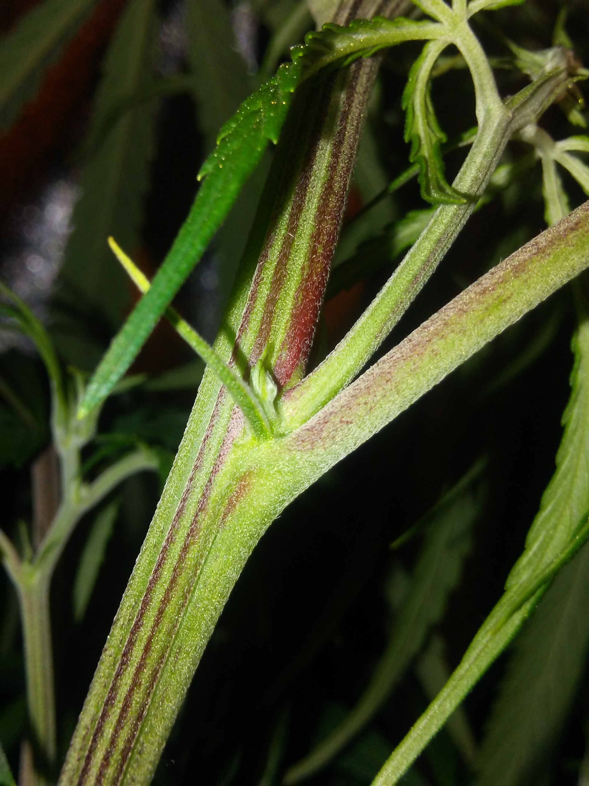 I cant take pictures till I move the plants into the new tent tomorrow. The growth spurt after I changed the lighting back to 16/8 a week later after sexing has caused the plants to grow into a thick jungle where you cant see where one plant starts and one ends other than this one sick one. I have a THC Bomb plant that is sick in a weird way. Every fan leaf from the bottom to the top has turned yellow, curled in and many turned brown and died but the off shoots seem fine. Its the fan leafs that are single and don't branch off that are doing this. The branches that move off into more sections are fine, except for the dying single leaf fan leafs. Soon as I move the plants into the new tent, Ill take pictures.