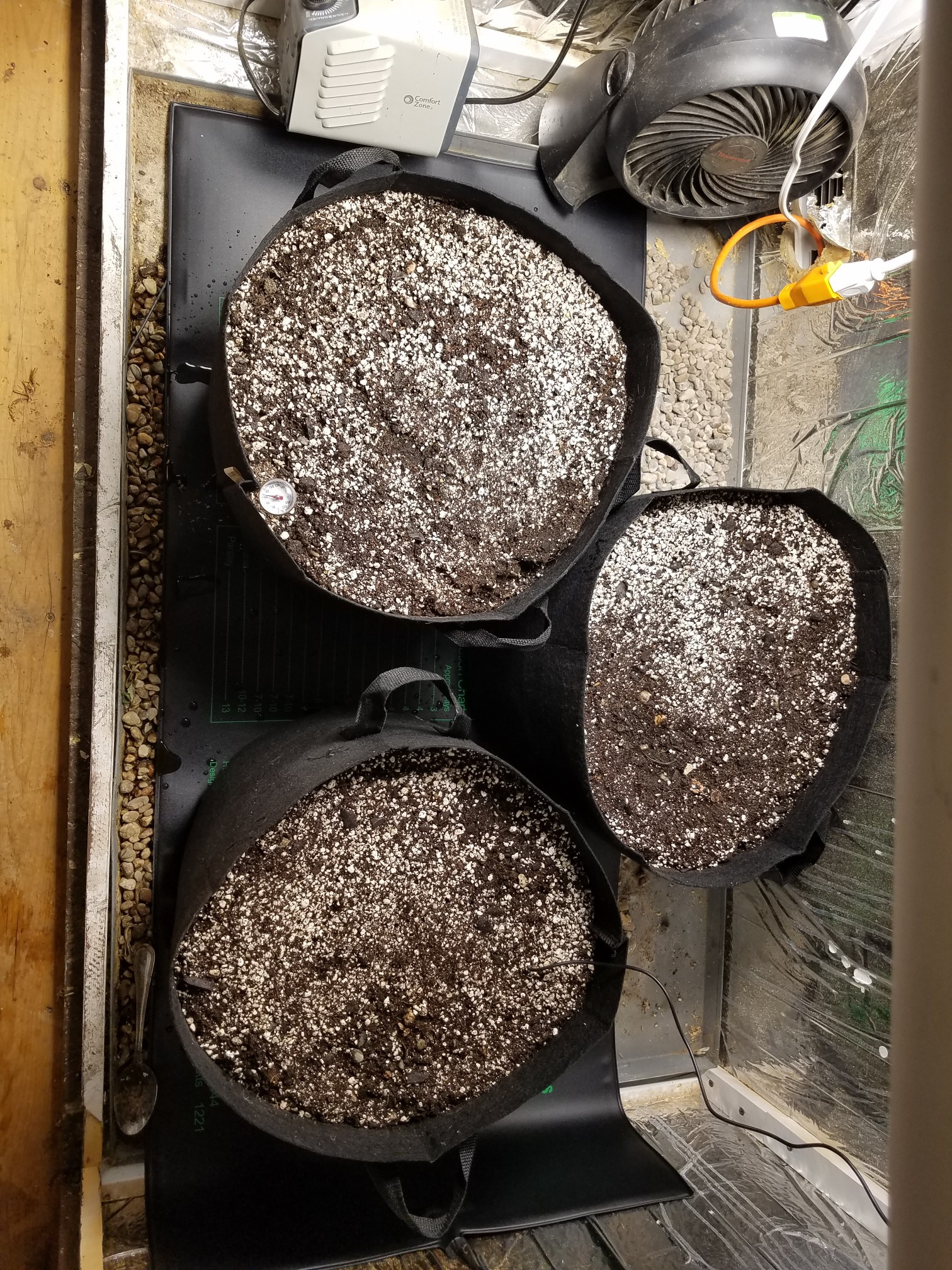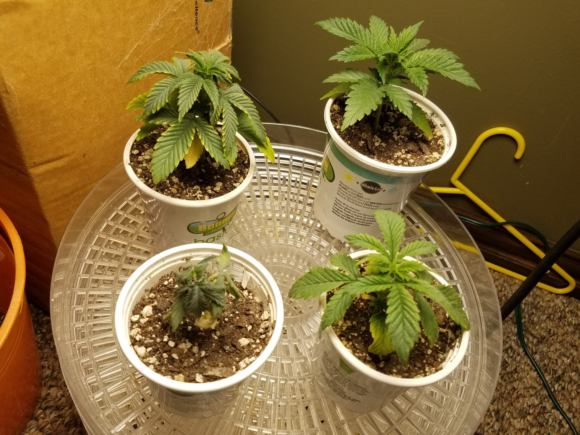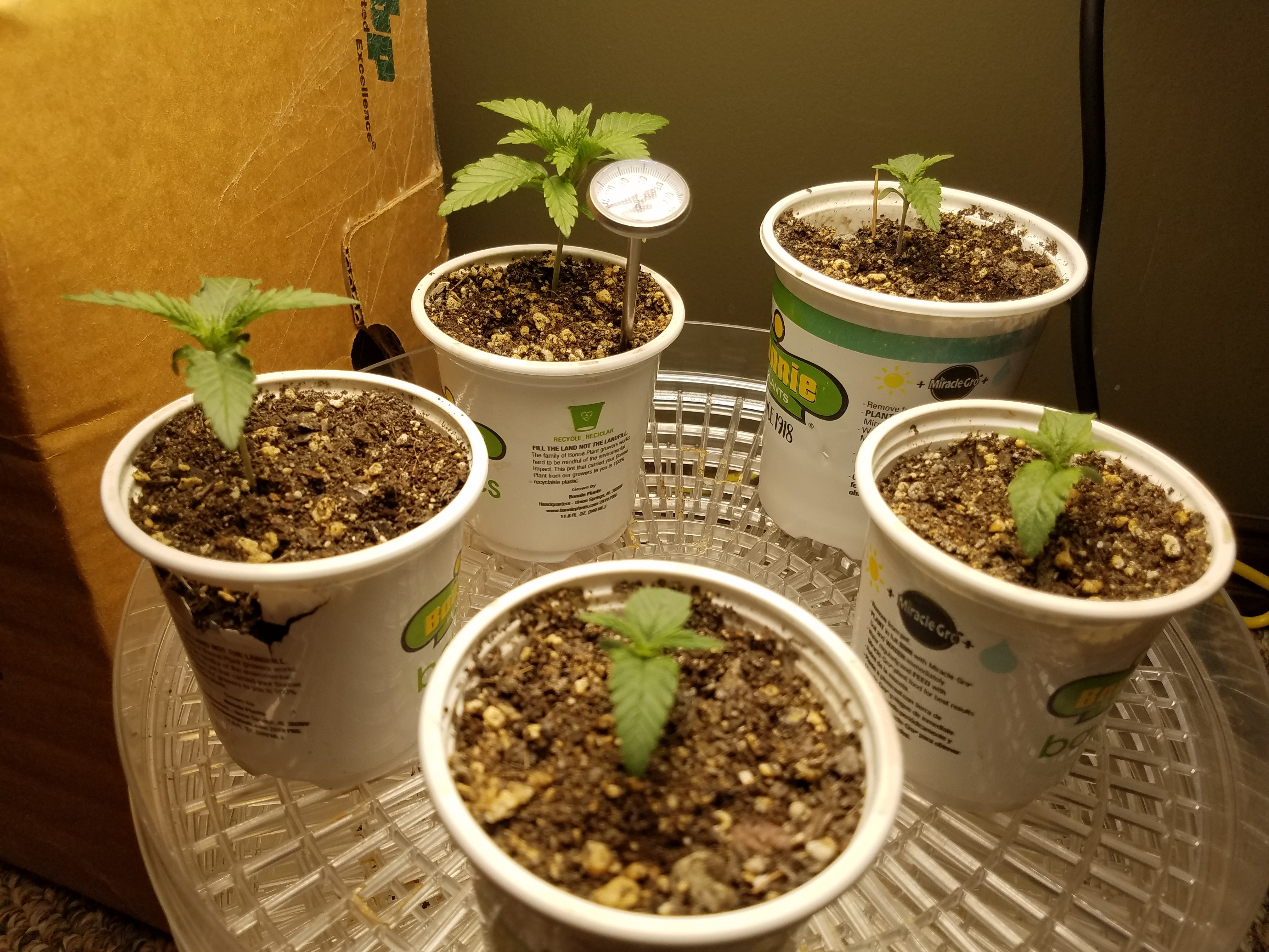 It's been awhile since I updated but unfortunately not uneventful in some respects. My little girls have not been well starting about 2 days after I gave them an early light fish tea at a week. They began to droop and exhibit signs of nitro toxicity turning darker green with the Claw. At first sign I thought they were over watered so I let them dry out with no change then I watered to full run off and let dry again with no change. I was hesitant to transplant when they were sick but did so as a last resort cuz they were stunted. 24 hours later they were standing tall and wanting light so I increased to full 315 w from my 3 105w quantum panels. Day temps are in the low 50s. Outside temp where my cabinet is located has been mid 20s last several nights but inside with a heater ambient was 68 degrees this am. A large heat pad is keeping the pots at 68 to 75 and the quantums add 2-3 degrees each. It's working well but I'm dreading the next couple months electric bill. I've already made my share of mistakes this grow so let's hope it gets better! I fed too early with a nitro rich food in soil that was already mildly rich in all the elements. I'm enjoying growing in soil but I'm finding it has a whole new set of challenges in itself. FUN!