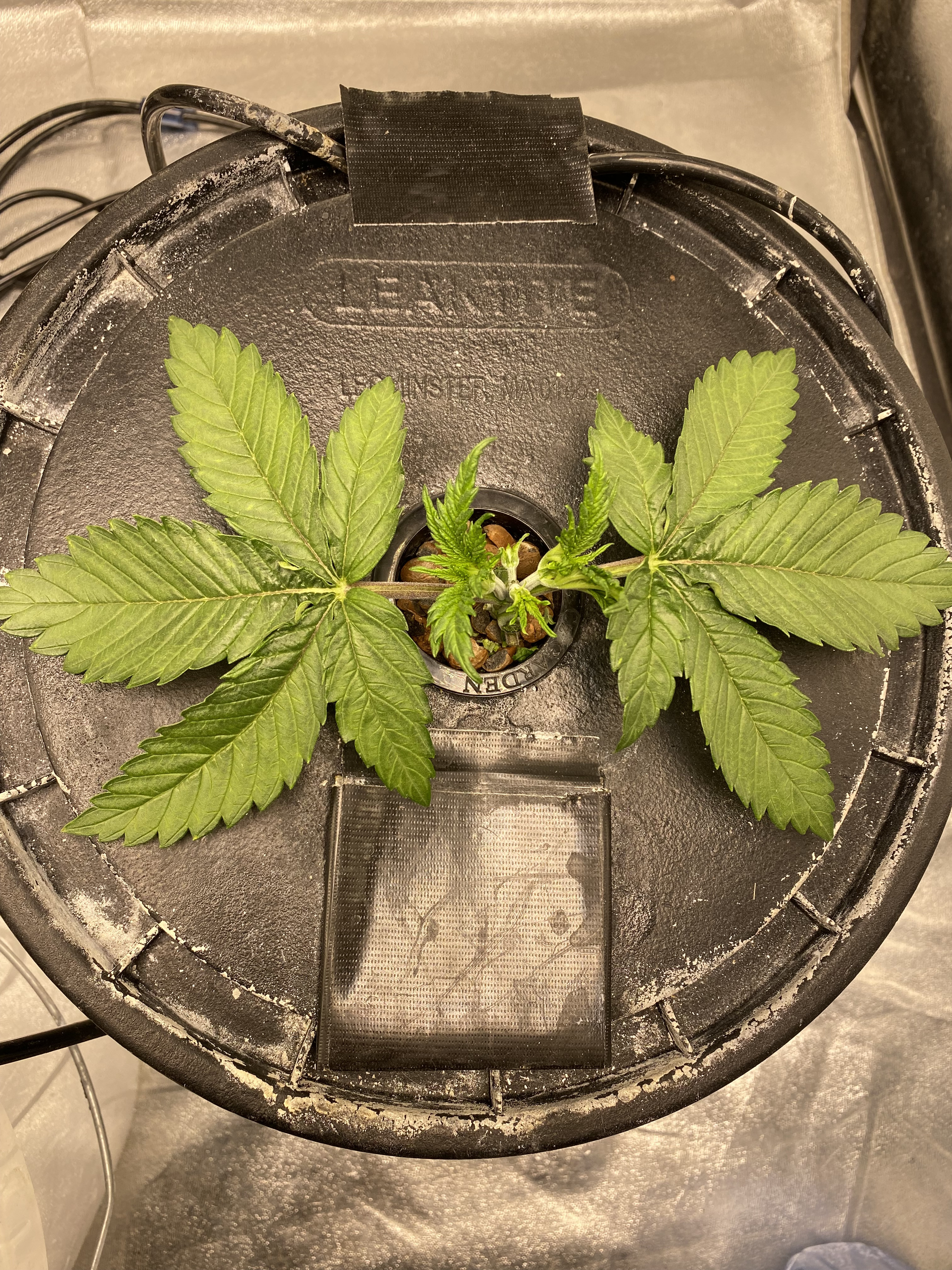 The purple bubba is looking fine and working on her 4th node at 3 weeks. The other 4, critical mass, are 5 days behind working hard on their 2nd node. I don't see roots at the bottom of the solo cups yet but very soon I will transplant to 7 gallon. I'm sure your all sick of the baby pics but it's for the record.