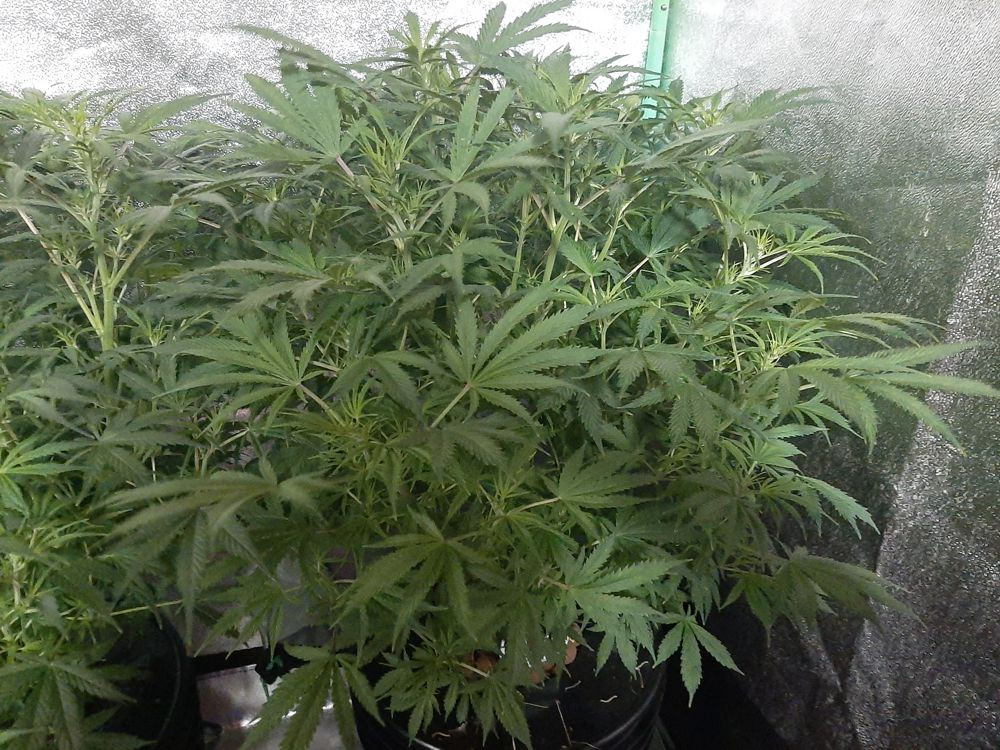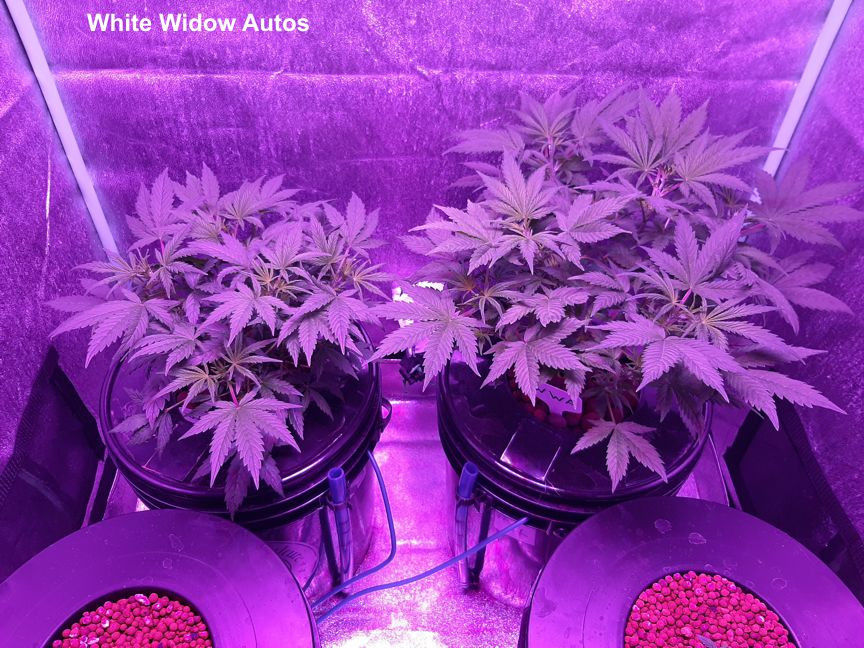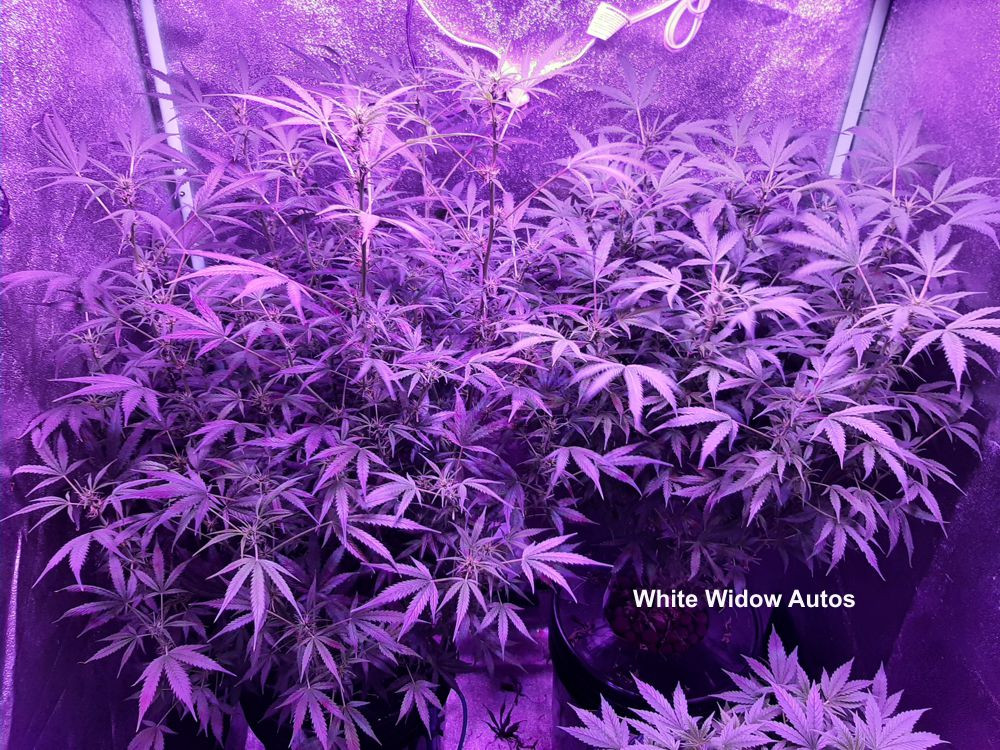 Here's a couple of pictures of my current grow. The pics are of White Widow autos and White Widow photo period. The autos are starting to show small white hairs so I imagine that they are getting ready to bloom. They are 5 weeks from germination and have been topped and defoliated. The White Widow photo period are 6 weeks from germination and have also been topped and defoliated. I think that I will defoliate a little more because they are so bushy. They will be switched to bloom around Feb. 1st...