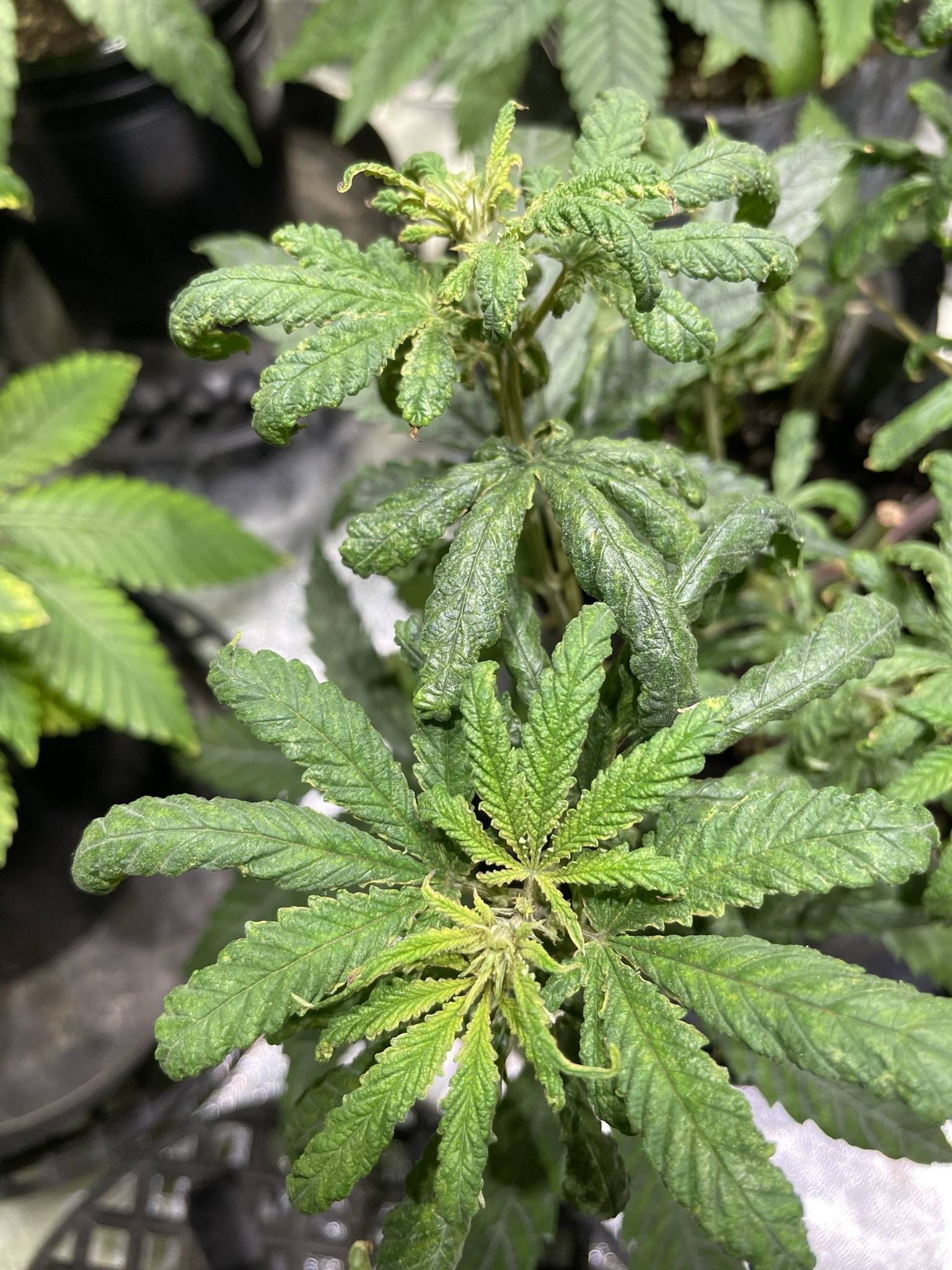 I took down all the sick ones in veg on Sunday and transplanted all of the seedling that were big enough to 1.5 gallon pots. All are doing well but Alien Rock Candy is showing just a bit of the same shriveling but only at the top two nodes. I topped her using fingers instead of trimmers. I may try adding some basalt rock dust to see if it stops all of that. Who knows, maybe it was an actual boron deficiency the whole time but that seems unlikely. I'll check pH tomorrow just to be sure but the rest of the plant is fine - the lower growth nodes still look good.