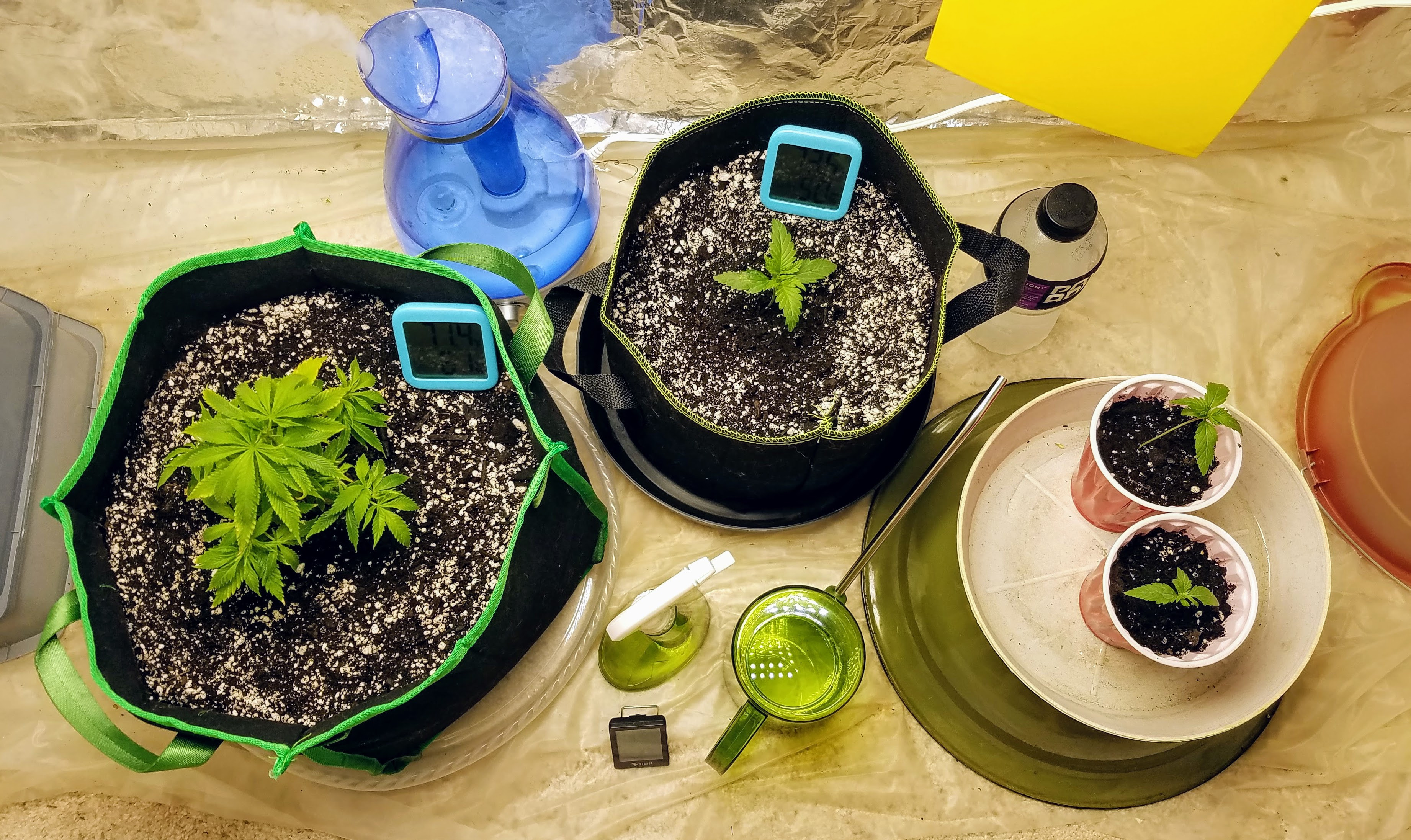 LemonBud - I had a sativa seed in a coco starter then transplanted to a 5 gal bag, I had to dig out more SB and put more CoM Potting Soil, not their seedling soil, around and under the seedling to save it from the hot soil. Figured I could also use that soil for herbs or outdoors. The other three plants were White Widow fast fems: two were started in CoM potting soil in Solo cups then transplanted, the other seed went directly into the final bag. I did the seed/water soak/wet paper towel/baggie/tail showing when I started the three indicas. I had to look at pics to remember. I added extra perlite to the SB. I also had Solo cups growing basil and marigolds in CoM potting soil (off to the left) in my last picture before I got sick. Pictures are from 8/29/21 and 9/25/21.