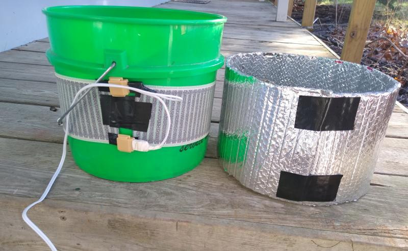 I rigged up some bucket heaters this fall. They are working great. Still learning the fine details of them but basically It's a length of 4" Flexwatt heat tape and connectors with a two heater temp controller. Then wrapped in some insulation.