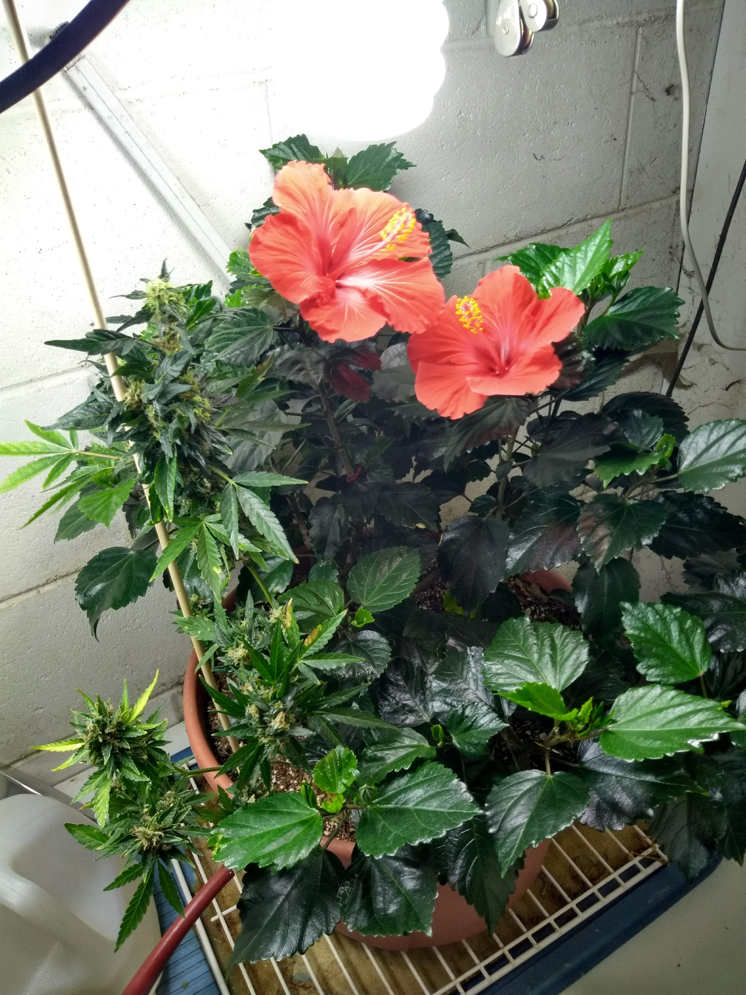My wife asked me to toss a dead hibiscus. When I pulled it outta the 1 gal. pot it was a solid wall of roots,so I got some of my already been grown in soil and re potted said root ball.So guess who pops up a few weeks later. When cold weather set in I put her under a big assed CFL. The hibiscus is getting a little pushy, But there you go. Two plants one pot.