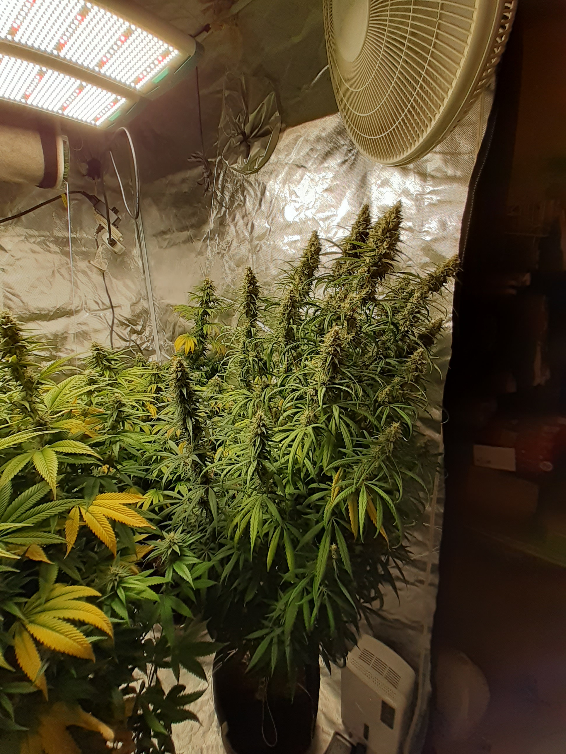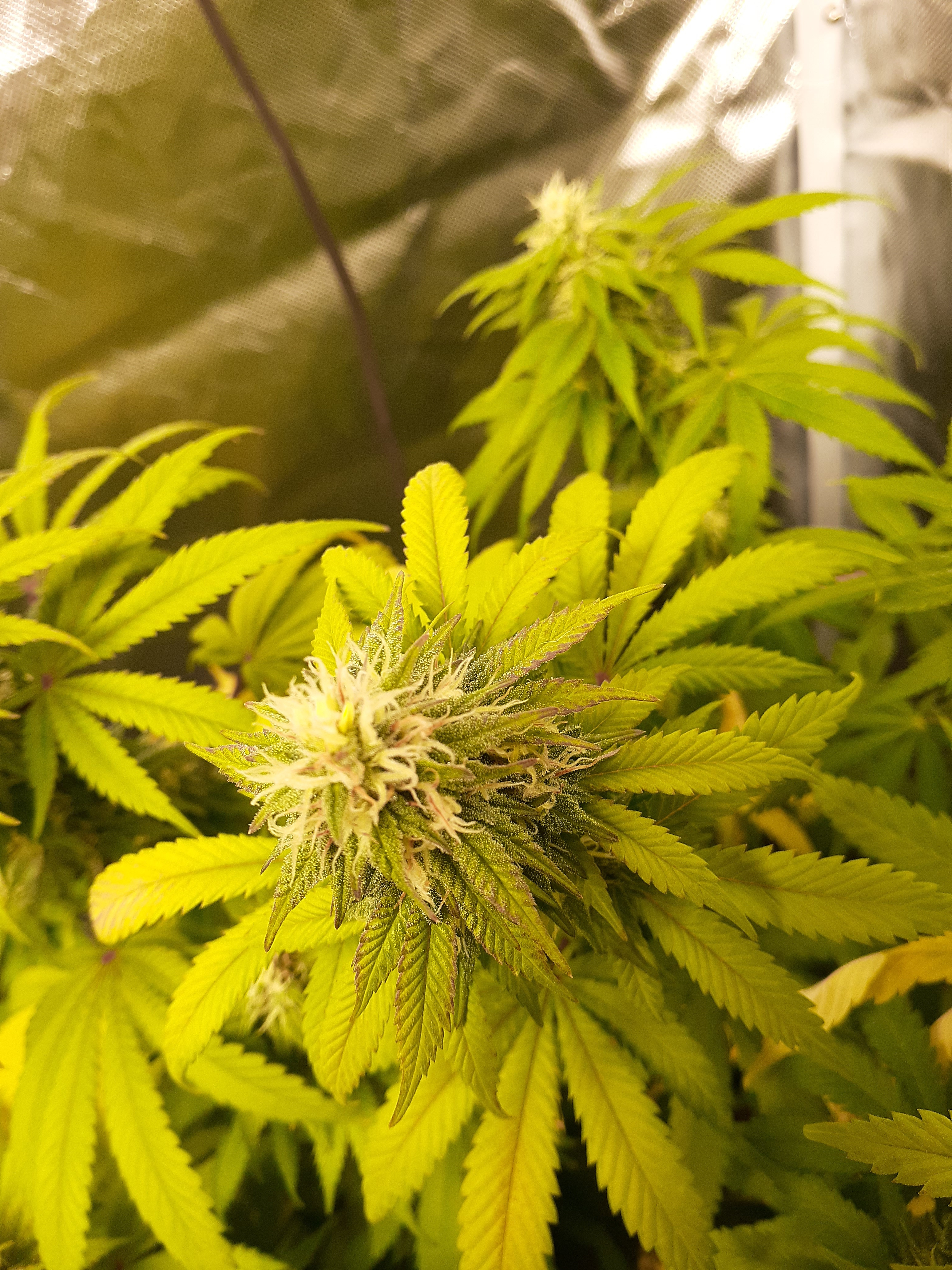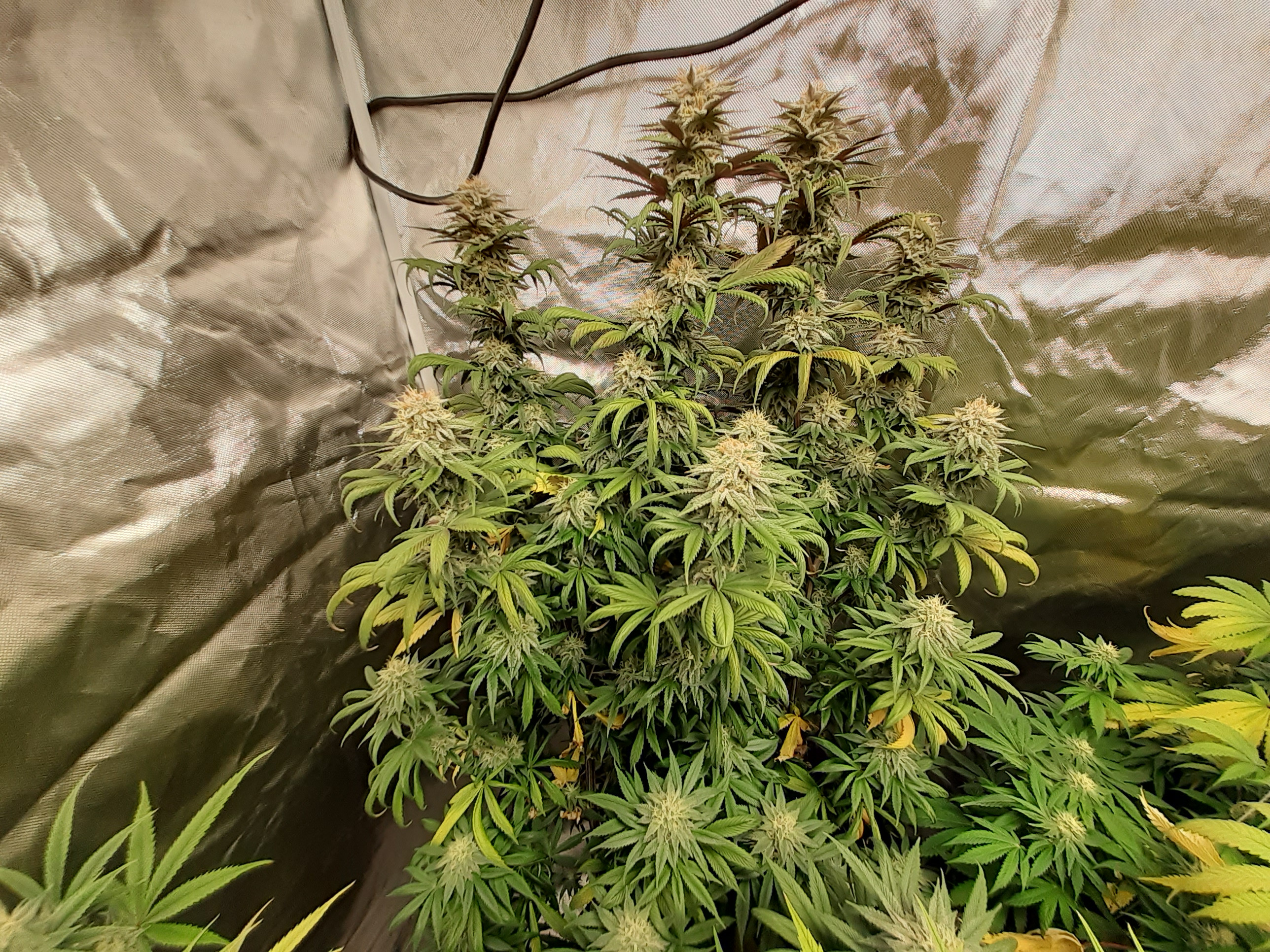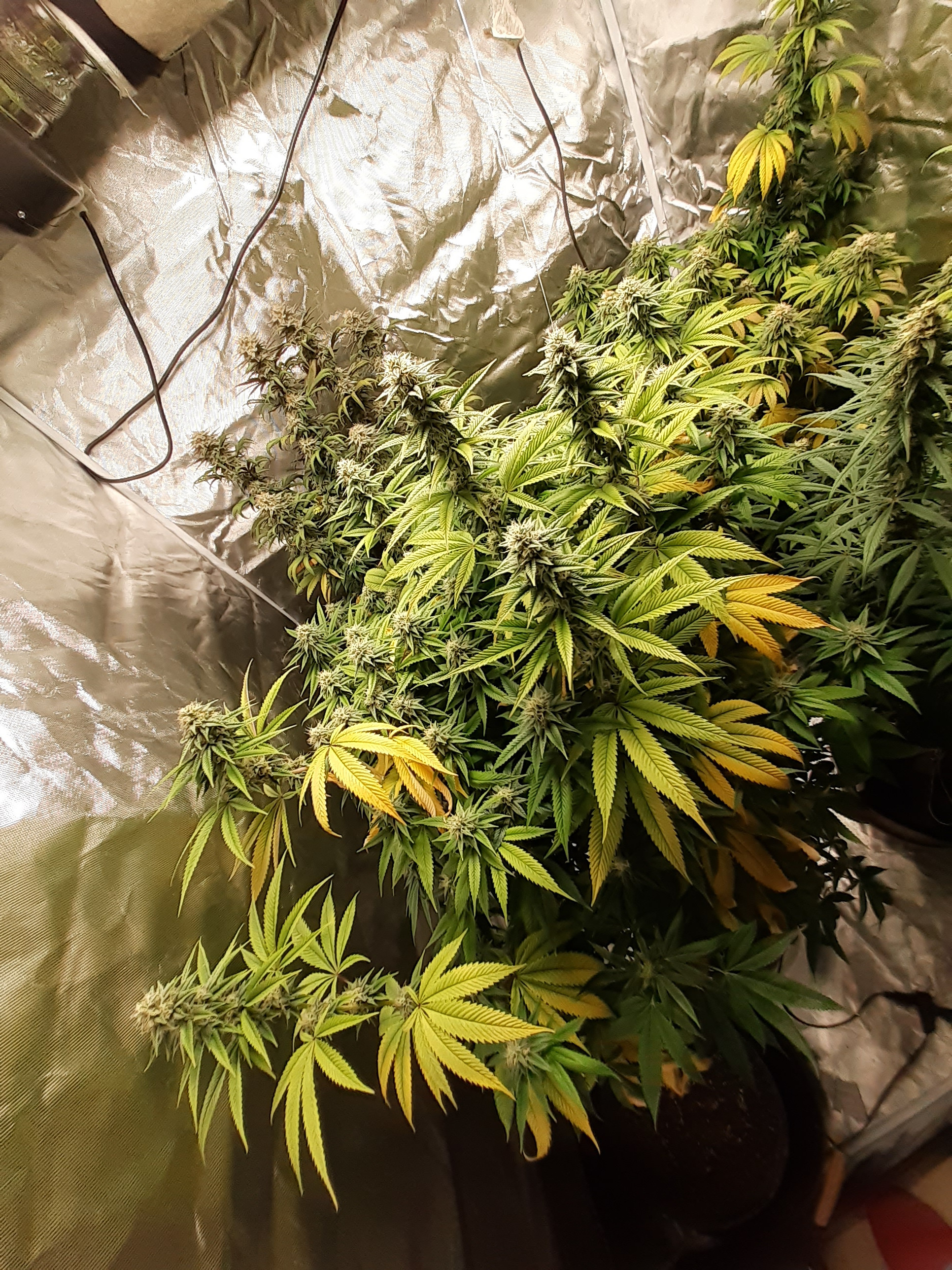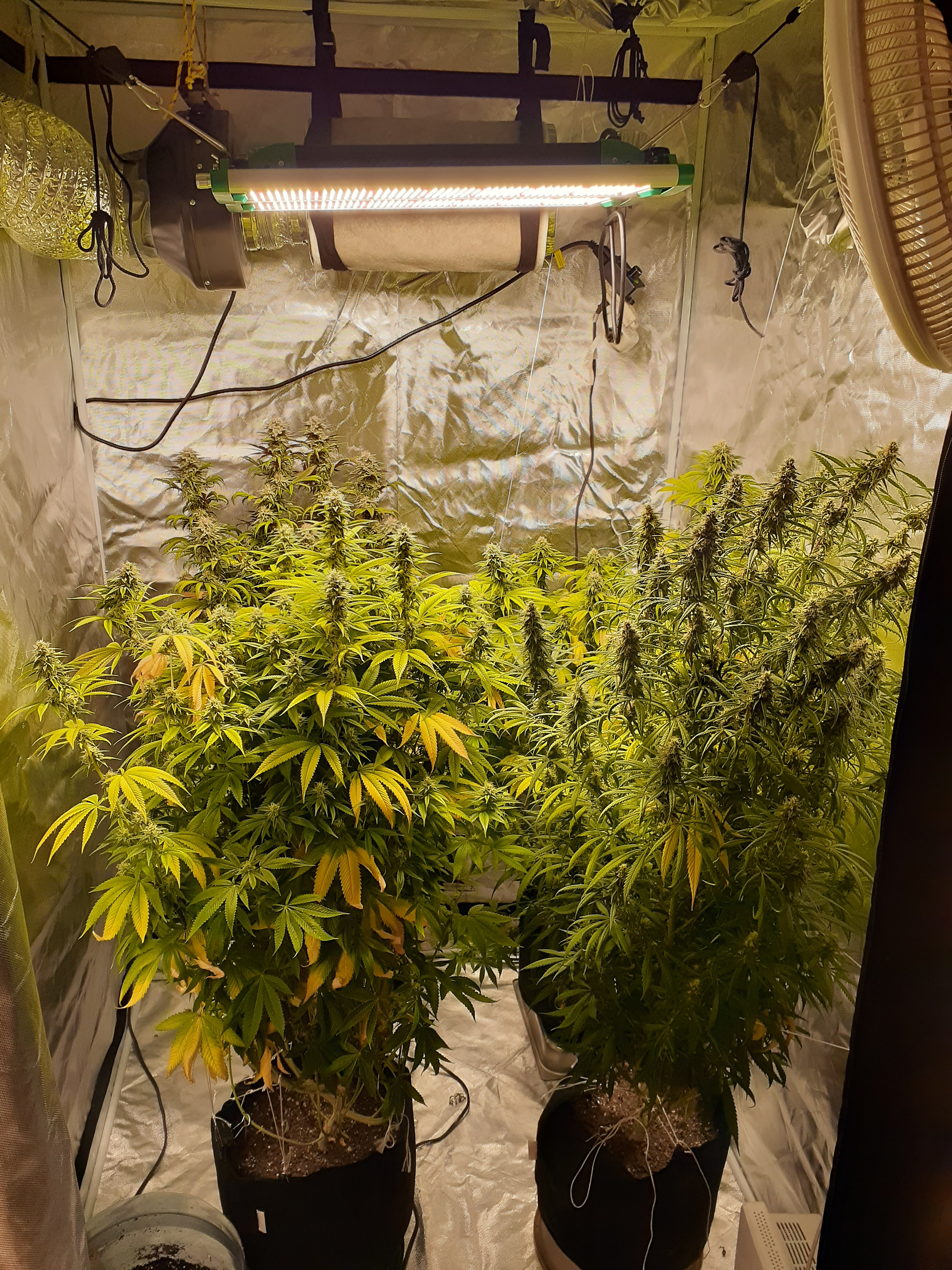 So I'm estimating that I am approximately 6 weeks into flower. Now my girls are really starting to smell great. I got three alien wedding cake seeds from some dispensary sack seeds I found. And one random seed that was given to me by a friend. Set under an aosbeic 4000 led grow light. Has been an awesome light. 4x4x6 tent. 6in inline fan with carbon filter. Happy frog 5gal vivosun fabric pots.