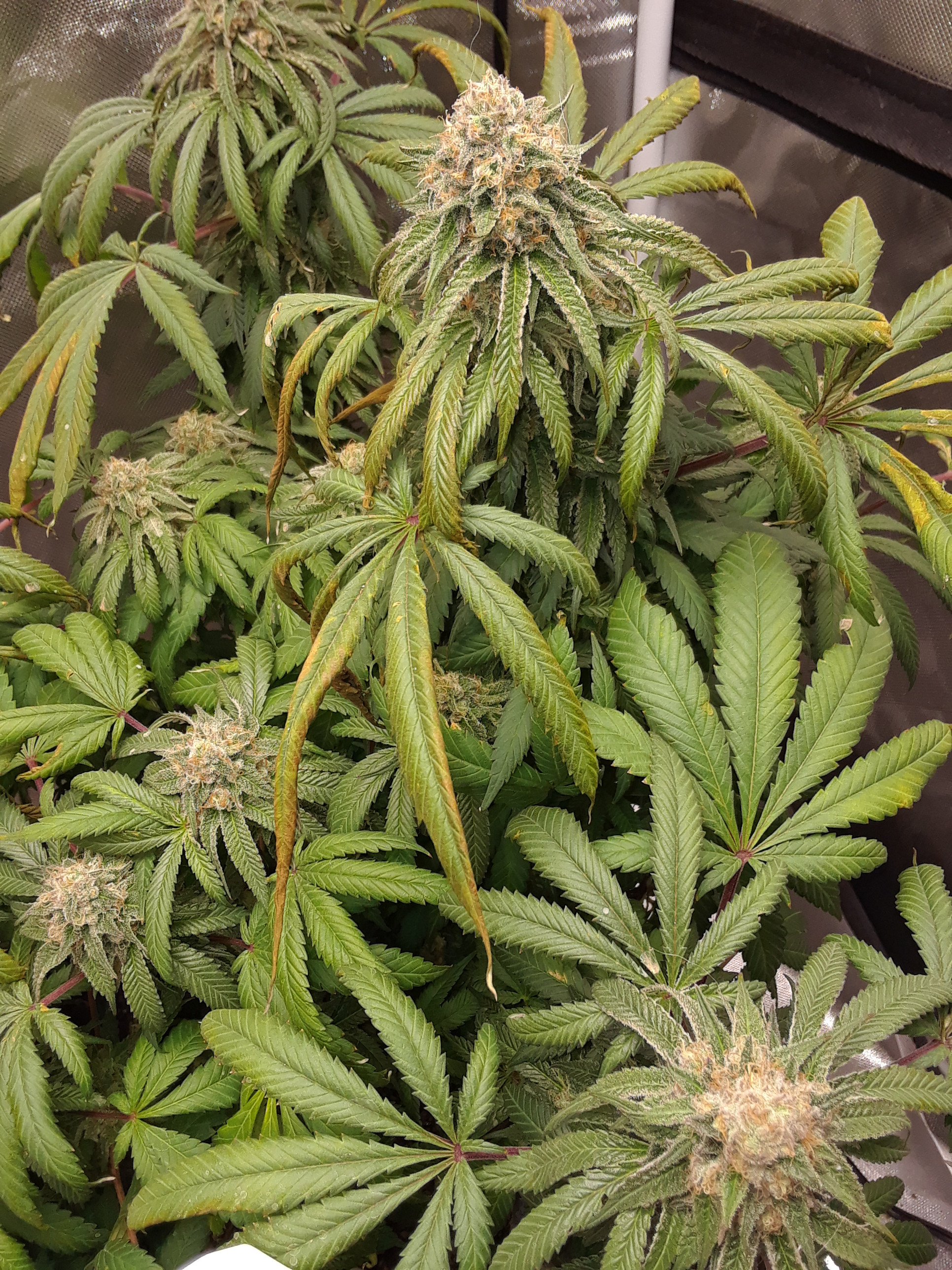 And the right front plant leaves are turning purple, then yellow, before dying off. Again, it appears mainly on the upper fan leaves on each cola.