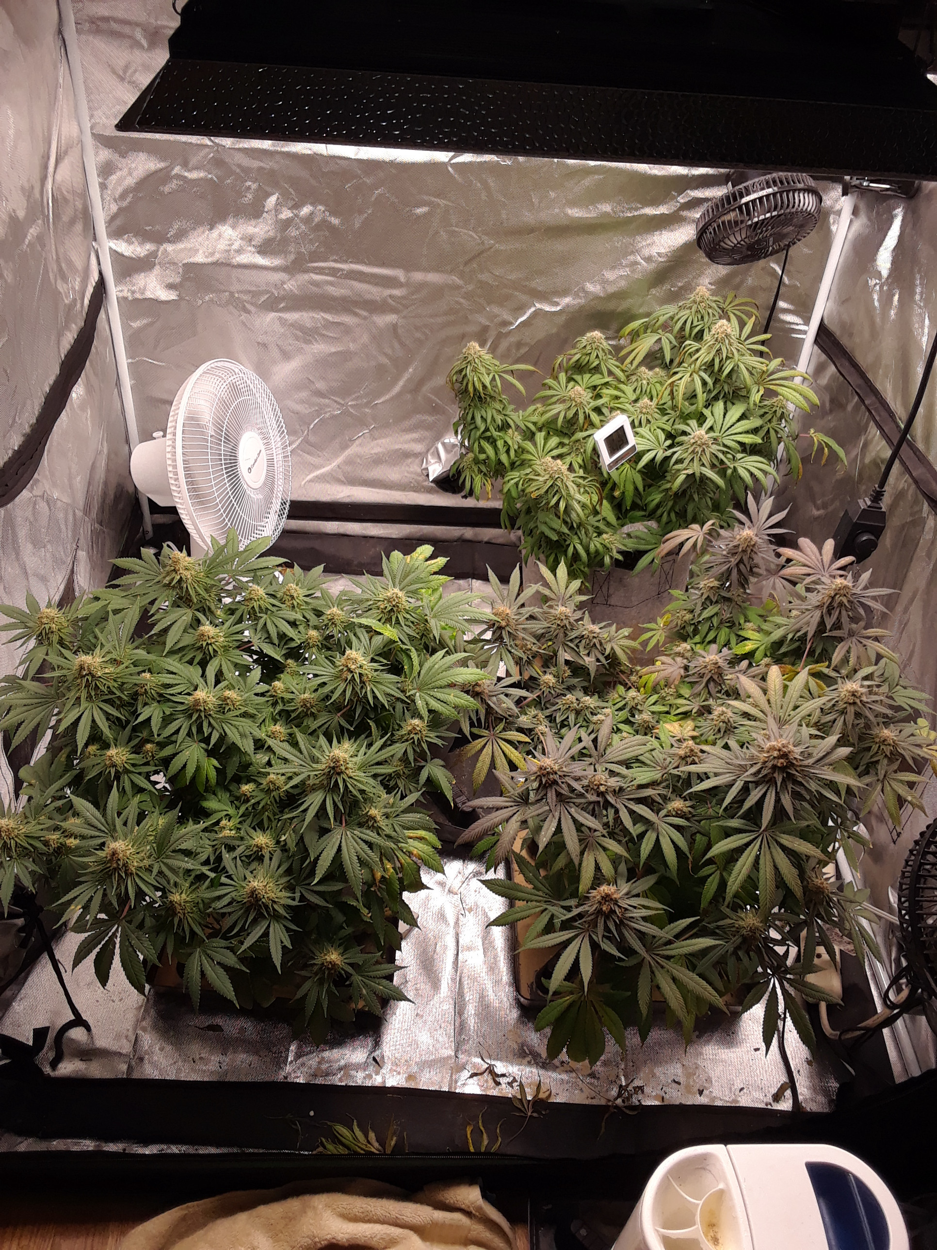As you can see, the right rear plant has all of the big fan leaves wilting and dying off, it seems like it's mainly the upper fan leaves on each cola