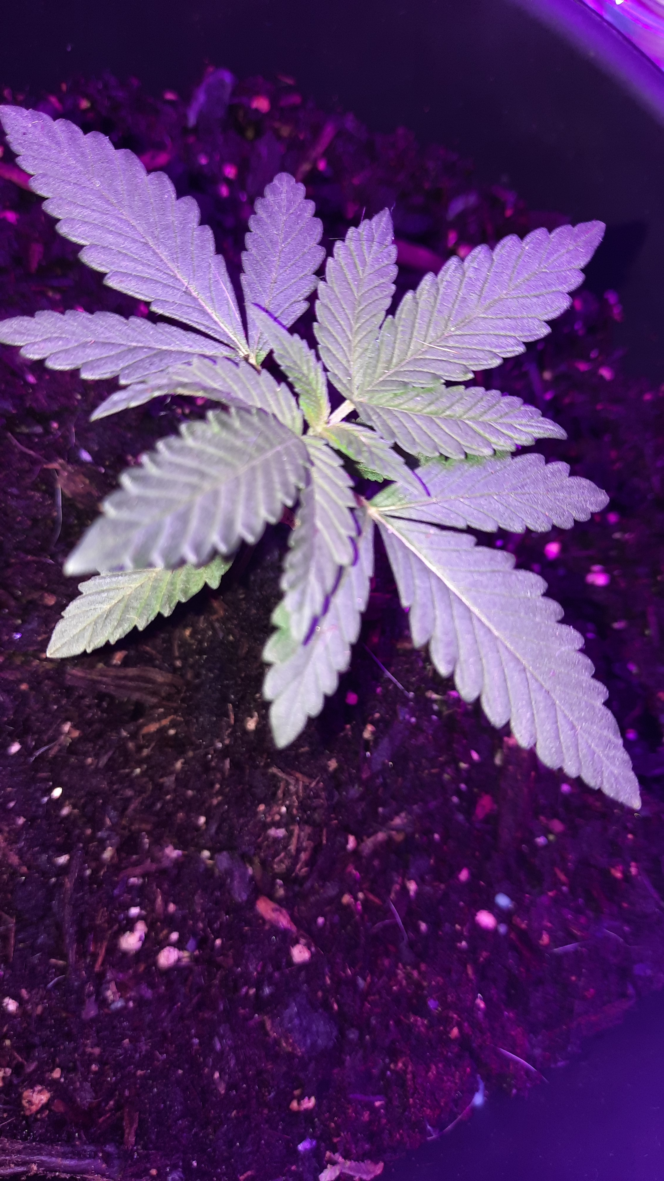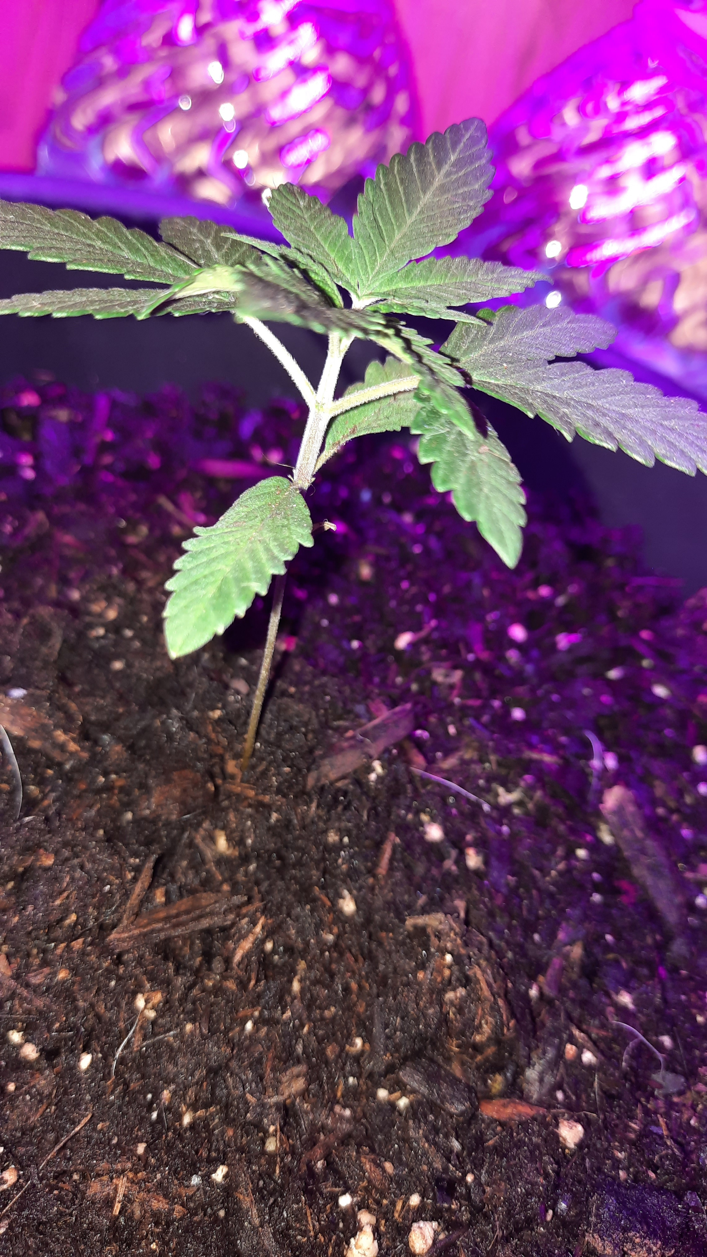 Seedling is 17 days old from germination, with a 75w "blurple" light ~15-17in above the top leaves set on a 18/6 light schedule.