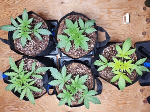 All are doing well except for the 3 laggards. OG Kush- this one is a problem child. It germinated, was planted, didn't come up with the rest of them. I went digging for it and found the head was pointed down, tap root up, then down, then up, then down, then up- all in a circle looking like a ring. Never seen anything like it. It is starting to show serrated leaves so I will let it continue but I had to show it which way is up. The other two (bag seed), one has stopped growing, and appears to have no center node, the other is growing fast, but also has no center node?
