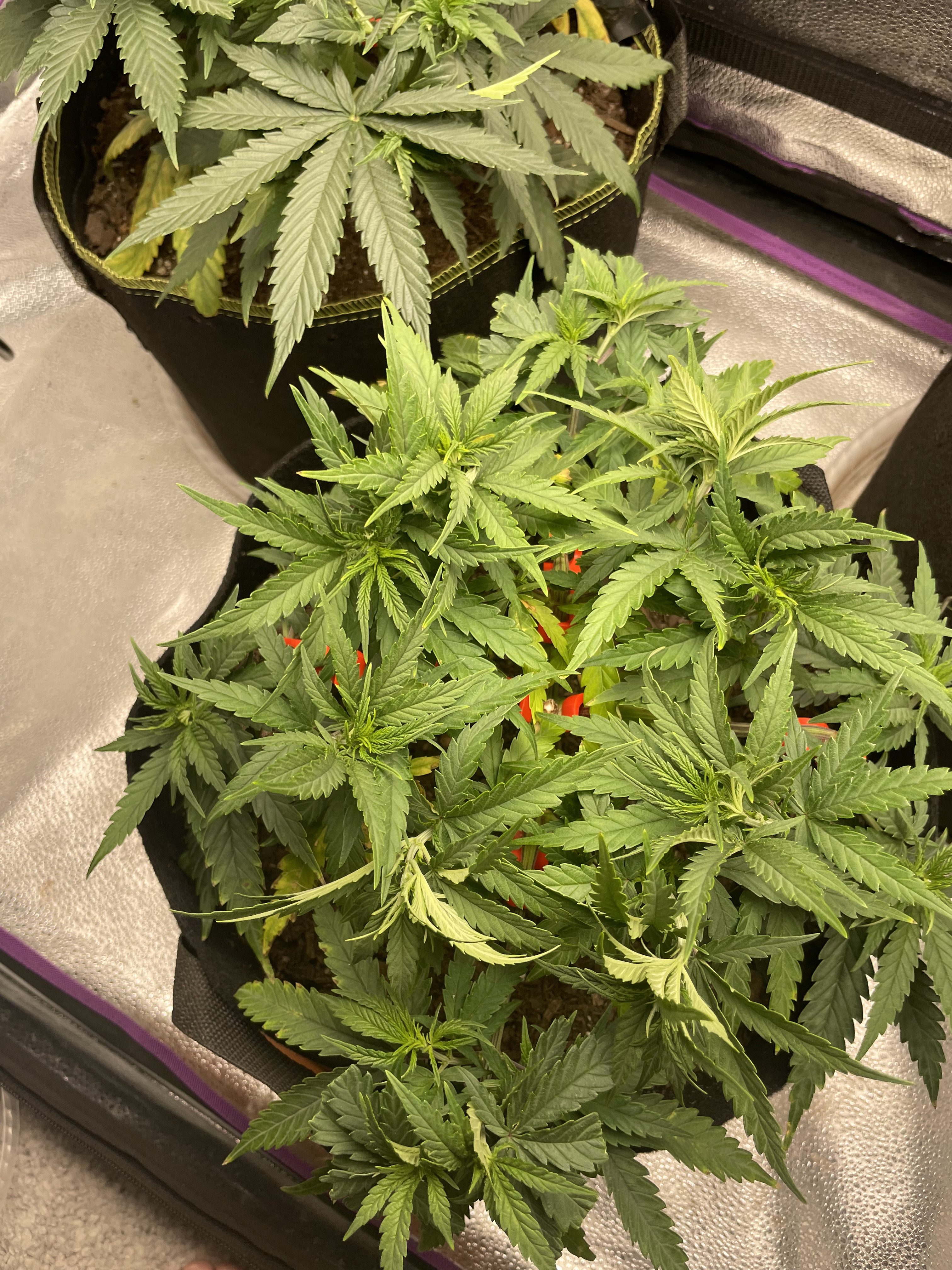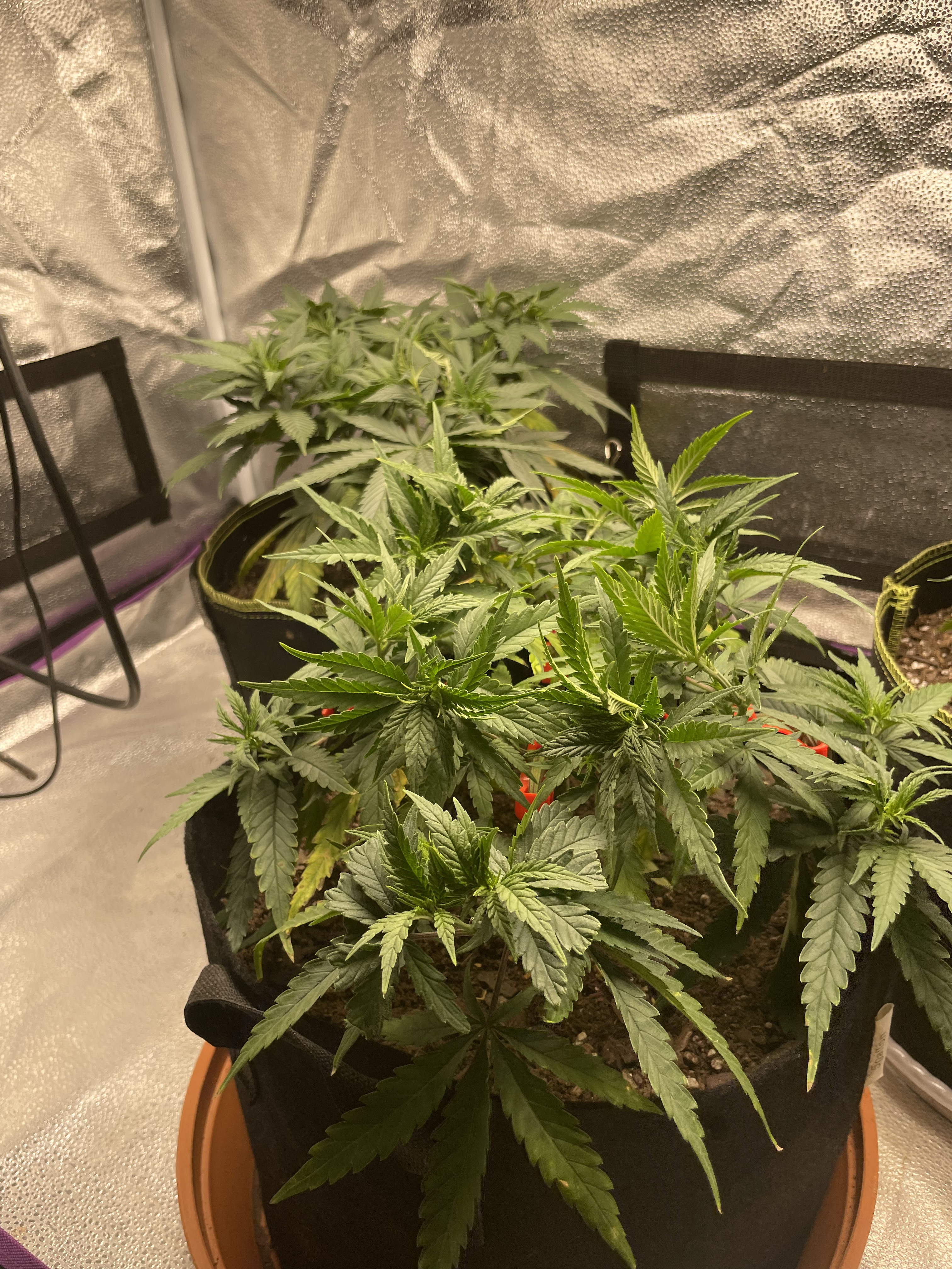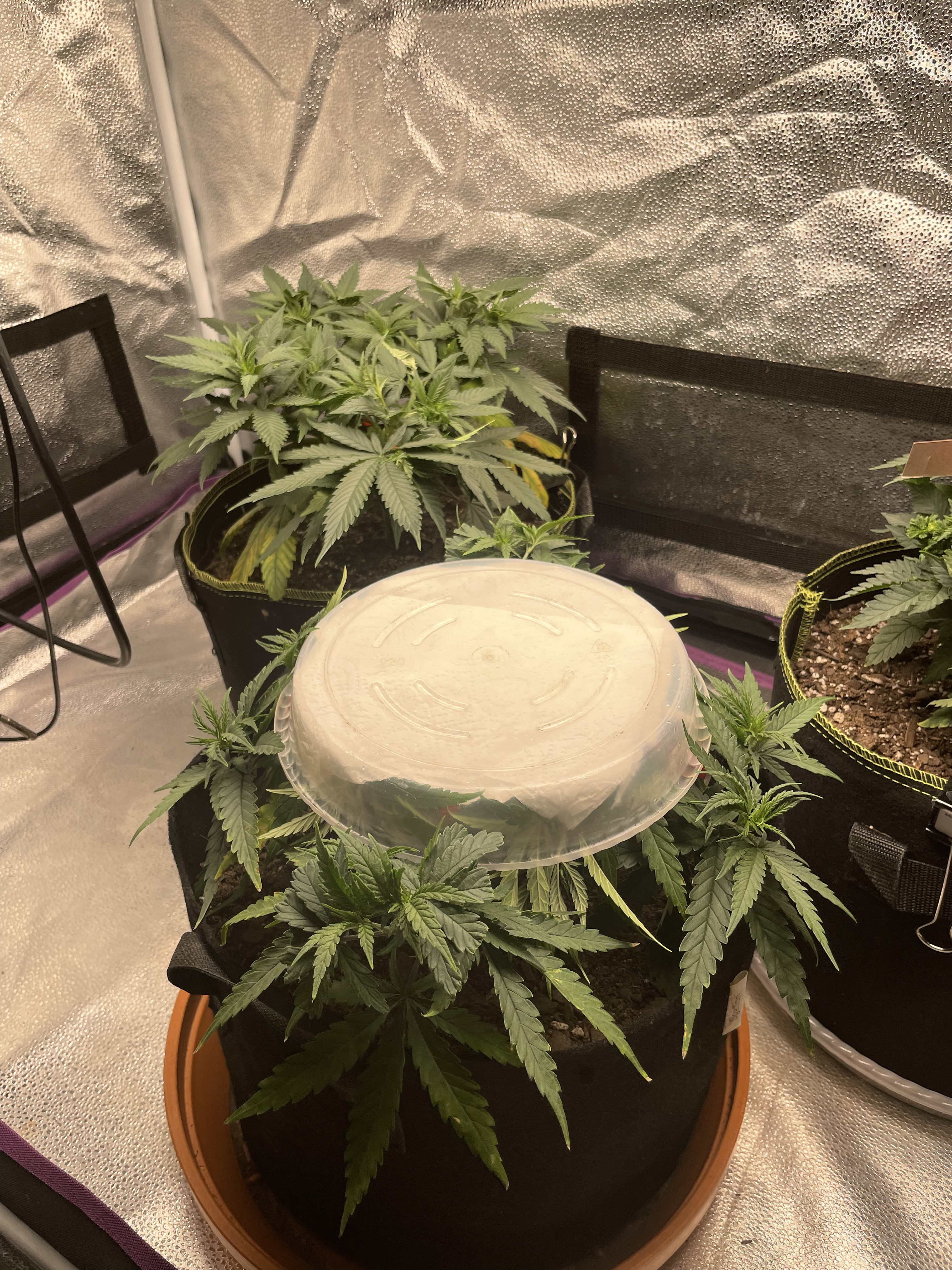 I realize that the next paragraph is confusing and prob hard to follow so apologies in advance… now, after topping and creating 4 mains (looks like a “+” directly from above,) i left the 1st and 3rd node on each of the 4 mains, rather than get rid of the 1st node, like I do sometimes, I left them… I topped all 4 of the mains… 2 of the mains I let 1 more node grow and then topped it (node 4) leaving nodes 3 and 4 to create 4 colas at the end of those 2 mains… the other 2 mains, I just topped at node 3… so that two of the mains produce 2 colas each and the other 2 mains have 4 colas each…. So, not counting the center shoots from the first node of each main, the plant should produce 12 colas… then, with the first node left to grow on each main (2 additional colas each,) there should be 20 colas in total on the plant during flower. If you are still somehow miraculously following along… I’ve been using these plastic LST things that create right angles (they work awesome btw… better than tying the branches down… although I still find a need to tie down in conjunction w using the LST things at times, usually later on in veg.) So, the 2 shoots from the first node on each main (I’ll call these “central colas” from here on cause they are in the center of the plant, closest to the main stem) have taken off in growth compared with the shoots on the end of the mains that I topped (or double-topped.) I’d like for all of the 20 main colas to be growing at a similar pace… normally I would tie down these central colas or even top them, but I don’t want the additional colas from topping and I don’t want additional growth from the lower growth tips if I tie them down… I’ve look EVERYWHERE online to find something about stunting growth… naturally all of the research is done around increasing growth… I’ve on occasion taken plants out of direct light to let them “slow down” a bit so that their buddies could catch up… and I could have an even canopy in the tent, but I’ve never tried shading just a few nodes or colas so that other nodes or colas can catch up… so, I figured I’d give it a try… I pushed the central colas from the first node of each main (8 in total— 2 on each main) down and then put a pot saucer w a napkin in it to create a lid attempting to shade all 8 of the central colas until the outer colas of the mains catch up in growth. I’ll update later to share the results… I also made this post so that hopefully someone could comment and let me know if they have access to any research around restricting growth on part of a plant during veg (or even on a whole plant for that matter…) any/all comments welcome…