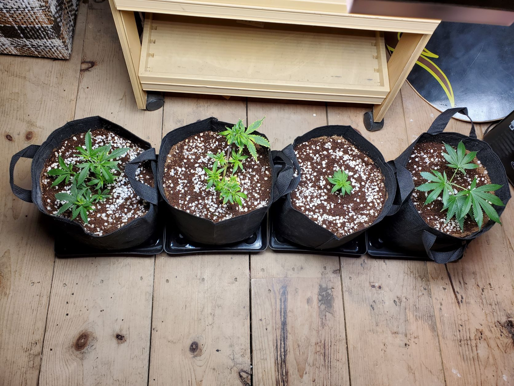 4x4 tent, Platinum LED P4-XML2, four Patio Pickers. Vegging Super Lemon Haze, Durban Poison and two Tangie x Blueberry crosses.