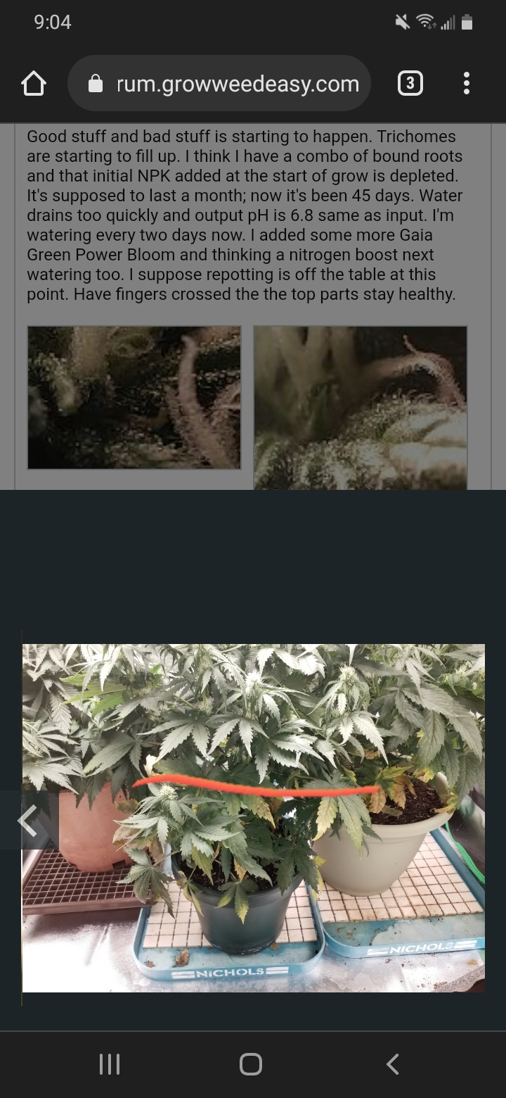 Good stuff and bad stuff is starting to happen. Trichomes are starting to fill up. I think I have a combo of bound roots and that initial NPK added at the start of grow is depleted. It's supposed to last a month; now it's been 45 days. Water drains too quickly and output pH is 6.8 same as input. I'm watering every two days now. I added some more Gaia Green Power Bloom and thinking a nitrogen boost next watering too. I suppose repotting is off the table at this point. Have fingers crossed the the top parts stay healthy.