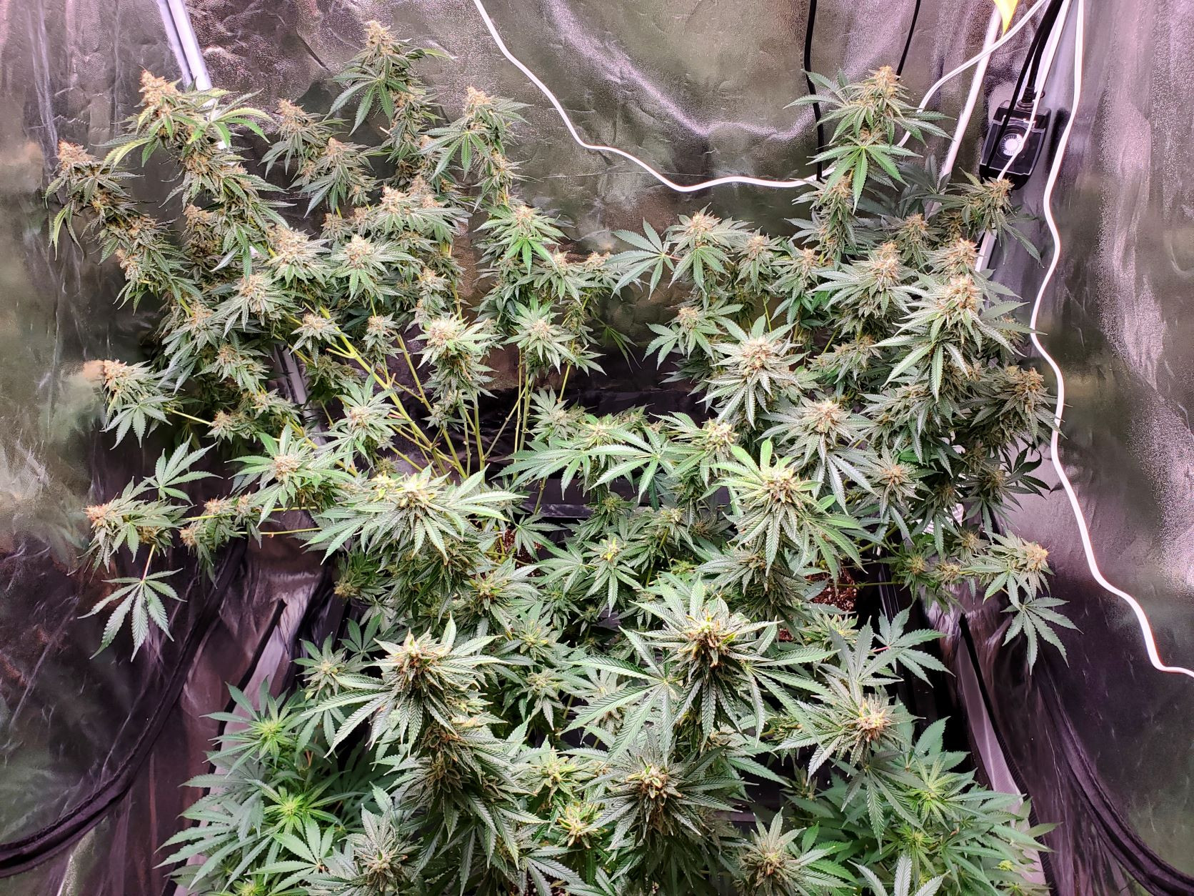 Seed clone and experimental clones. I was hoping n dreaming that the experimentals (rear) would be ready to chop by now. Trichs are cloudy, a few sparse amber here n there, they just don't look finished. They are starting to produce last minute pistils but no fade on the leaves. They are starting to get top heavy and will need support soon. The light is under powered as this is all that is available now. Maybe next week.