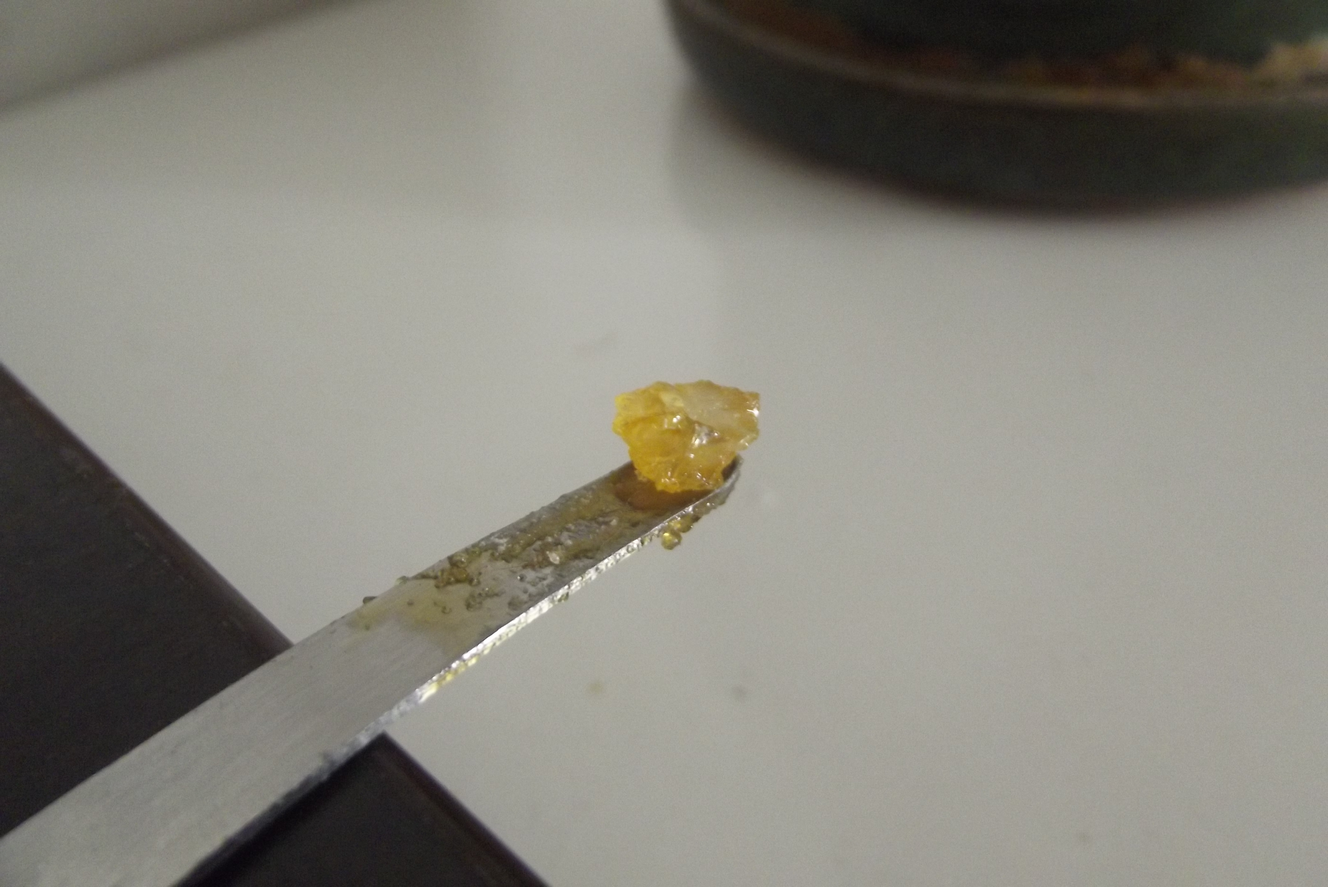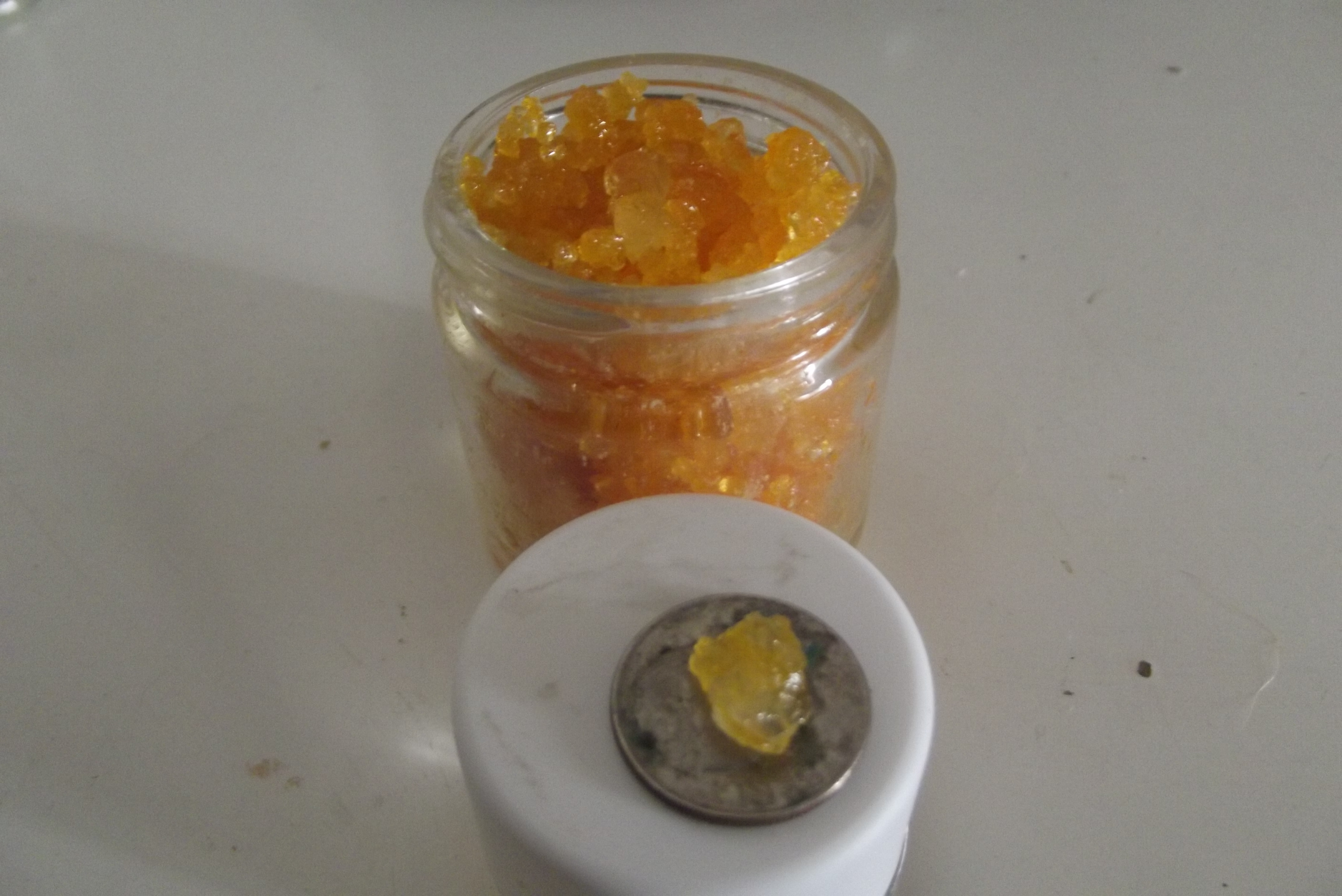 $240 ounces of huge, lightly terped, 99% THC crystals. This turned into 5 hits. My usual dose is that spoon, leveled. A drop. 1/64 tsp. Which was also in the dab. 75% cured resin from the new dispensary down the road. Neat place. They had WPM on some of their clones and I told the woman who was helping me. Real sweetly, she told me she has never seen the shelf of clones because she was too short.