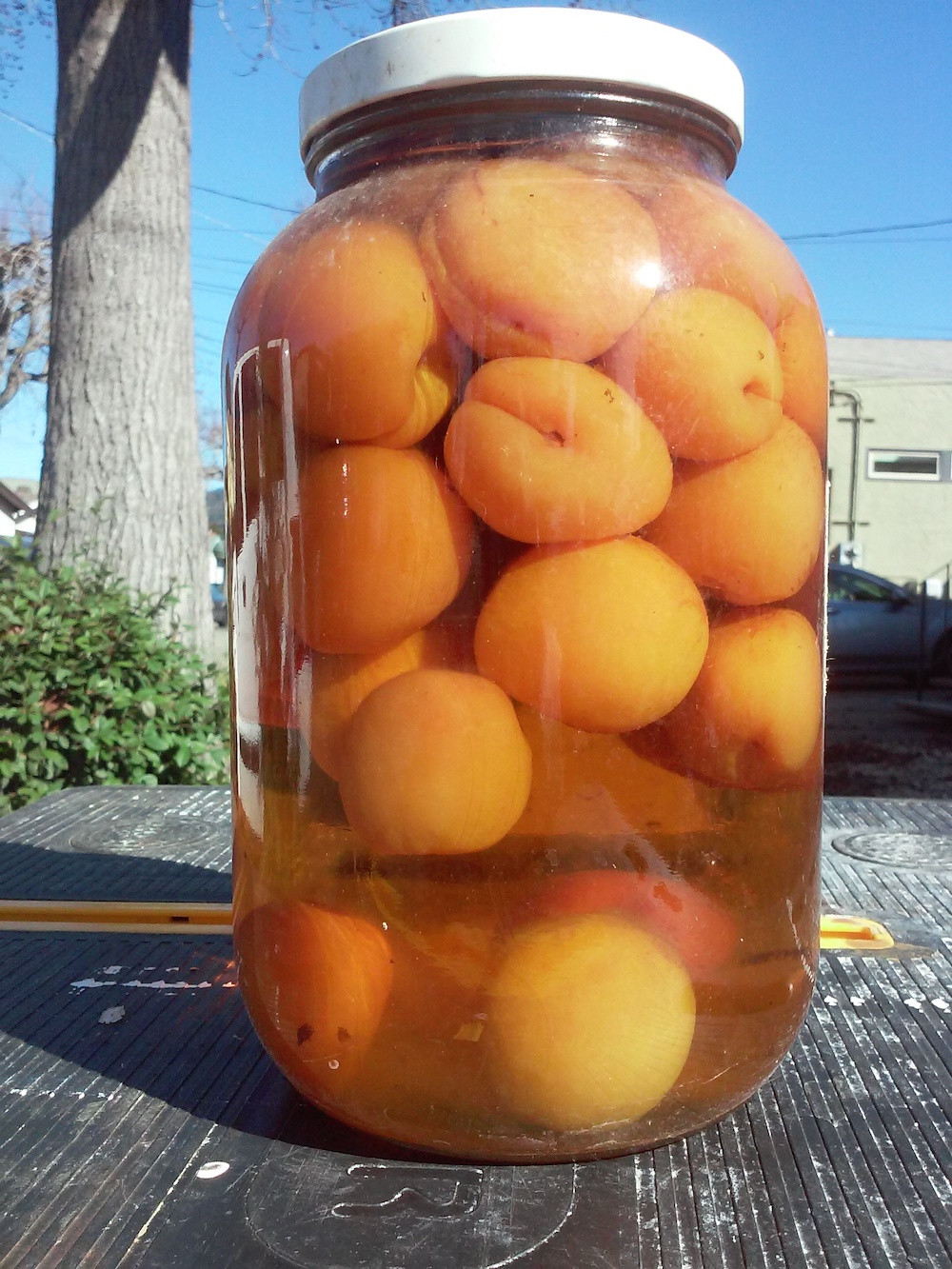 In a clean 1 gallon jar, place 3 cups of white sugar. Then carefully load the jar with ripe apricots, taking care not to crush any but also filling the jar as full as you can. If you can get them, I suggest the Blenheim variety. Difficult to find and with a short season, they are by far the best tasting apricot I have ever had. They are the apricot of my childhood, and if you're old enough, of your childhood too. Can't find 'em? Pattersons are my next choice.