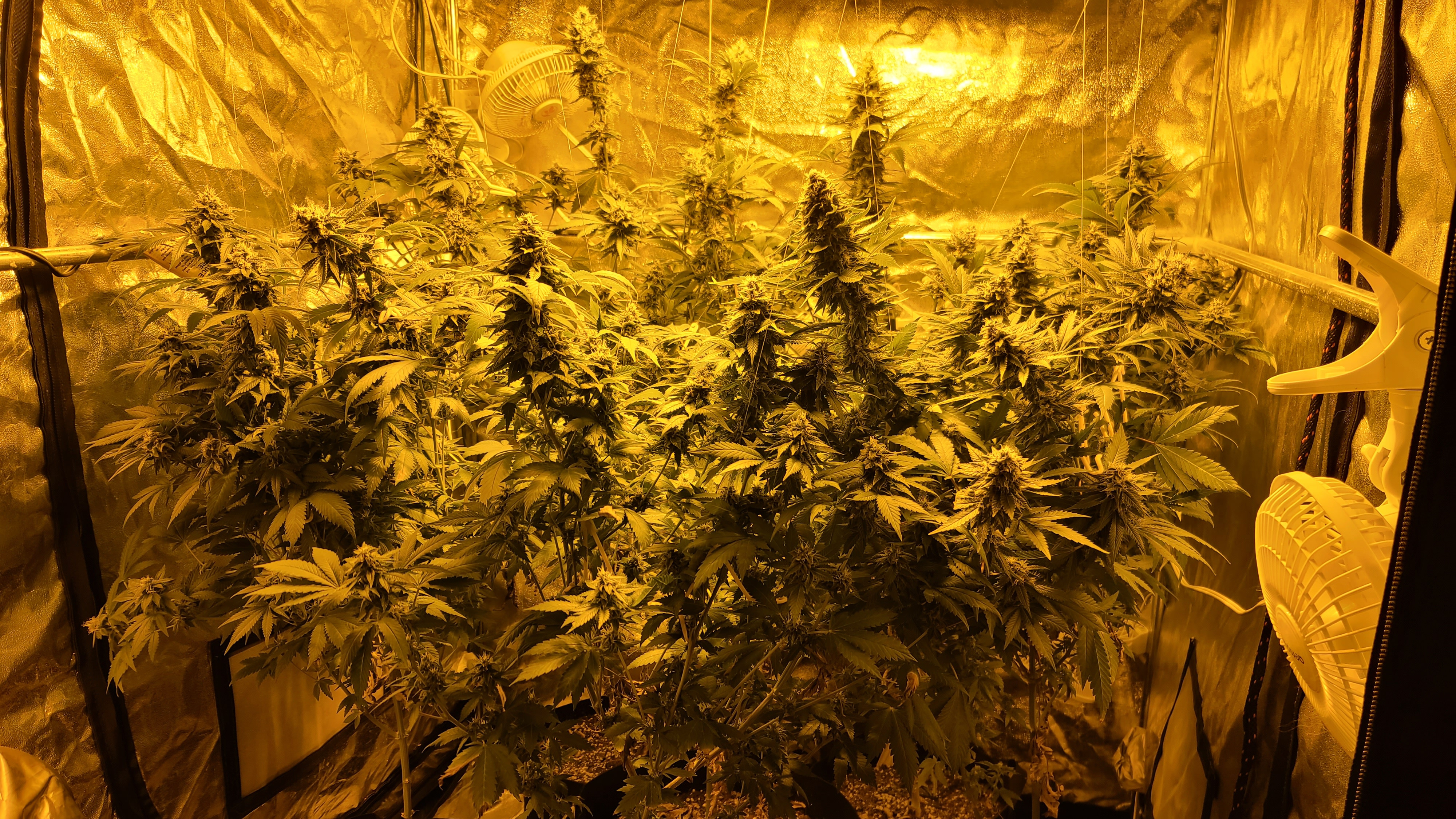 Been an interesting grow. Work and life were major distractions. I broke basic growers rules (knowing pH, correct watering habits, periodic defole, etc.. ) BUT these damn weeds took it all and just kept growing. Veg was a nightmare. Leaf sickness. Overheated tent (99 Fahrenheit + ). Humidifier died. I let them get too tall for my tent. I did not build the manifold or LST in a way to give me a reasonably low maintenance grow. So ... I had to get into some serious stress training (for the first time and much of the stress was on me) and do some super cropping.