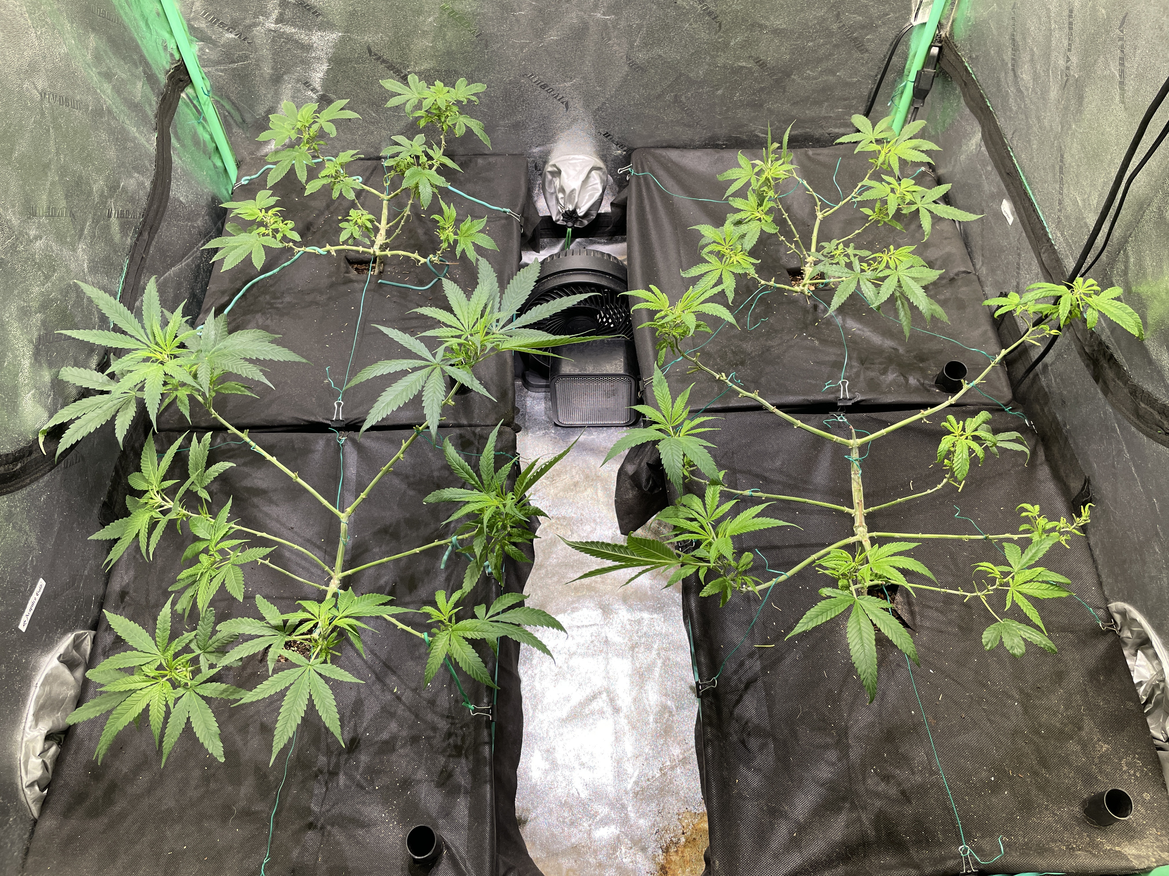 I got more tying down done this weekend and may put up the first scrog net in Coconut Grove. Here's a look: