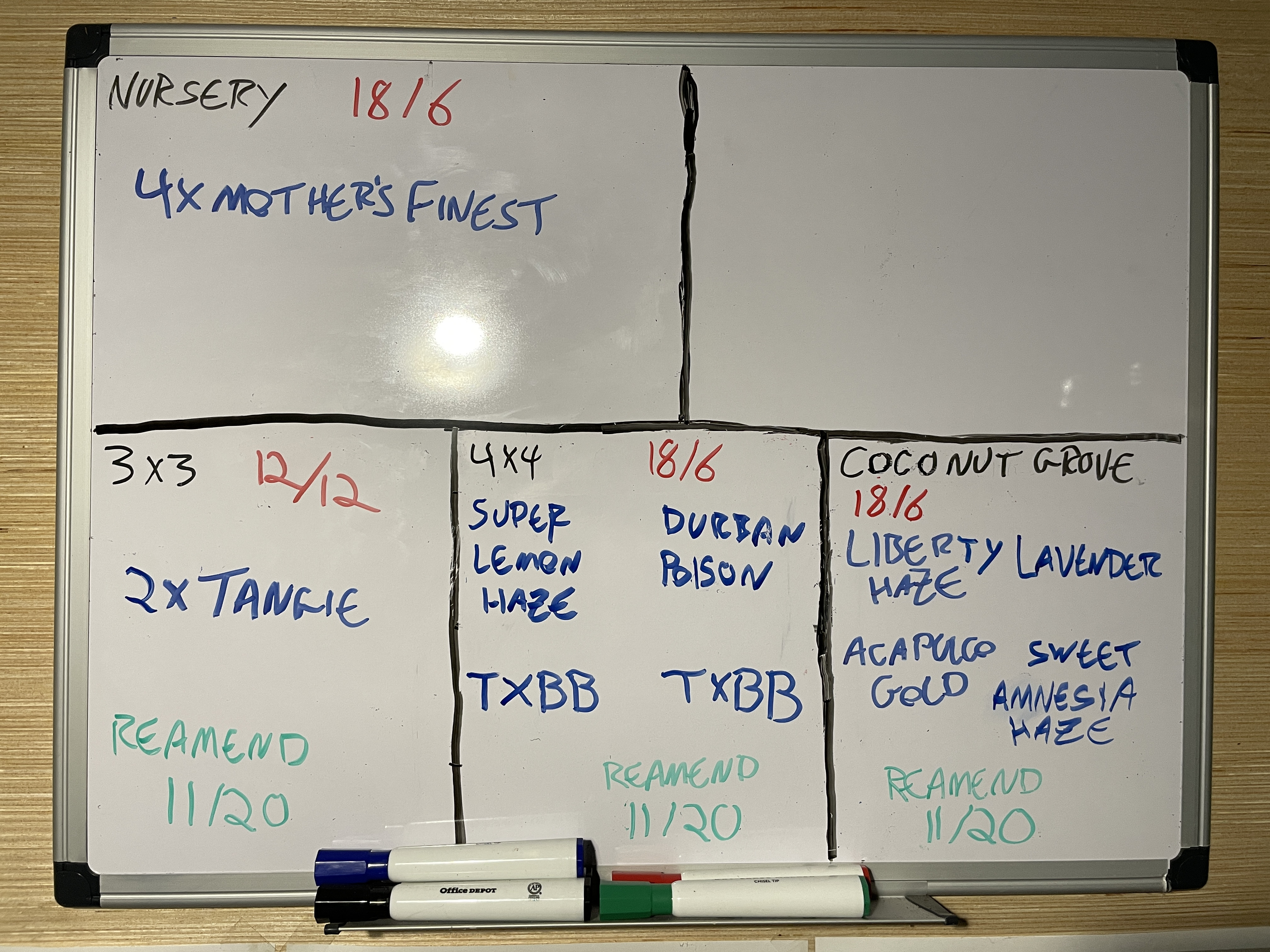 The canopy in Coconut Grove is filling out! The flower tent isn't far behind but needs at least another two weeks before flip. I've already changed CG from 18/6 to 16/8 and they are already stretching a bit after two days. Tangie is starting to smell and Mother's Finest is about ready for some topping.