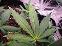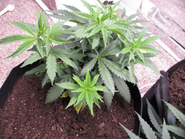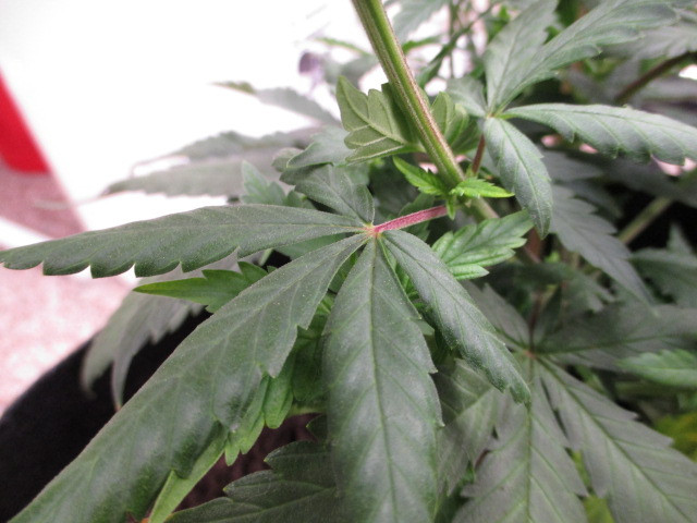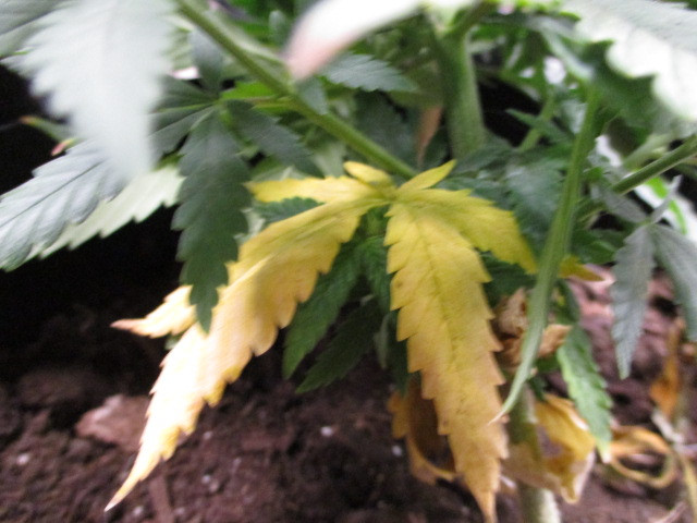 I got yellowing in between the veins of my plants, mostly on the lower leaves. GWE says this can be due to one of six different issues, magnesium deficiency seems the most likely culprit. Reasons are because I've got red stems in addition to the yellowing on my lower leaves (this could be due to genetics, as my plant does sprout purple leaves in flower). Plants are grown in 5 gallon grow bags of the PROMIX herb & vegetable mix, I used PROMIX's granular fertilizer (4tbsp of the 4 1/2 tbsp recommended dose) and I have watered the plants twice since transplanting on July 5 (using approximately a gallon of water until runoff). Lights WERE too close, I've moved them up a few inches, highest plant sits about 18" from the light. I have not added or done anything else to the plants. Anything else you need to know about products used or growing habits, please ask!