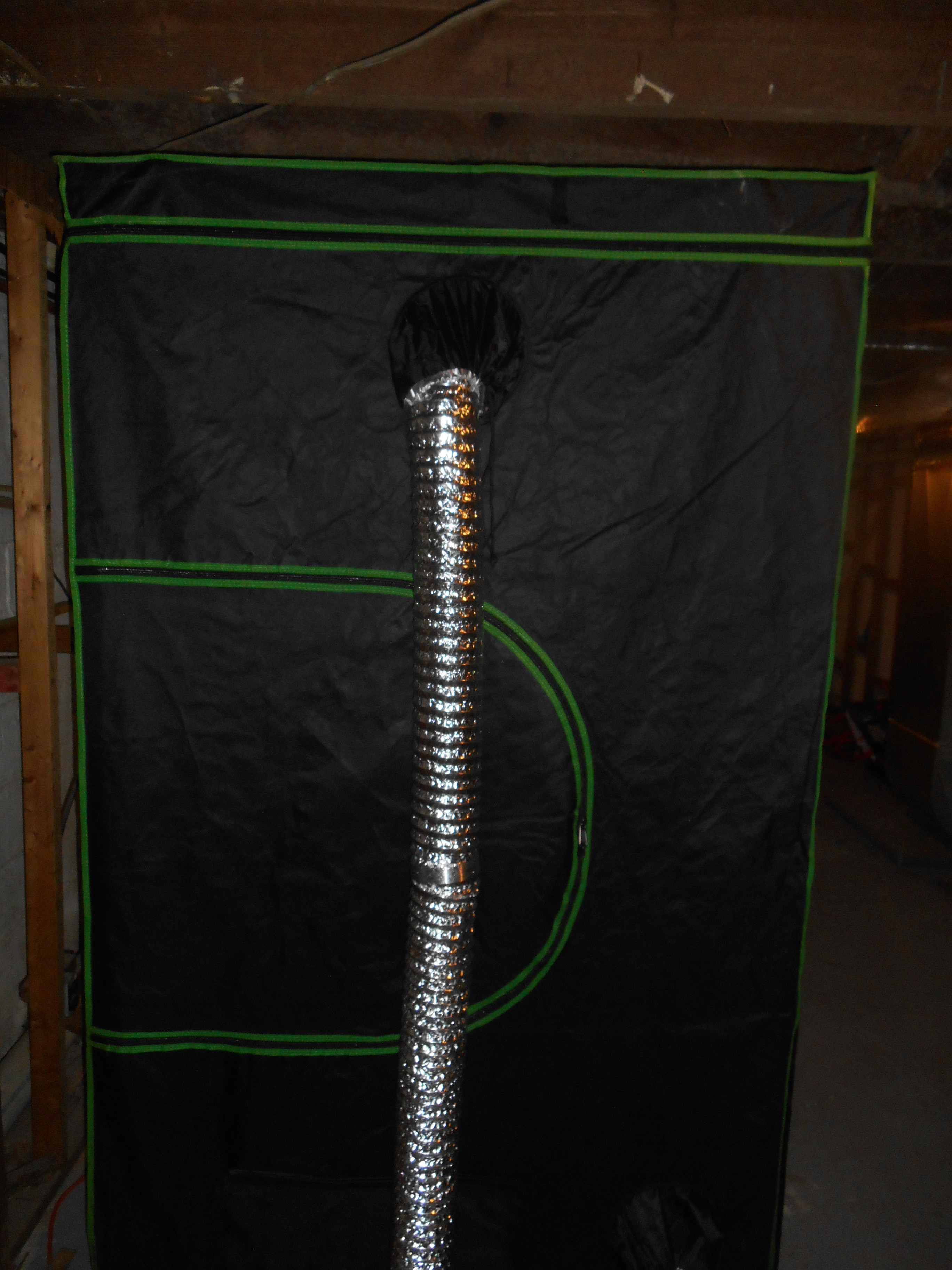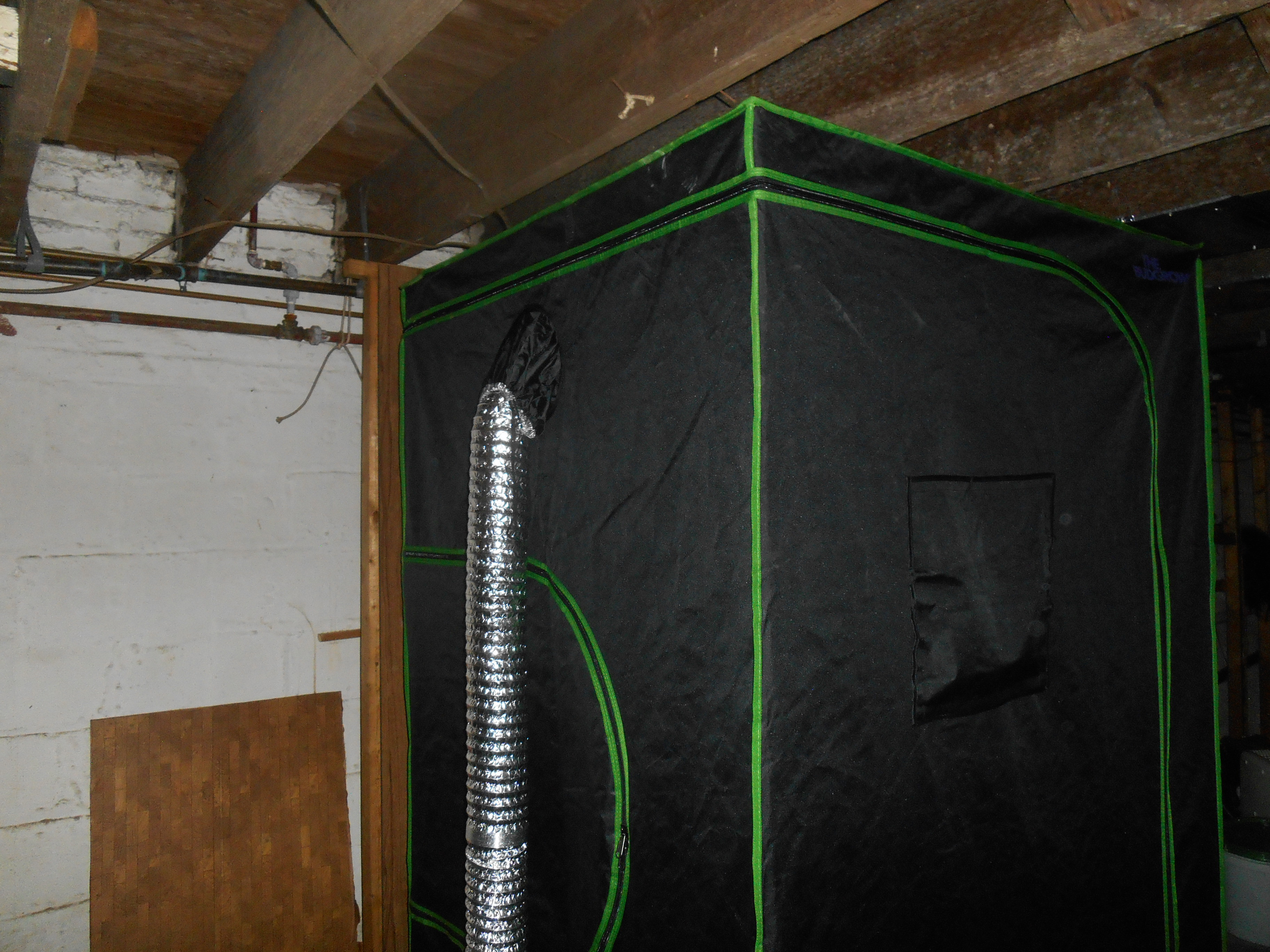 ID:	574692 Here is my venting system: Well, the blower is on the floor outside the tent, take my word for it. The end of the line is in a room under my front porch, so odor shouldn't be a problem. The tent is a Budgrow and I am very satisfied with it as it is very sturdy and as you can see there is not much room above