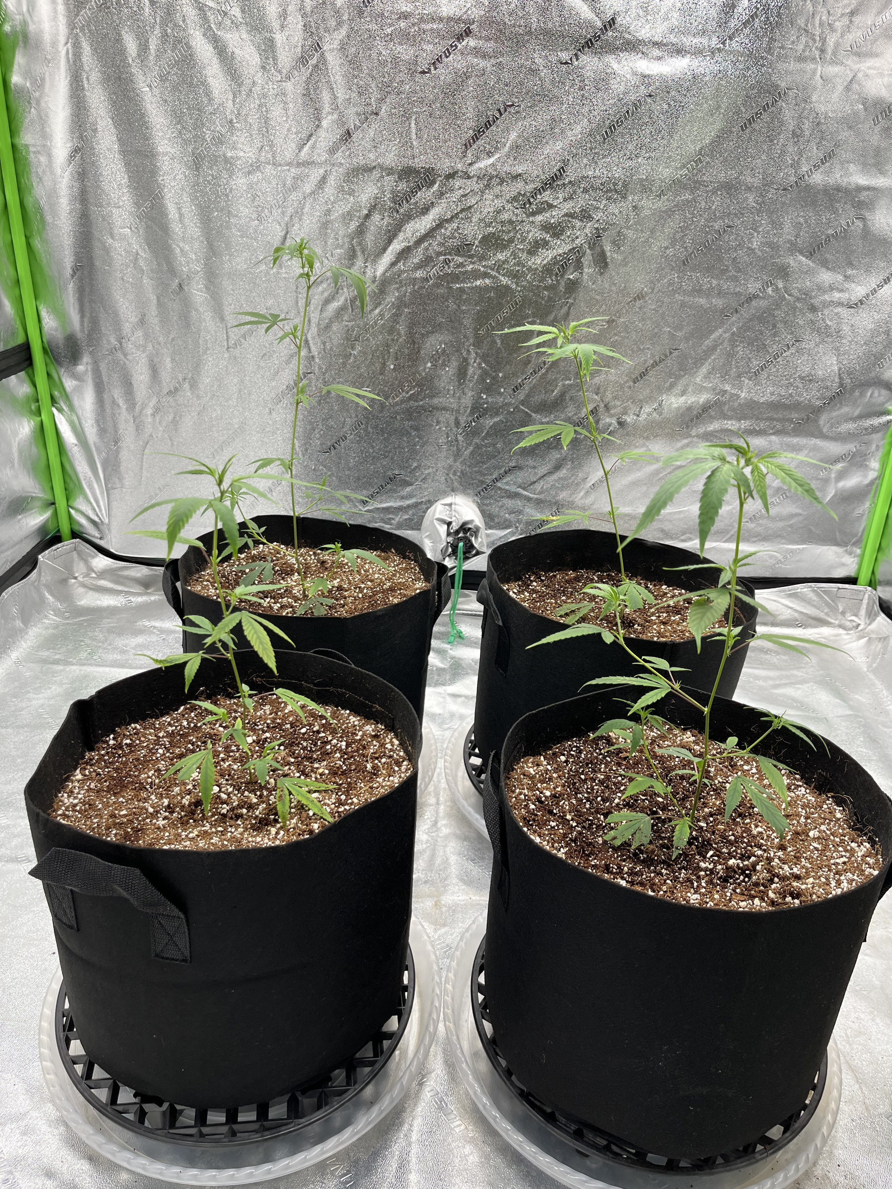 Here they are as of today - 5 days after moving into the coco/perlite and fabric bags. They also got their first light taste of nutrients today and an increase on the light output. Plants are about 14" tall.