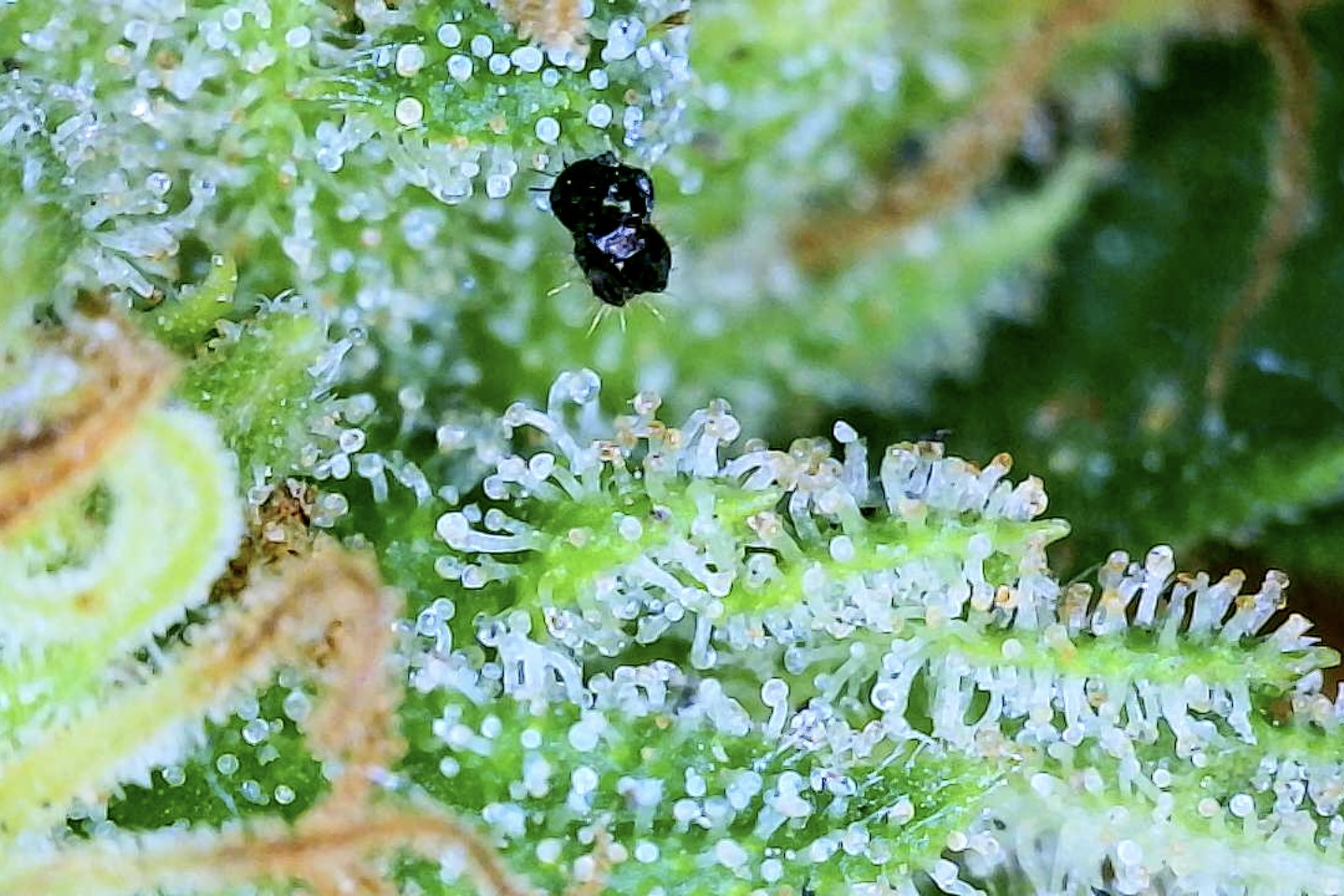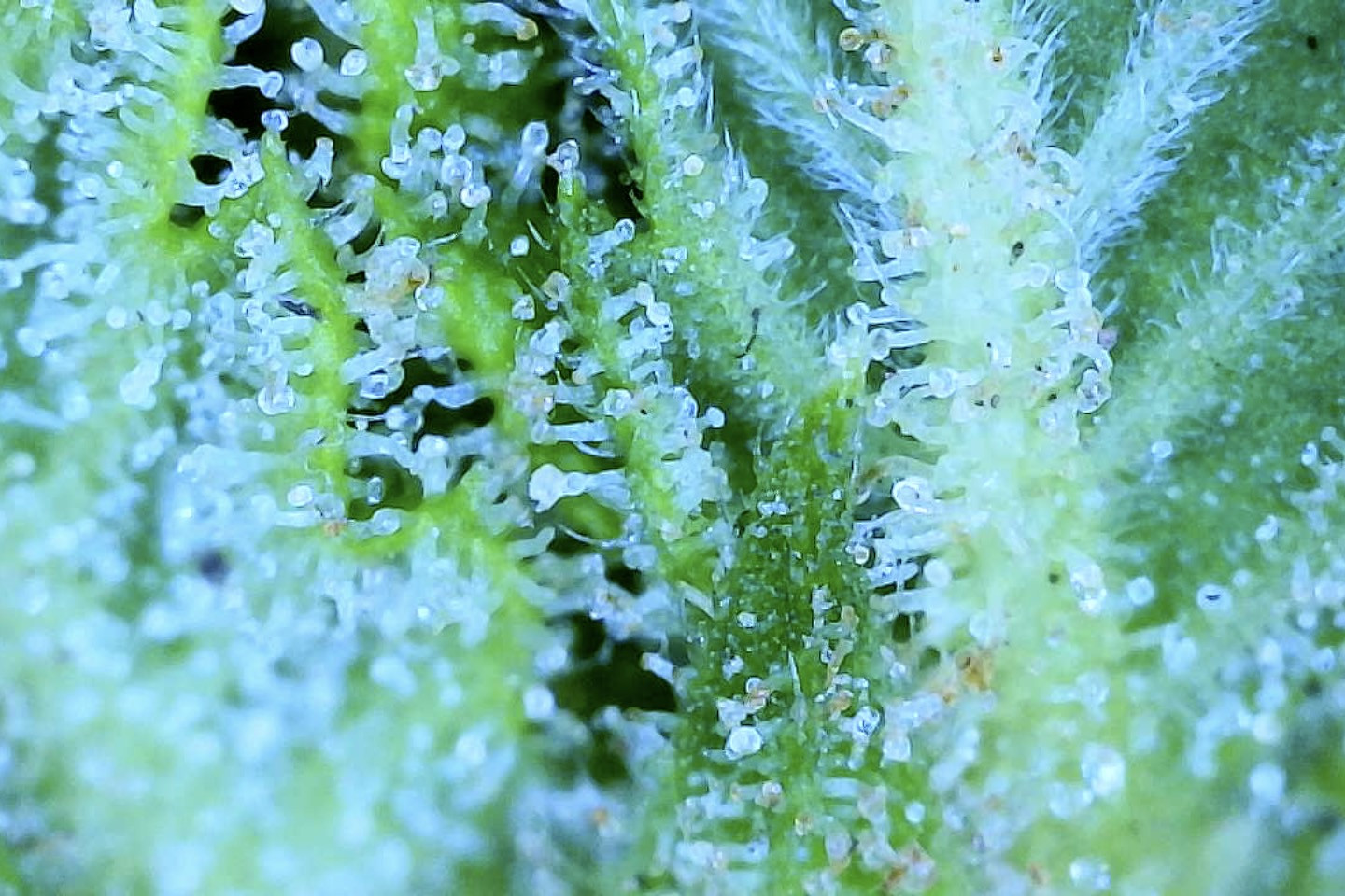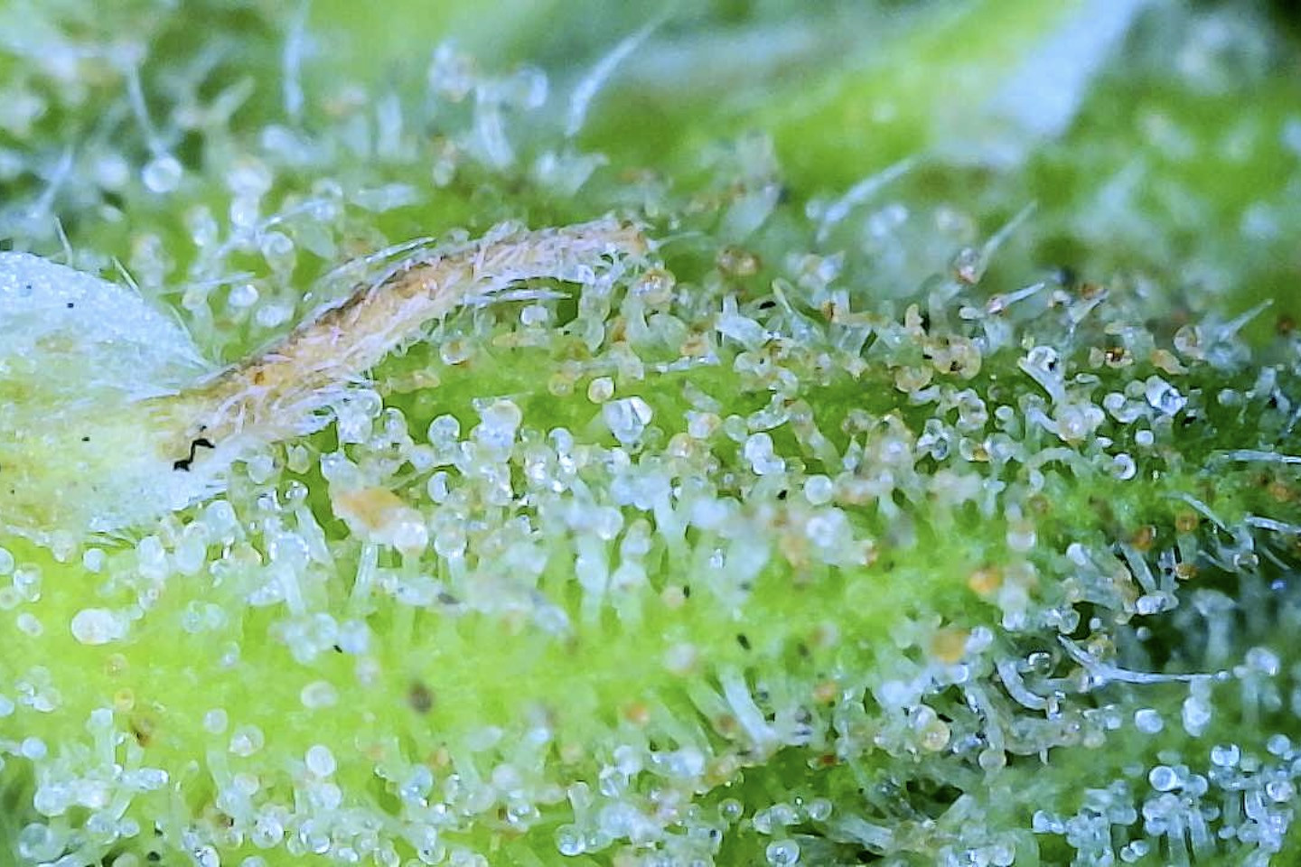 I thought the first two pictures were interesting because they are essentially the same shot, just from two slightly different angles. You can see the bloby dark thing that looks like it's got way too many legs in both pics. The interesting (and instructive) point for me is how many more amber trichomes there are in one pic than the other. The lesson for me is don't trust one set of views from one bud. Be adventurous, look the fuck around. See what's happening in the wider world of the plant.