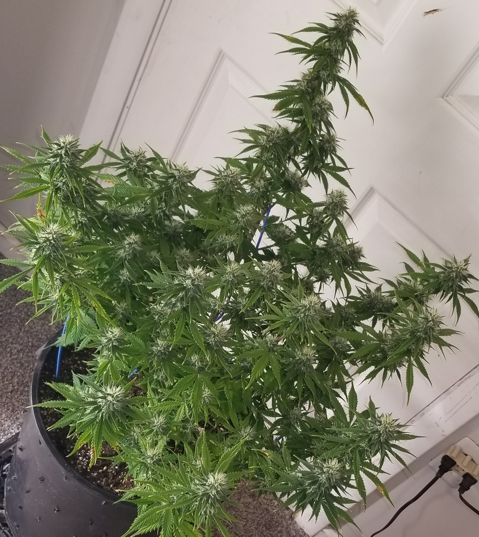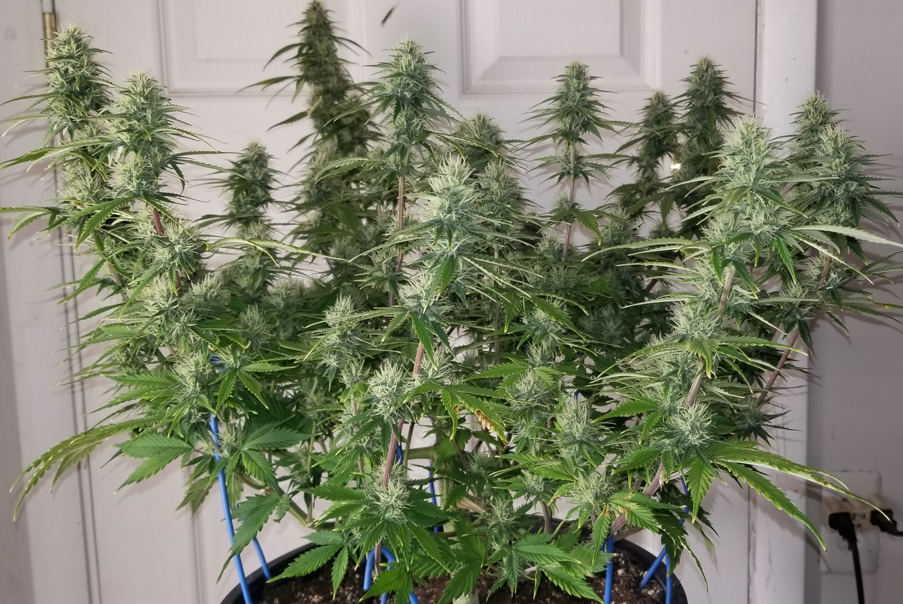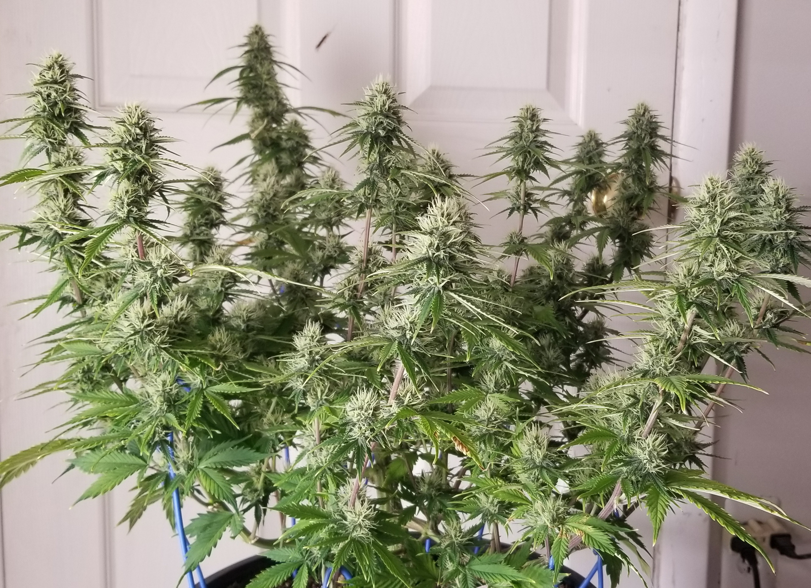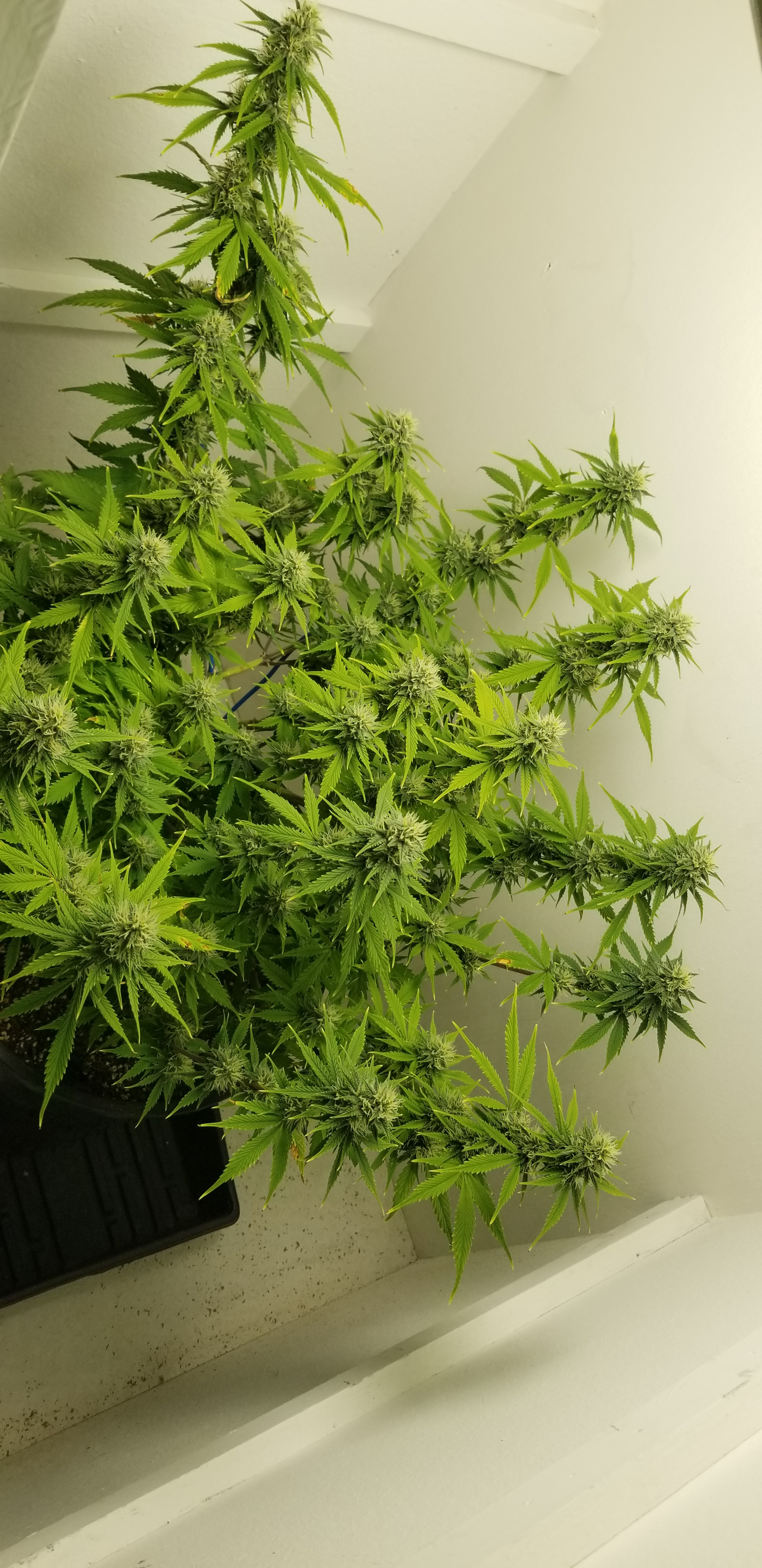 This is a Chunkadelic autoflower from Humboldt Seed Company. The poor girl suffered under CFL's in my bedroom for the first few weeks of life due to delayed renovations in my grow space. At about a foot tall she was still quite flexible. So I bent her over at 90° and tied all other branches out and down. The stretch is over and she's still only about 20" tall. As you can see, I think it's worked quite well. There is no doubt in my mind that it's yields will be far greater than if I left it alone.